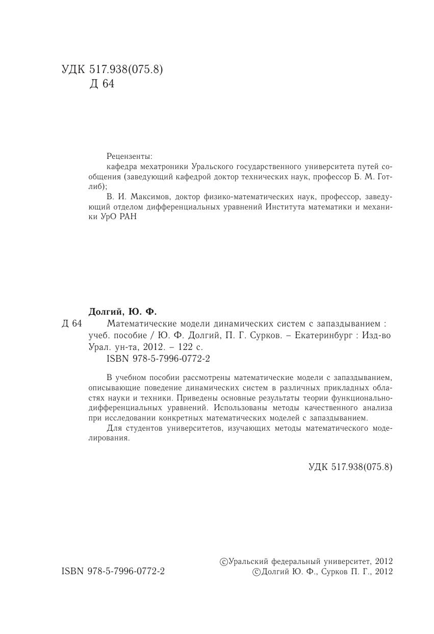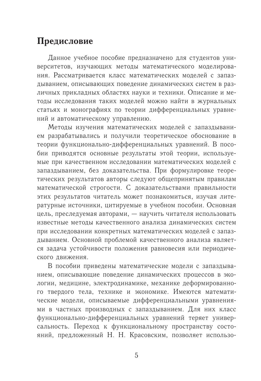 В учебном пособии рассмотрены математические модели с запаздыванием, описывающие поведение динамических систем в различных прикладных областях науки и техники. Приведены основные результаты теории функциональнодифференциальных уравнений. Использованы методы качественного анализа при исследовании конкретных математических моделей с запаздыванием. Для студентов университетов, изучающих методы математического моделирования.