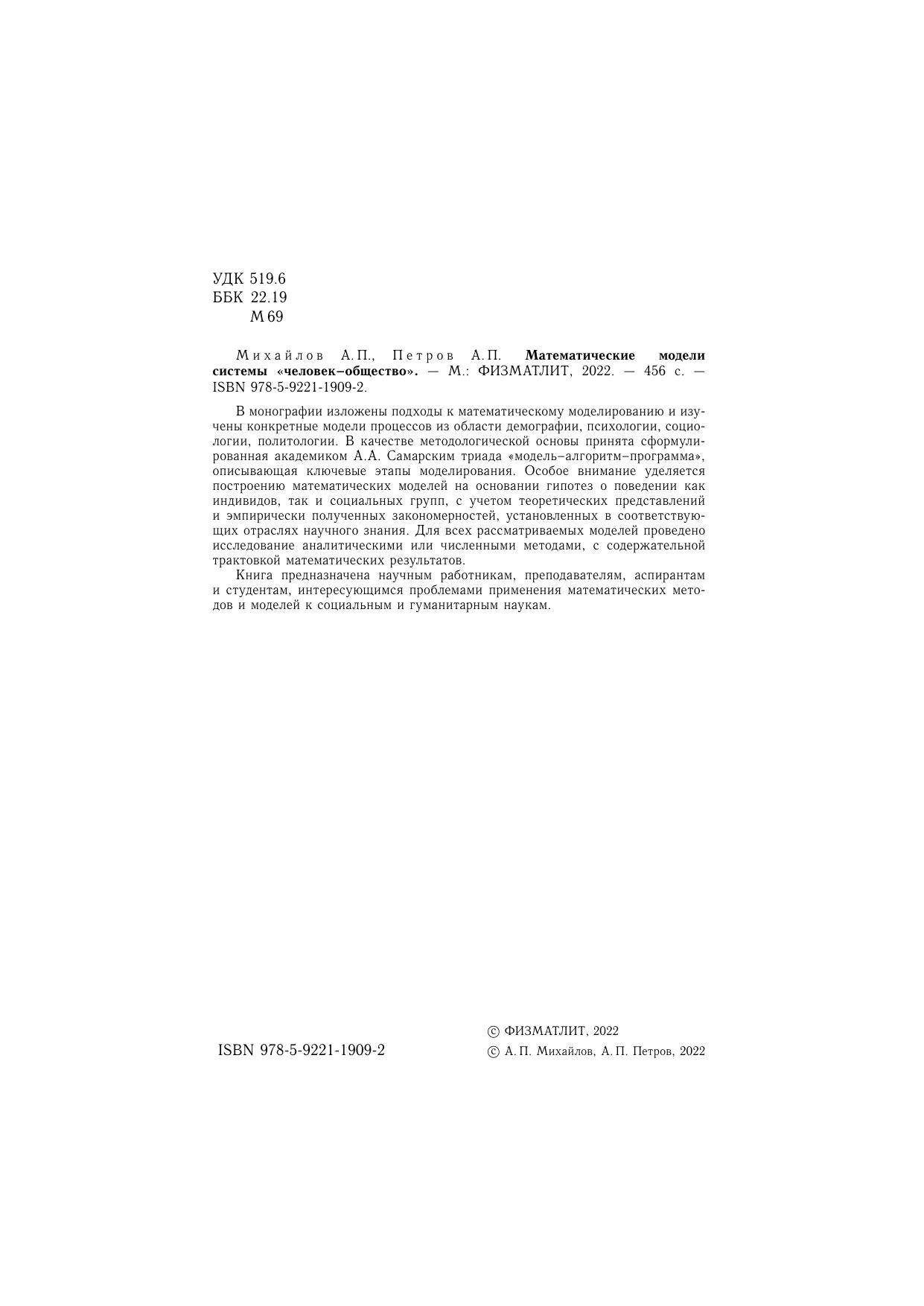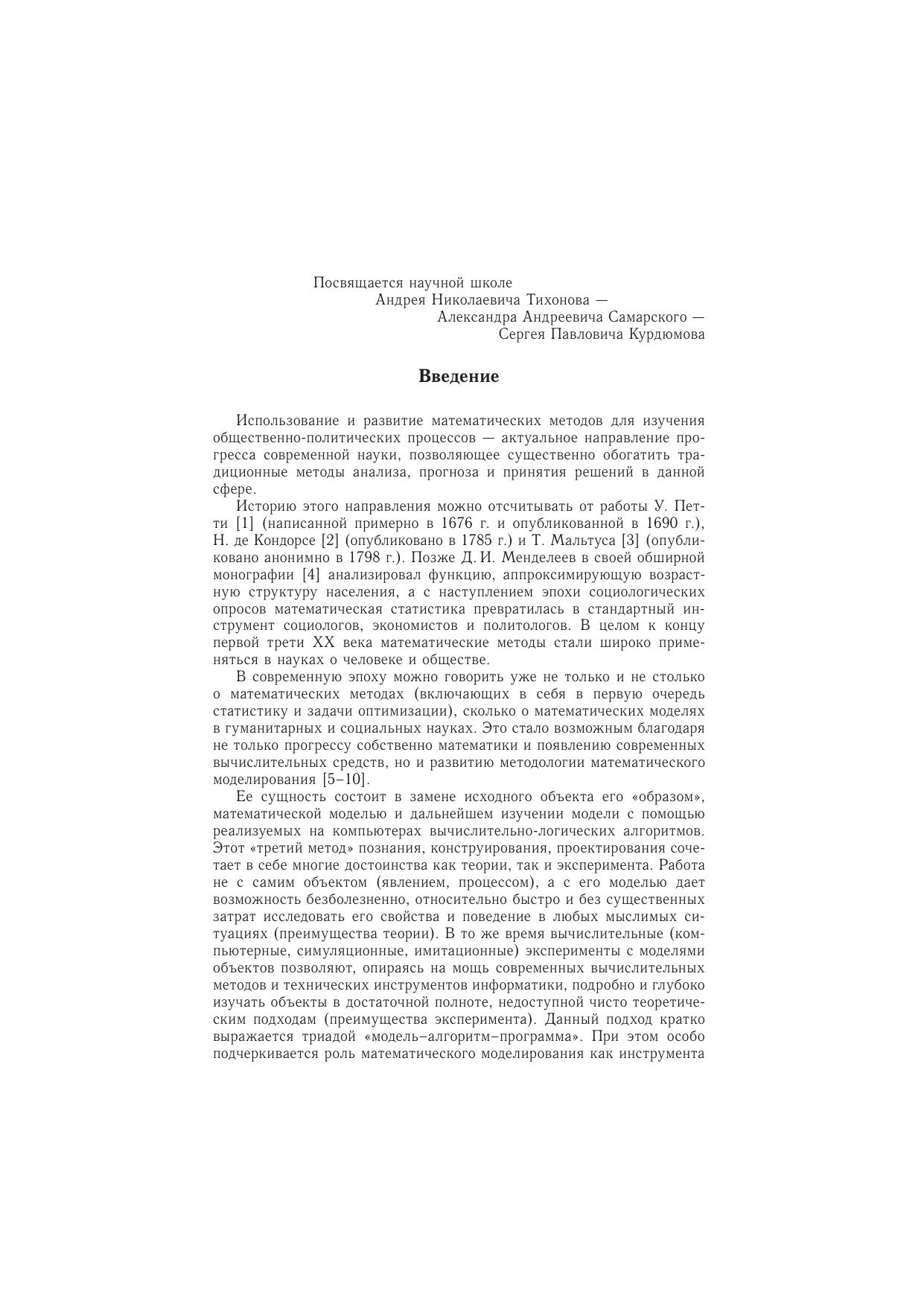 В монографии изложеныподходык математическому моделированию и изученыконкретные модели процессов из области демографии, психологии, социологии, политологии. В качестве методологической основыпринята сформулированная академиком А.А. Самарским триада «модель–алгоритм–программа», описывающая ключевые этапы моделирования. Особое внимание уделяется построению математических моделей на основании гипотез о поведении как индивидов, так и социальных групп, с учетом теоретических представлений и эмпирически полученных закономерностей, установленных в соответствующих отраслях научного знания. Для всех рассматриваемых моделей проведено исследование аналитическими или численными методами, с содержательной трактовкой математических результатов. Книга предназначена научным работникам, преподавателям, аспирантам и студентам, интересующимся проблемами применения математических методов и моделей к социальным и гуманитарным наукам.