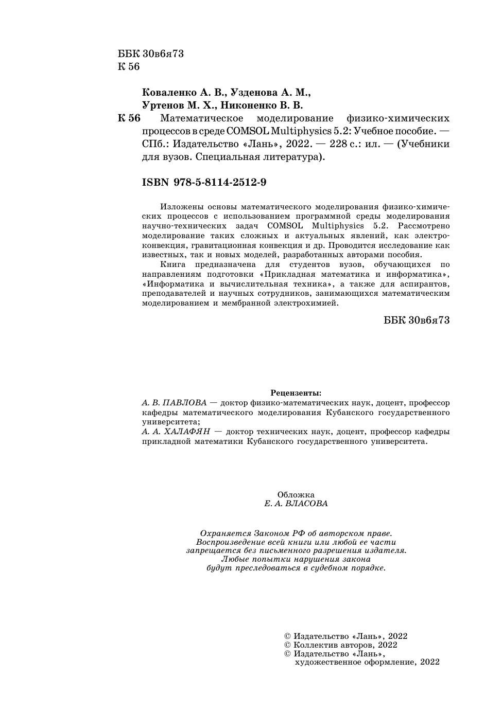Изложены основы математического моделирования физико-химических процессов с использованием программной среды моделирования научно-технических задач Comsol Multiphysics 5.2. Рассмотрено моделирование таких сложных и актуальных явлений, как электроконвекция, гравитационная конвекция и др. Проводится исследование как известных, так и новых моделей, разработанных авторами пособия. Книга предназначена для студентов вузов, обучающихся по направлениям подготовки «Прикладная математика и информатика», «Информатика и вычислительная техника», а также для аспирантов, преподавателей и научных сотрудников, занимающихся математическим моделированием и мембранной электрохимией.