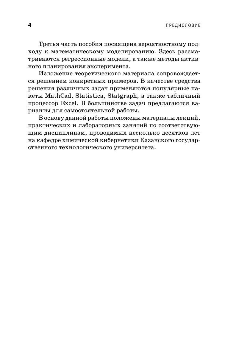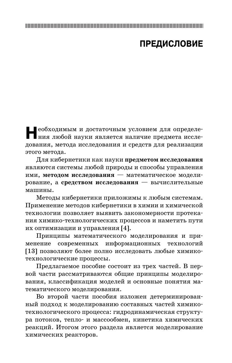 Изложены основные подходы к построению математических моделей и этапы математического моделирования. Подробно рассмотрены математические модели структуры потоков в химических аппаратах, тепло- и массообмена, а также кинетики химических реакций. В качестве примера приведено построение моделей химического реактора. Изложен вероятностный подход к математическому моделированию, рассмотрены различные уравнения регрессии, а также методы планирования эксперимента. Большинство теоретических вопросов сопровождается решением конкретных примеров с использованием современных средств. Предназначено для студентов технологических специальностей, может быть полезно аспирантам и преподавателям.