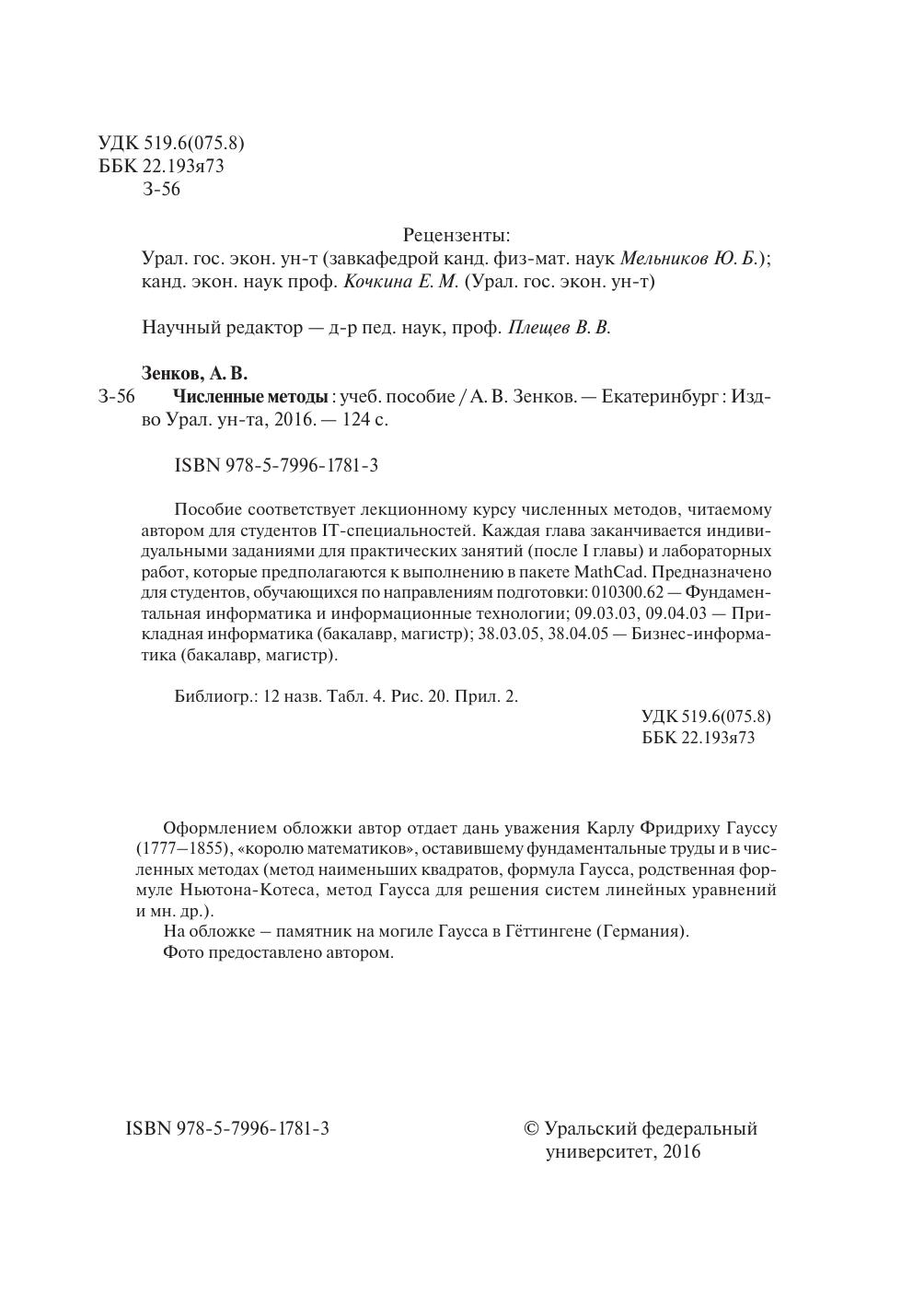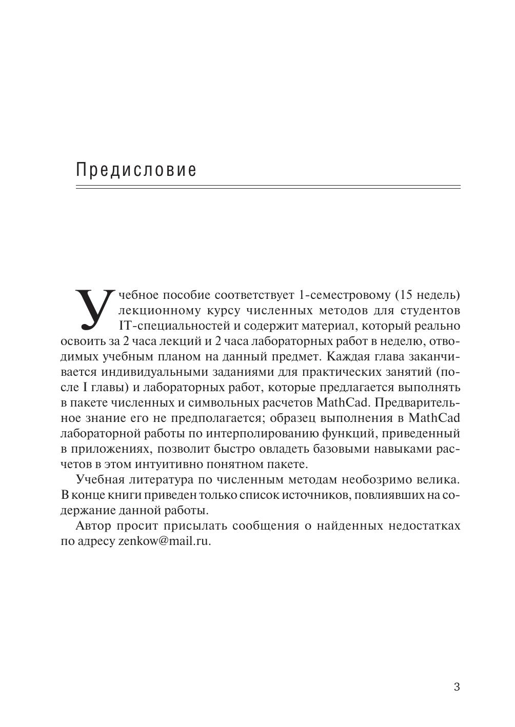 Пособие соответствует лекционному курсу численных методов, читаемому автором для студентов IT-специальностей. Каждая глава заканчивается индивидуальными заданиями для практических занятий (после I главы) и лабораторных работ, которые предполагаются к выполнению в пакете MathCad. Предназначено для студентов, обучающихся по направлениям подготовки: 010300.62 — Фундаментальная информатика и информационные технологии; 09.03.03, 09.04.03 — Прикладная информатика (бакалавр, магистр); 38.03.05, 38.04.05 — Бизнес-информатика (бакалавр, магистр).