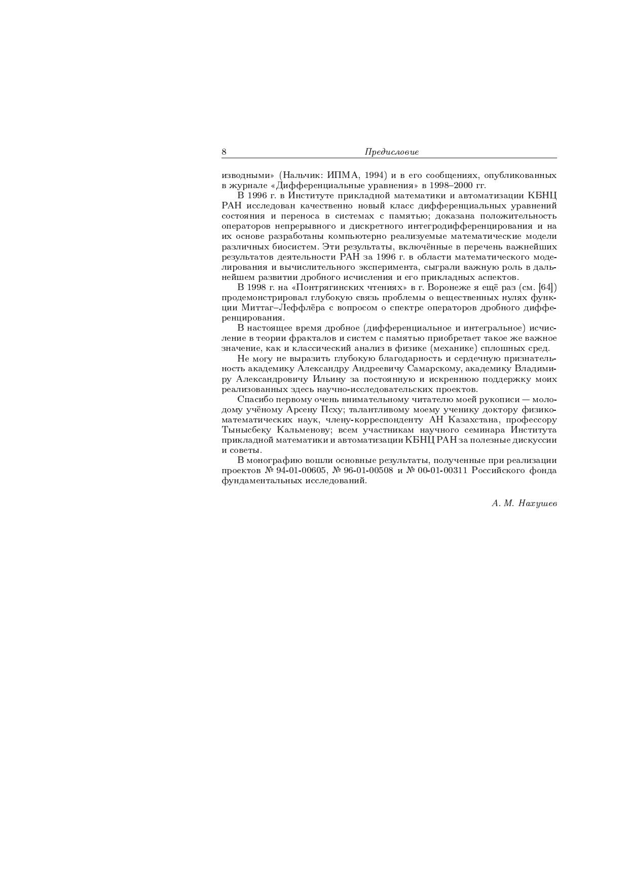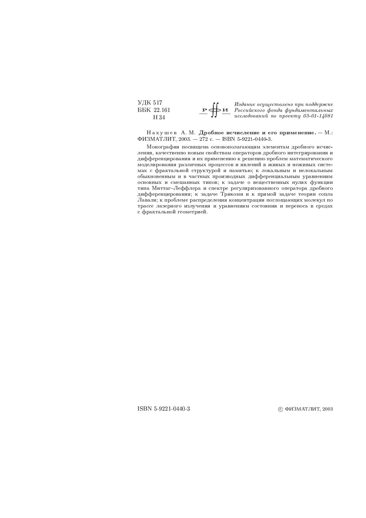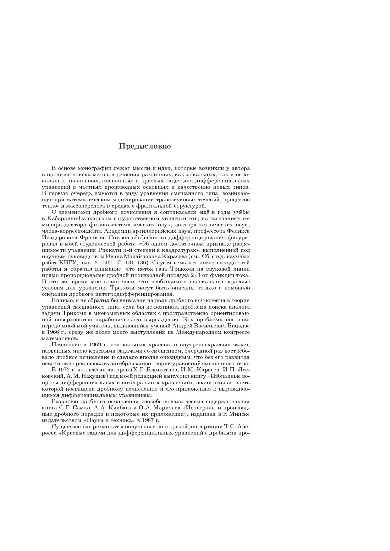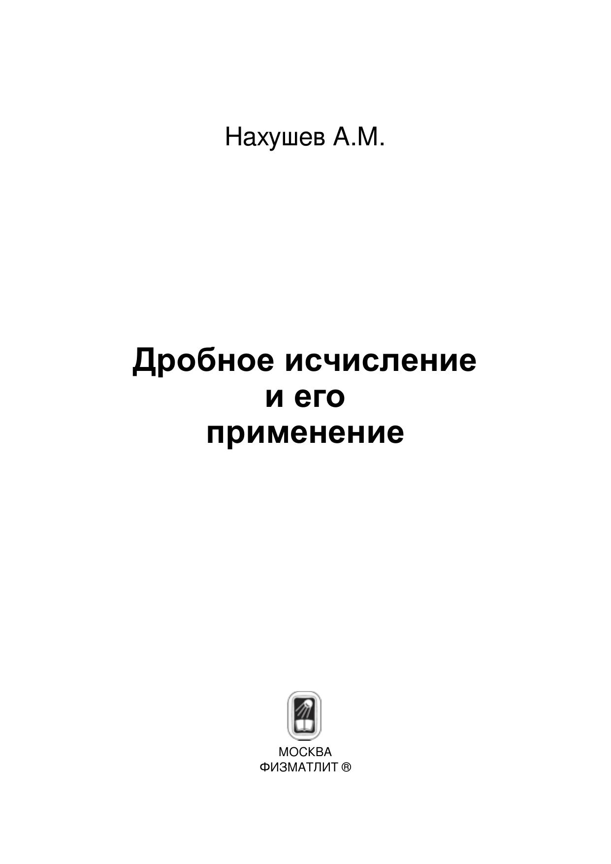 Монография посвящена основополагающим элементам дробного исчисления, качественно новым свойствам операторов дробного интегрирования и дифференцирования и их применению к решению проблем математического моделирования различных процессов и явлений в живых и неживых системах с фрактальной структурой и памятью к локальным и нелокальным обыкновенным и в частных производных дифференциальным уравнениям основных и смешанных типов к задаче о вещественных нулях функции типа Миттаг-Леффлера и спектре регуляризованного оператора дробного дифференцирования к задаче Трикоми и к прямой задаче теории сопла Лаваля к проблеме распределения концентрации поглощающих молекул по трассе лазерного излучения и уравнениям состояния и переноса в средах с фрактальной геометрией