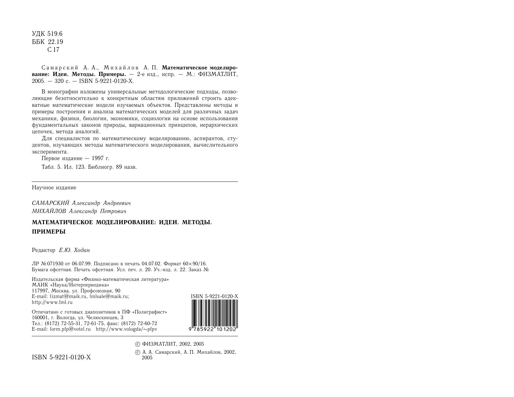 В монографии изложены универсальные методологические подходы, позволяющие безотносительно к конкретным областям приложений строить адекватные математические модели изучаемых объектов. Представлены методы и примеры построения и анализа математических моделей для различных задач механики, физики, биологии, экономики, социологии на основе использования фундаментальных законов природы, вариационных принципов, иерархических цепочек, метода аналогий. Для специалистов по математическому моделированию, аспирантов, студентов, изучающих методы математического моделирования, вычислительного эксперимента. Первое издание — 1997 г. Табл. 5. Ил. 123. Библиогр. 89 назв.