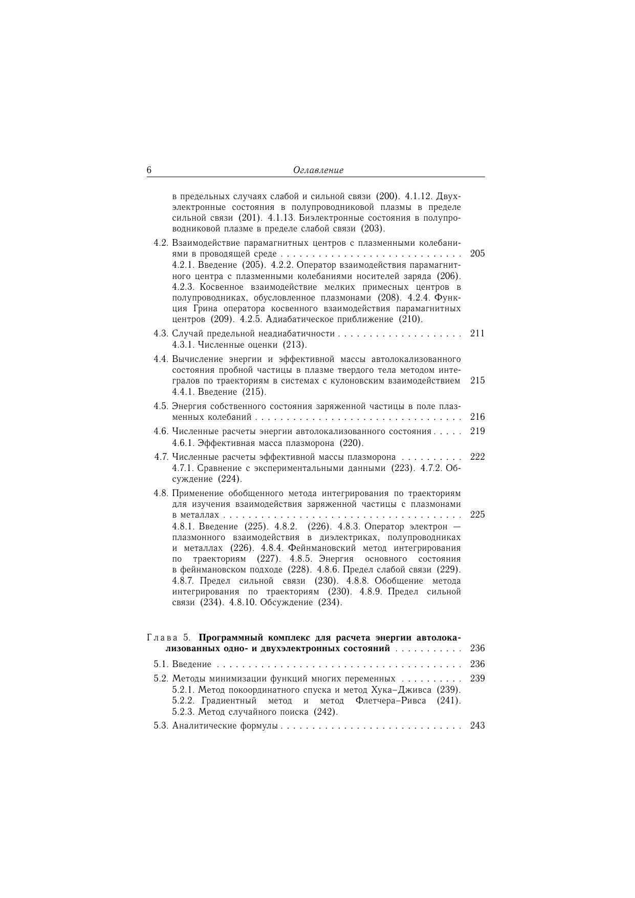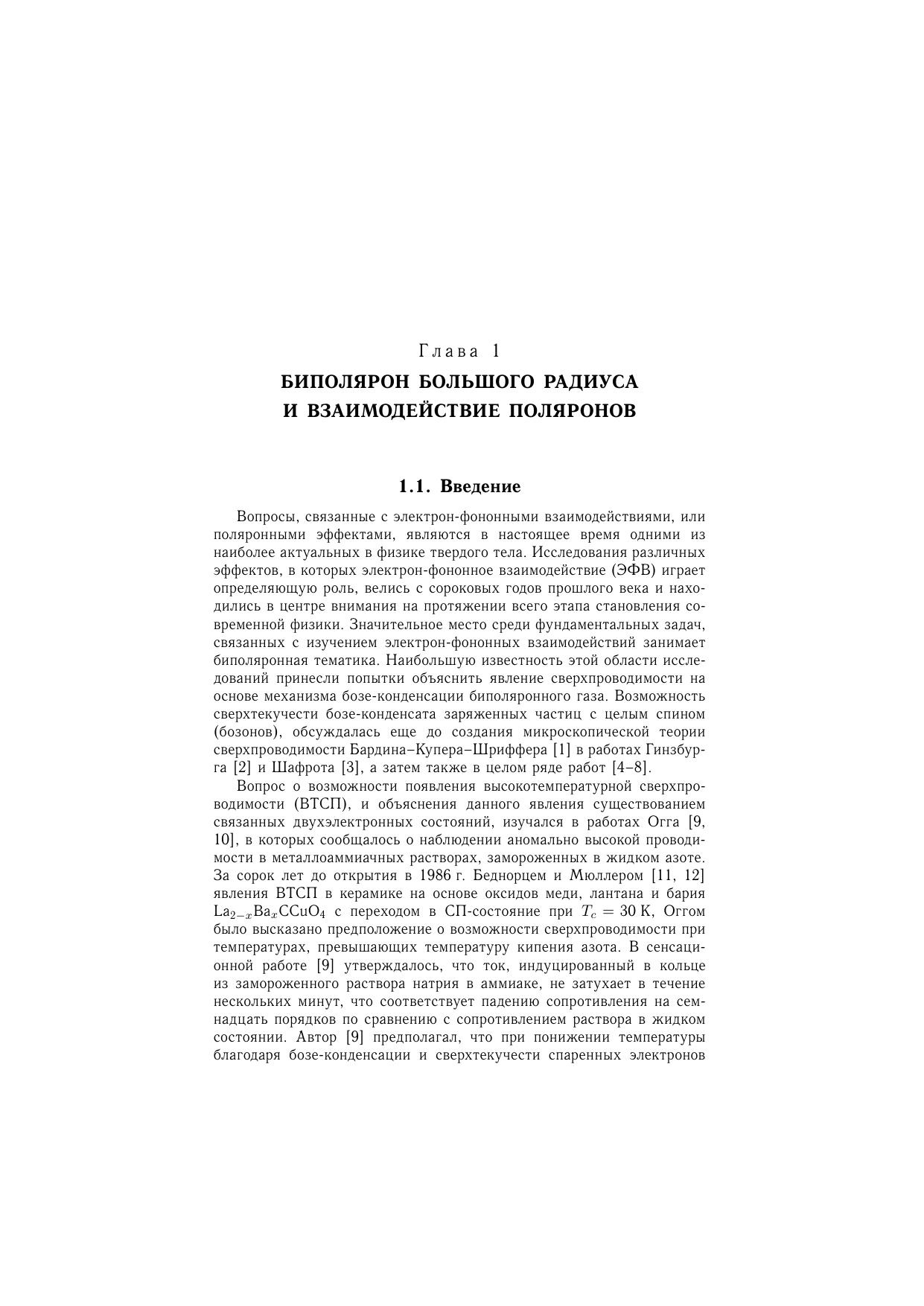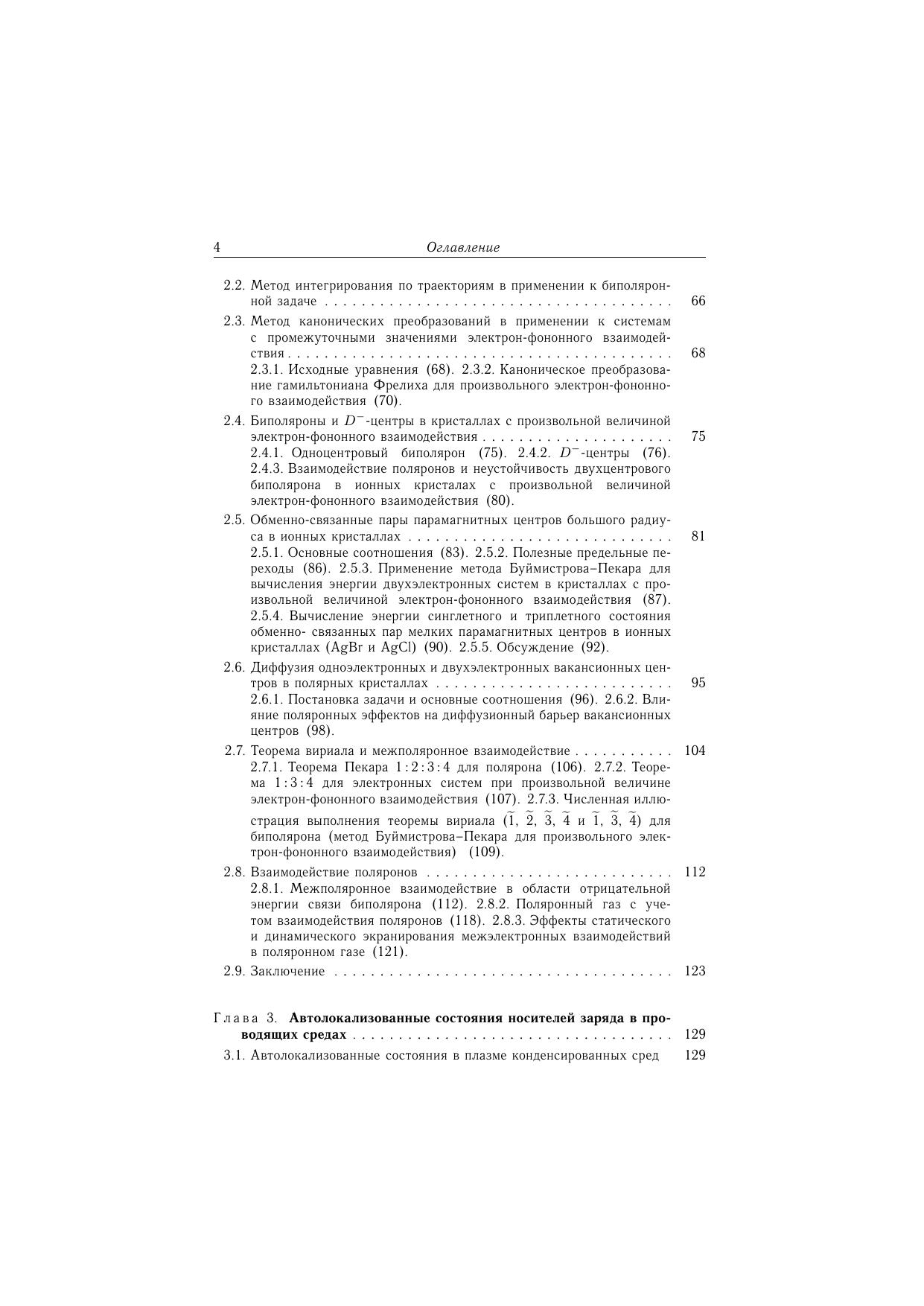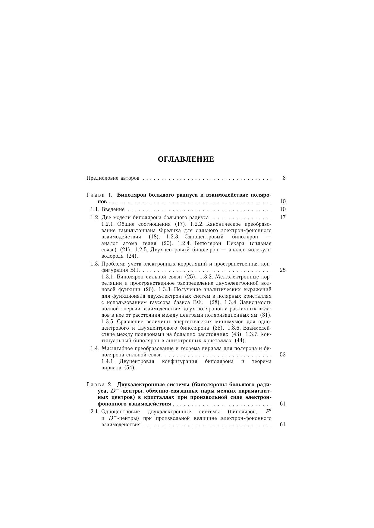 Монография посвящена изучению поляронных эффектов в двухэлектронных системах теории биполяронов большого радиуса, D^- - центров, обменно-связанных пар, межполяронного взаимодействия и косвенных взаимодействий примесных центров через поля элементарных возбуждений кристаллической решетки. Проанализированы различия между двухцентровой и одноцентровой моделями континуального биполярона в изотропных и анизотропных кристаллах. Показано, что учет межэлектронных корреляций может значительно понизить энергию биполярона и D^- -центра и обменно-связанных пар мелких водородоподобных центров. Двухцентровая конфигурация биполярона соответствует мелкому побочному минимуму и нестабильна. Обменное взаимодействие между пекаровскими поляронами, обусловленно фотонами, носит антиферромагнитный характер и превышает ферромагнитное взаимодействие, соответствующее прямому кулоновскому обмену между электронами, локализованными в поляронных потенциальных ямах. Обсуждается возможность возникновения высокотемпературной сверхпроводимости, вызванной сверхтекучестью биполяронов, а также вопросы, связанные с вингнароской кристаллизацией поляронного газа. В континуальном приближении рассмотрены эффекты, связанные с влиянием носителей тока в зоне проводимости, или дырок в валентной зоне на энергию локализованных и автолокализованных состояний, эффекты автолокализации заряженных частиц в плазме твердого тела и электролитах, косвенные взаимодействия парамагнитных центров с плазменными колебаниями носителей тока в твердых телах. Значительная часть монографии посвящена примерам нахождения энергетического спектра локализованных и свободных поляронов и биполяронов вариационными методами с использованием минимизации многопараметрических функционалов. Расчеты проводились с учетом пространственной корреляции - прямой зависимости волновой функции системы от межэлектронного расстояния. Рассмотрены пределы сильной связи, так же методы нахождения энергии с учетом поляронных эффектов при произвольной величине электрон-фононных взаимодействий. Приведены многочисленные результаты численных расчетов энергии двухэлектронных систем для ряда конкретных крисаллов, а также для различных параметрах электрон-фононного взаимодействия. Рецензенты: член -корреспондент НАН Украины В.А.Кочелап, д.ф.-м.н, профессор А. В. Тулуб.