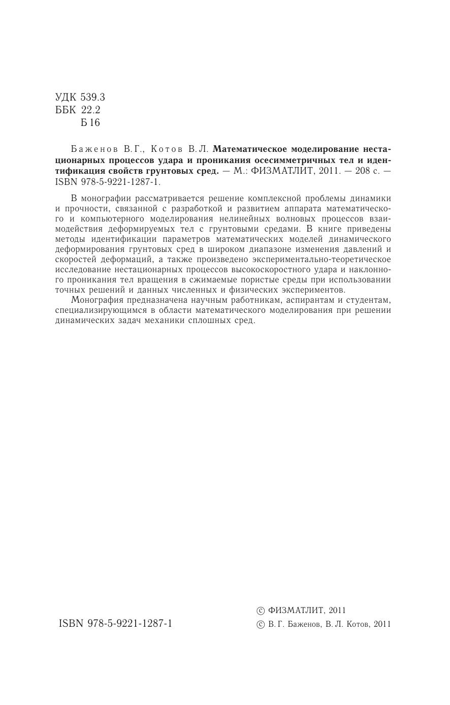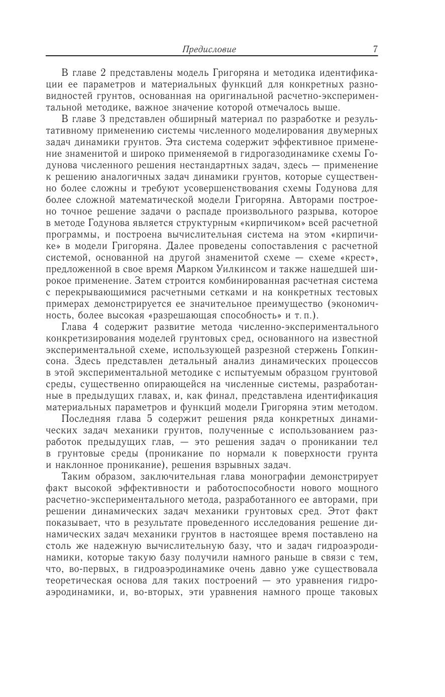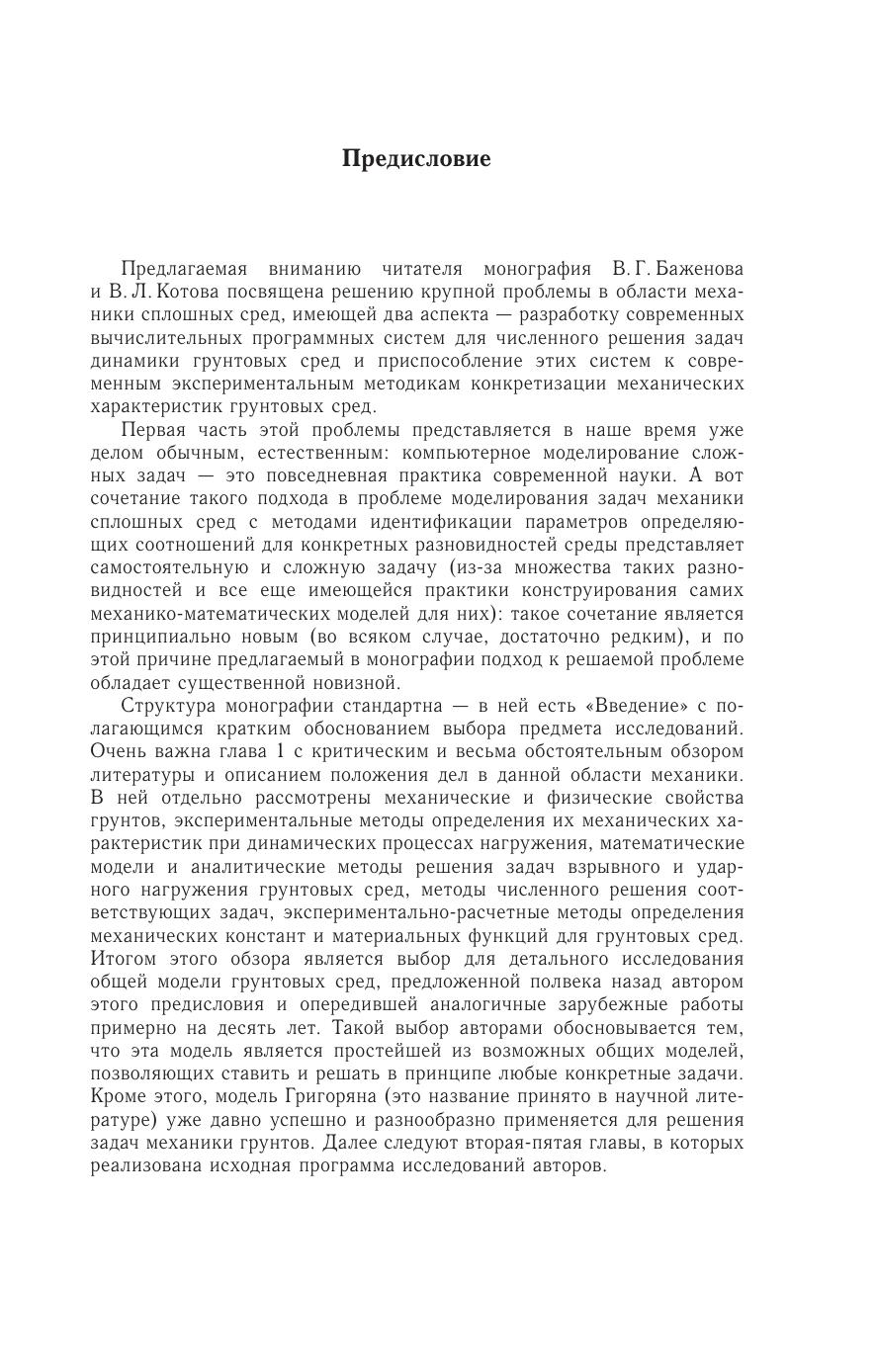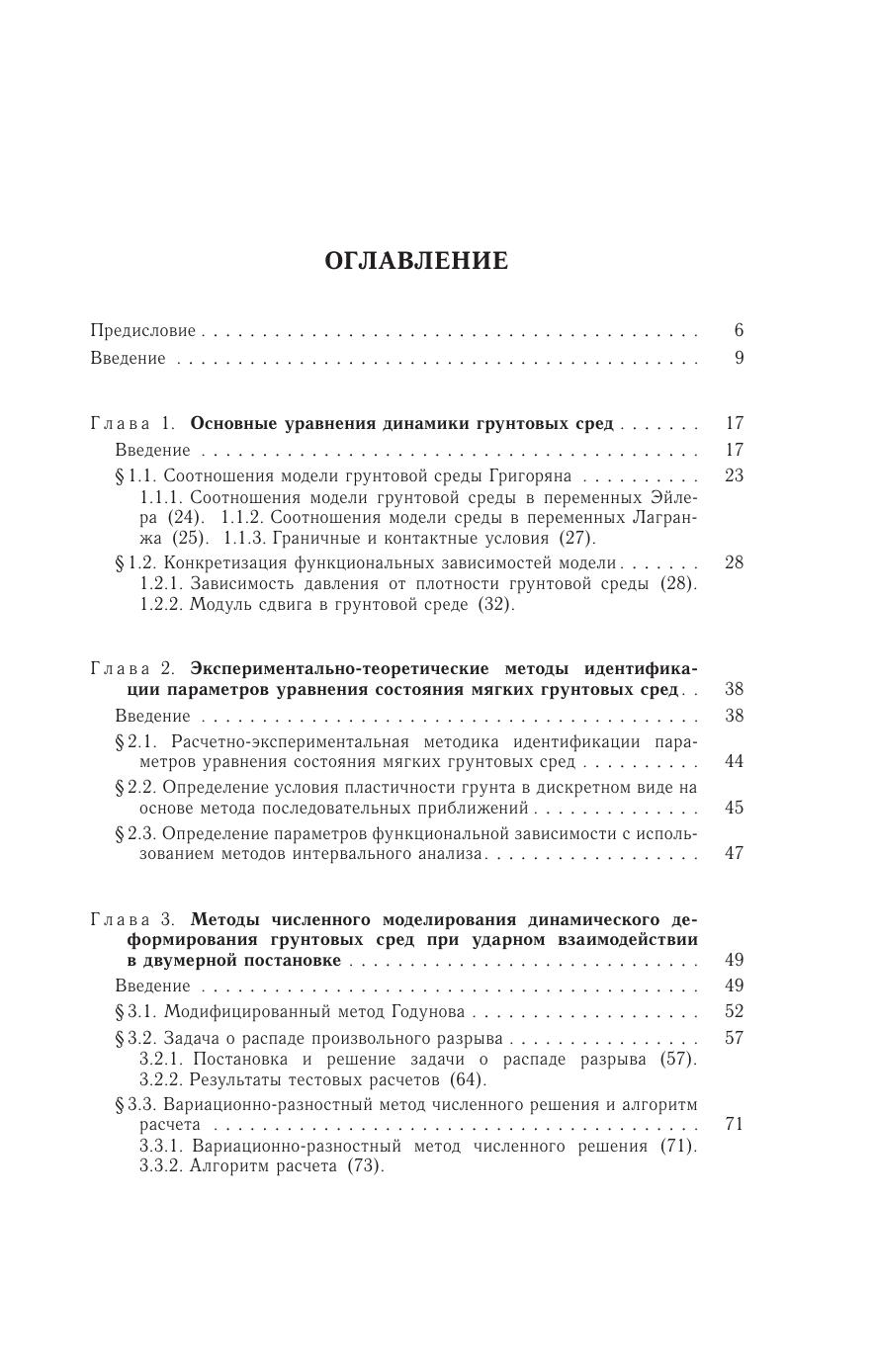 В монографии рассматривается решение комплексной проблемы динамики и прочности, связанной с разработкой и развитием аппарата математического и компьютерного моделирования нелинейных волновых процессов взаимодействия деформируемых телс грунтовыми средами. В книге приведены методы идентификации параметров математических моделей динамического деформирования грунтовых сред в широком диапазоне изменения давлений и скоростей деформаций, а также произведено экспериментально-теоретическое исследование нестационарных процессов высокоскоростного удара и наклонного проникания телв ращения в сжимаемые пористые среды при использовании точных решений и данных численных и физических экспериментов. Монография предназначена научным работникам, аспирантам и студентам, специализирующимся в области математического моделирования при решении динамических задач механики сплошных сред.