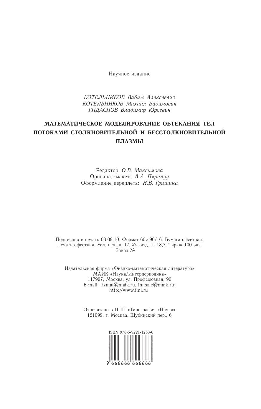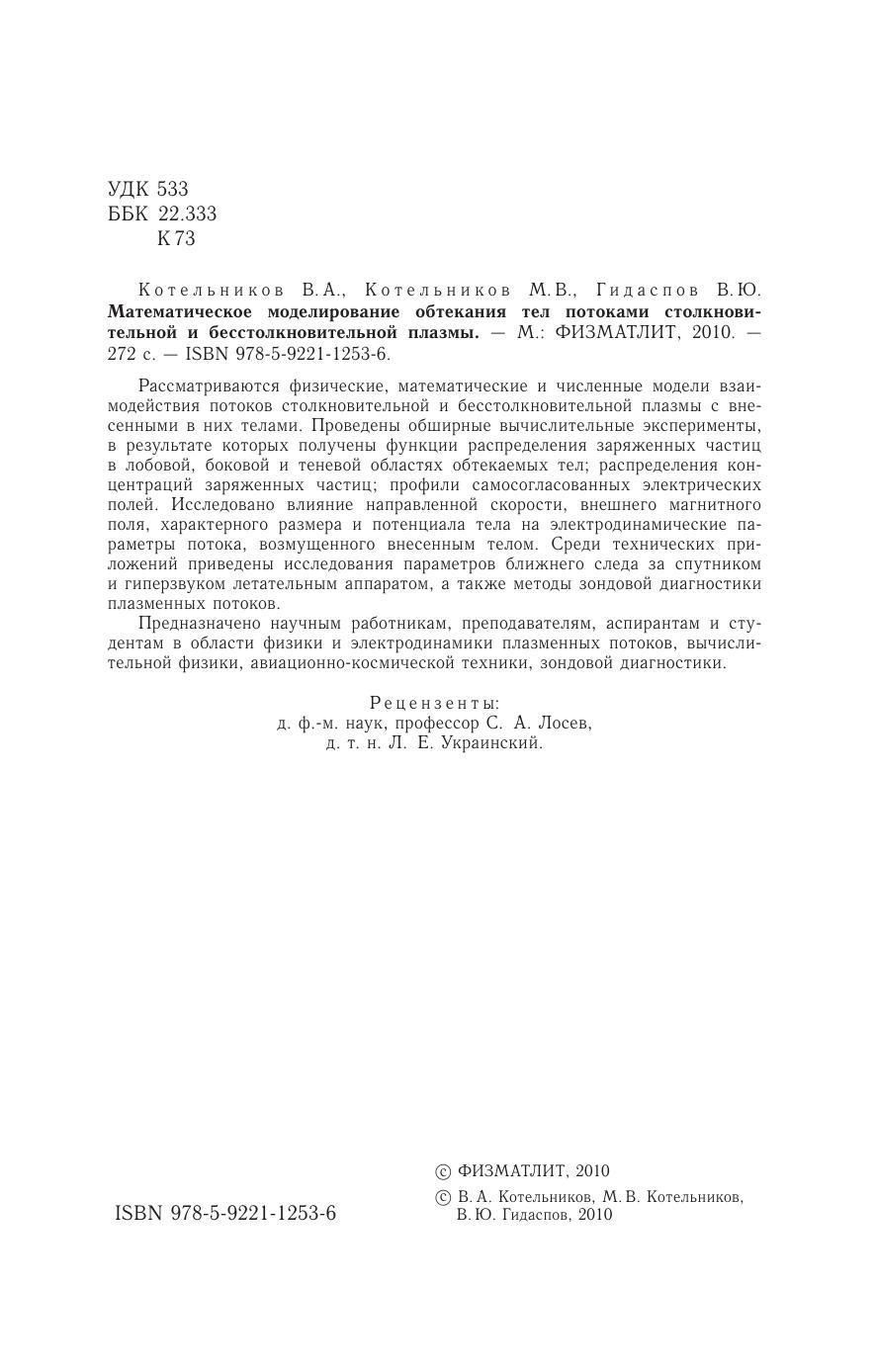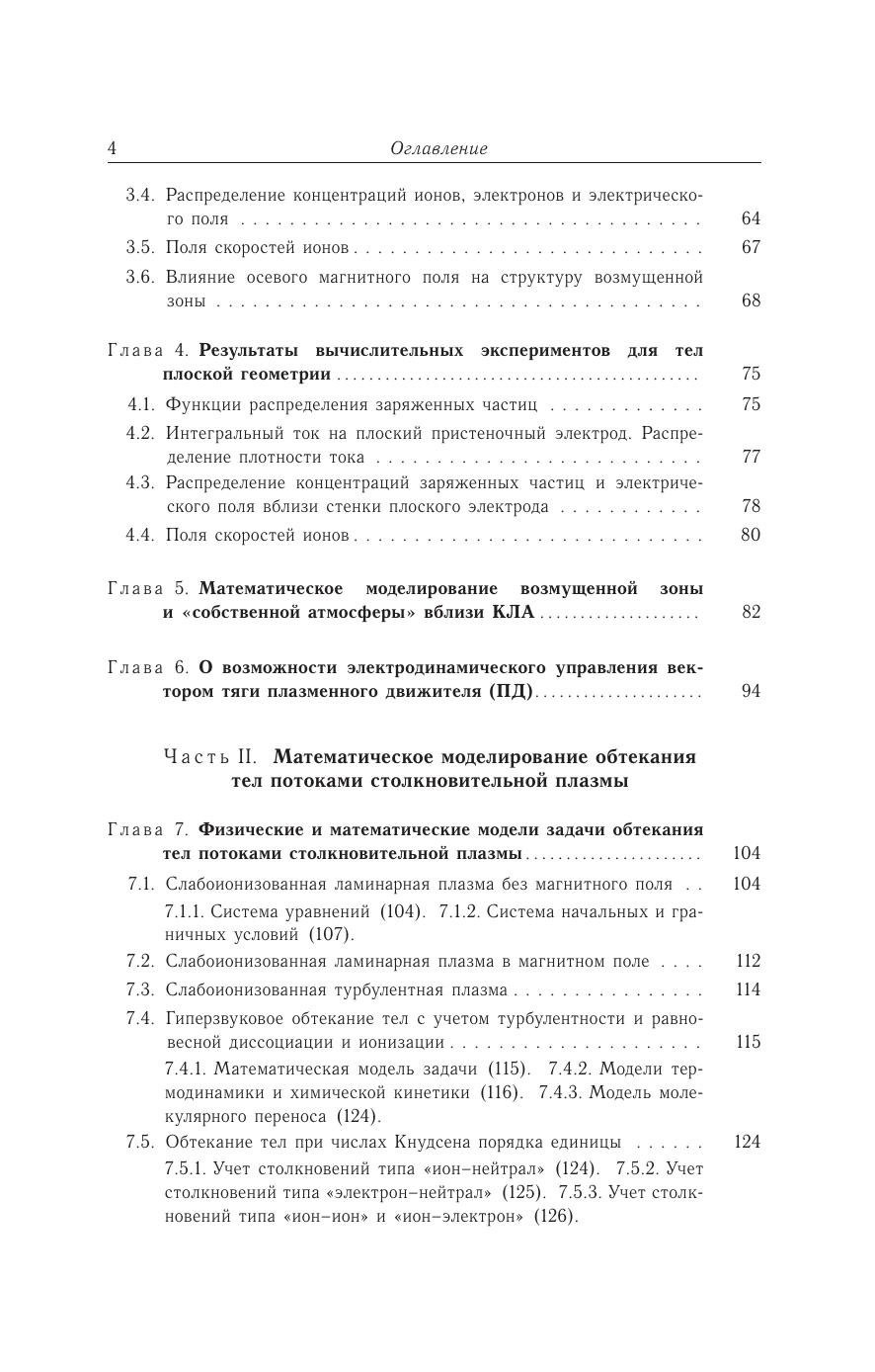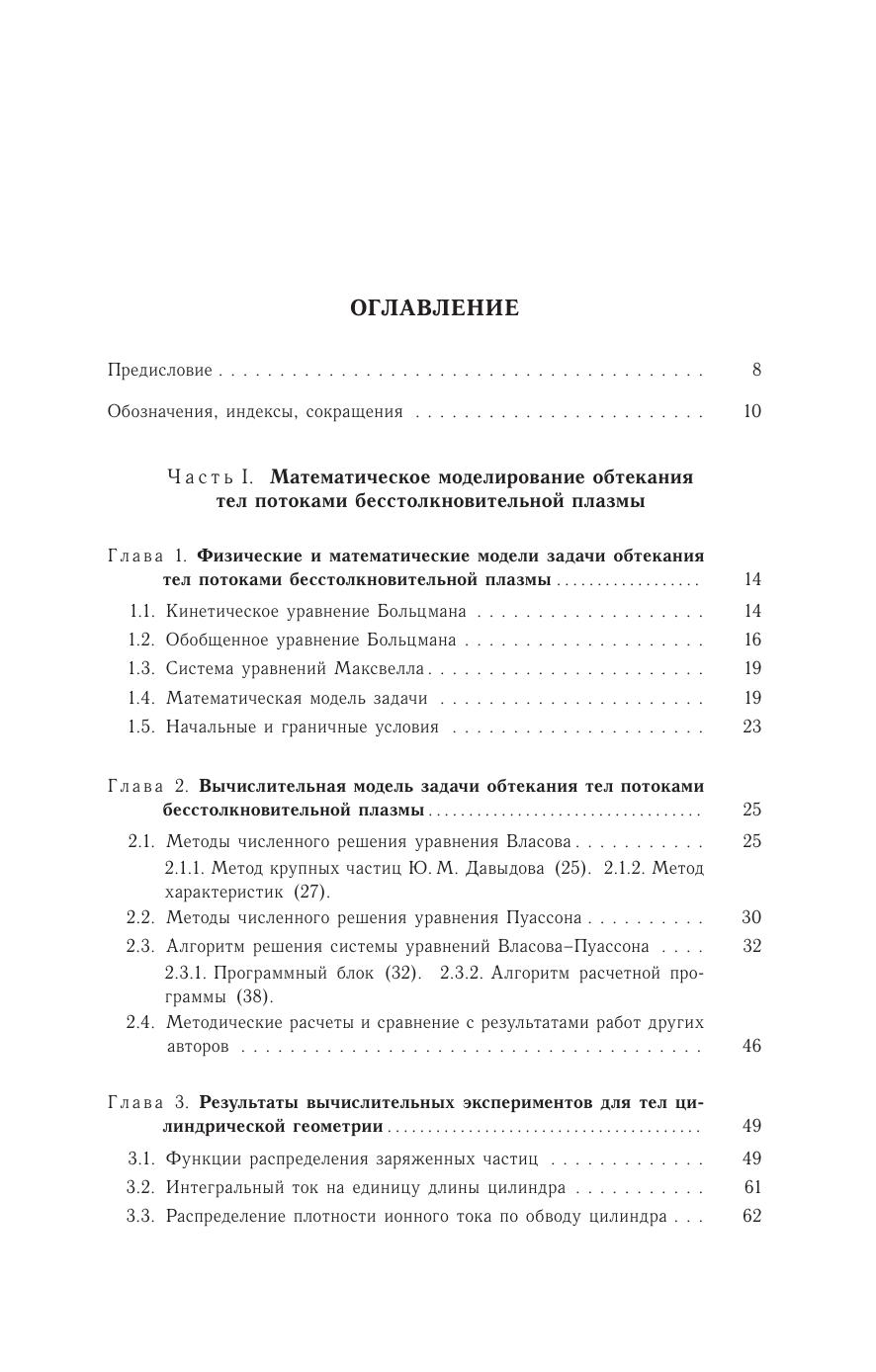 Рассматриваются физические, математические и численные модели взаимодействия потоков столкновительной и бесстолкновительной плазмы с внесенными в них телами. Проведены обширные вычислительные эксперименты, в результате которых получены функции распределения заряженных частиц в лобовой, боковой и теневой областях обтекаемых тел распределения концентраций заряженных частиц профили самосогласованных электрических полей. Исследовано влияние направленной скорости, внешнего магнитного поля, характерного размера и потенциала тела на электродинамические параметры потока, возмущенного внесенным телом. Среди технических приложений приведены исследования параметров ближнего следа за спутником и гиперзвуком летательным аппаратом, а также методы зондовой диагностики плазменных потоков. Предназначено научным работникам, преподавателям, аспирантам и студентам в области физики и электродинамики плазменных потоков, вычислительной физики, авиационно-космической техники, зондовой диагностики.