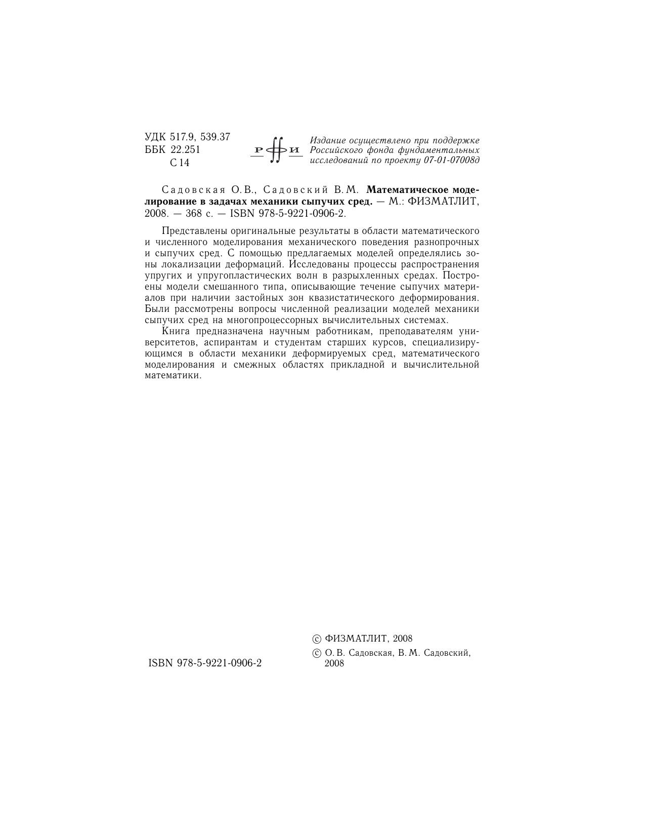 Представлены оригинальные результаты в области математического и численного моделирования механического поведения разнопрочных и сыпучих сред. С помощью предлагаемых моделей определялись зоны локализации деформаций. Исследованы процессы распространения упругих и упругоплас-тических волн в разрыхленных средах. Построены модели смешанного типа, описывающие течение сыпучих материалов при наличии застойных зон квазистатического деформирования. Были рассмотрены вопросы численной реализации моделей механики сыпучих сред на многопроцессорных вычислительных системах. Книга предназначена научным работникам, преподавателям университетов, аспирантам и студентам старших курсов, специализирующимся в области механики деформируемых сред, математического моделирования и смежных областях прикладной и вычислительной математики.