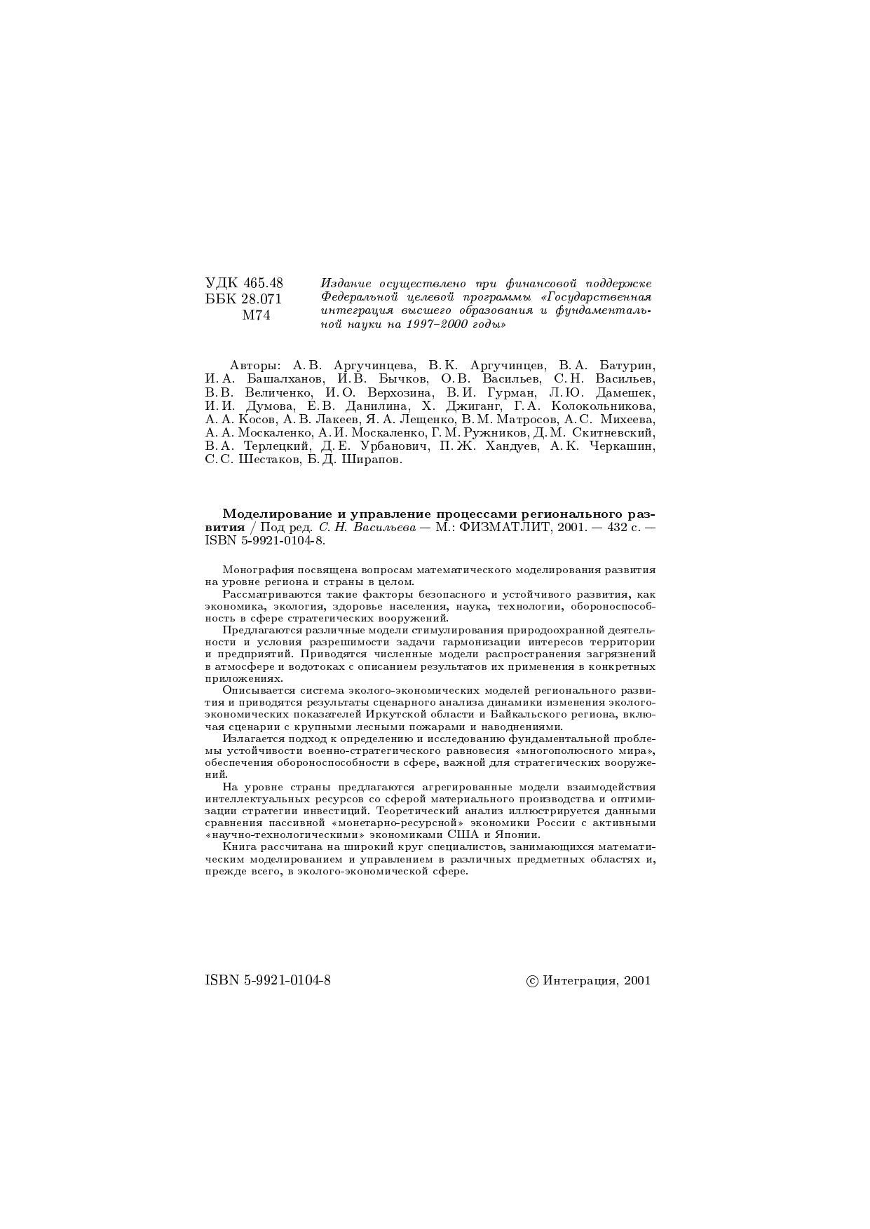 Монография посвящена вопросам математического моделирования развития на уровне региона и страны в целом. Рассматриваются такие факторы безопасного и устойчивого развития, как экономика, экология, здоровье населения, наука, технология, обороноспособность в сфере стратегических вооружений. Предлагаются различные модели стимулирования природоохранной деятельности и условия разрешимости задачи гармонизации интересов территории и предприятий. Приводятся численные модели распространения загрязнений в атмосфере и водотоках с описанием результатов их применения в конкретных приложениях. Описывается система эколого-экономических моделей регионального развития и приводятся результаты сценарного анализа динамики изменения эколого-экономических показателей Иркутской области и Байкальского региона, включая сценарии с крупными лесными пожарами и наводнениями. Излагается подход к определению и исследованию фундаментальной проблемы устойчивости военно-стратегического равновесия «многополюсного мира», обеспечения обороноспособности в сфере, важной для стратегических вооружений. На уровне страны предлагаются агрегированные модели взаимодействия интеллектуальных ресурсов со сферой материального производства и оптимизации стратегии инвестиций. Теоретический анализ иллюстрируется данными сравнения пассивной «монетарно-ресурсной» экономики России с активными «научно-технологическими» экономиками США и Японии. Книга рассчитана на широкий круг специалистов, занимающихся математическим моделированием и управлением в различных предметных областях и, прежде всего, в эколого-экономической сфере