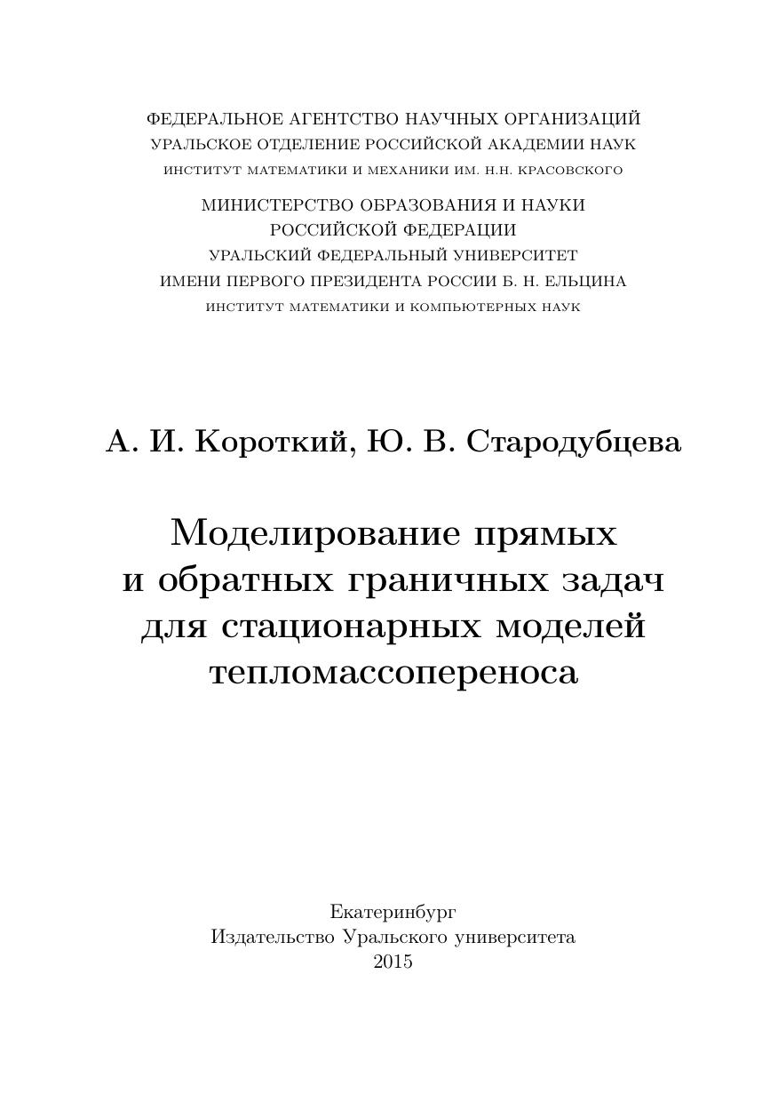 Моделирование прямых и обратных граничных задач для стационарных моделей тепломассопереноса: монография