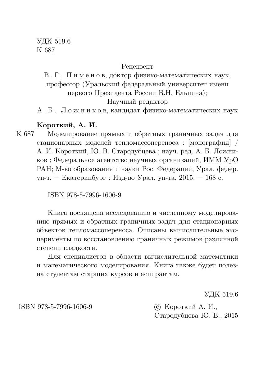 Книга посвящена исследованию и численному моделированию прямых и обратных граничных задач для стационарных объектов тепломассопереноса. Описаны вычислительные эксперименты по восстановлению граничных режимов различной степени гладкости. Для специалистов в области вычислительной математики и математического моделирования. Книга также будет полезна студентам старших курсов и аспирантам.
