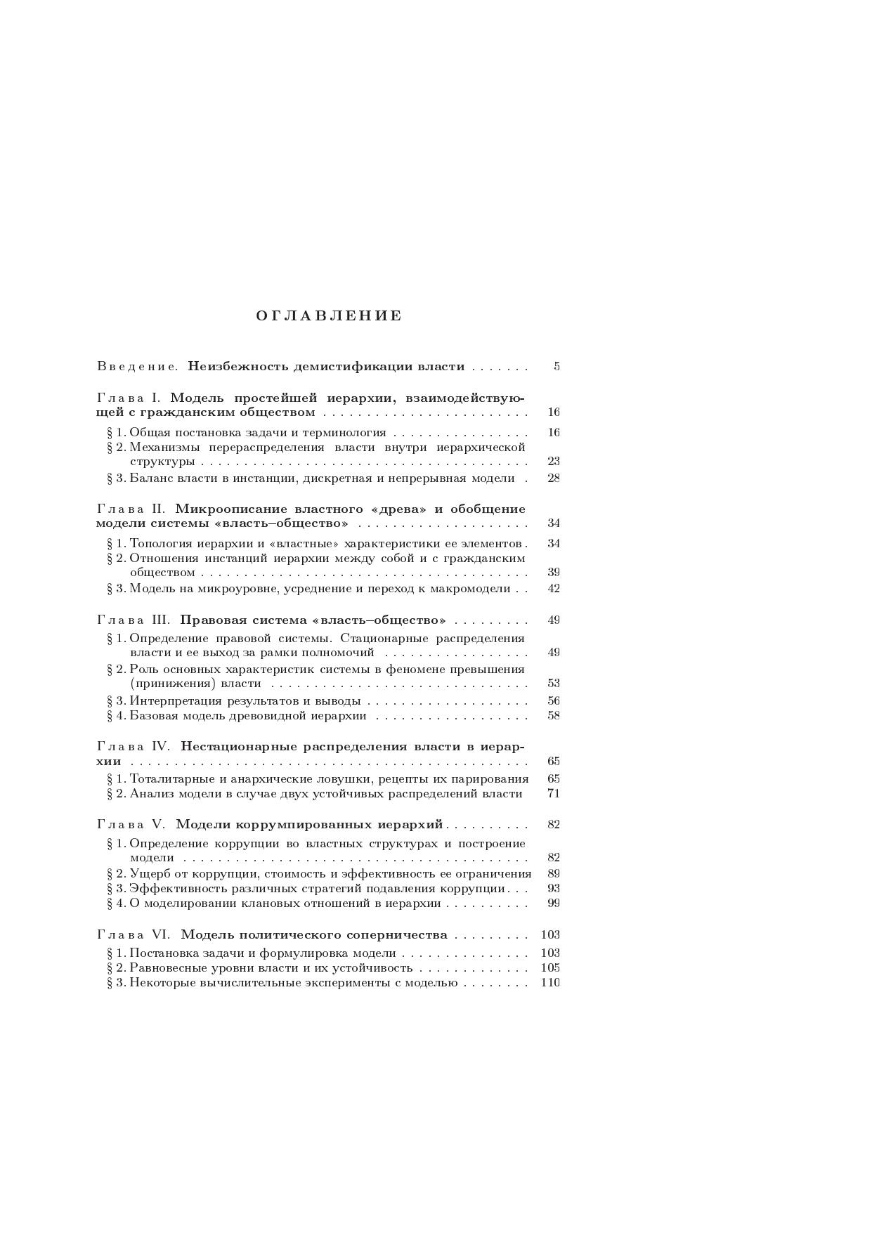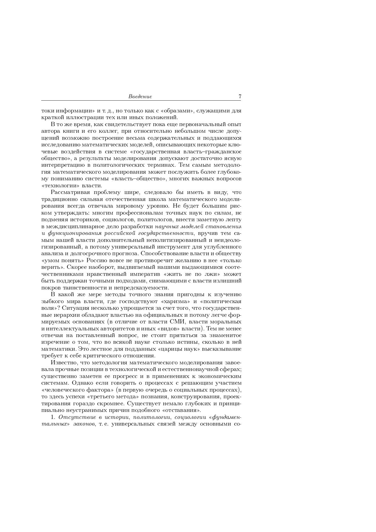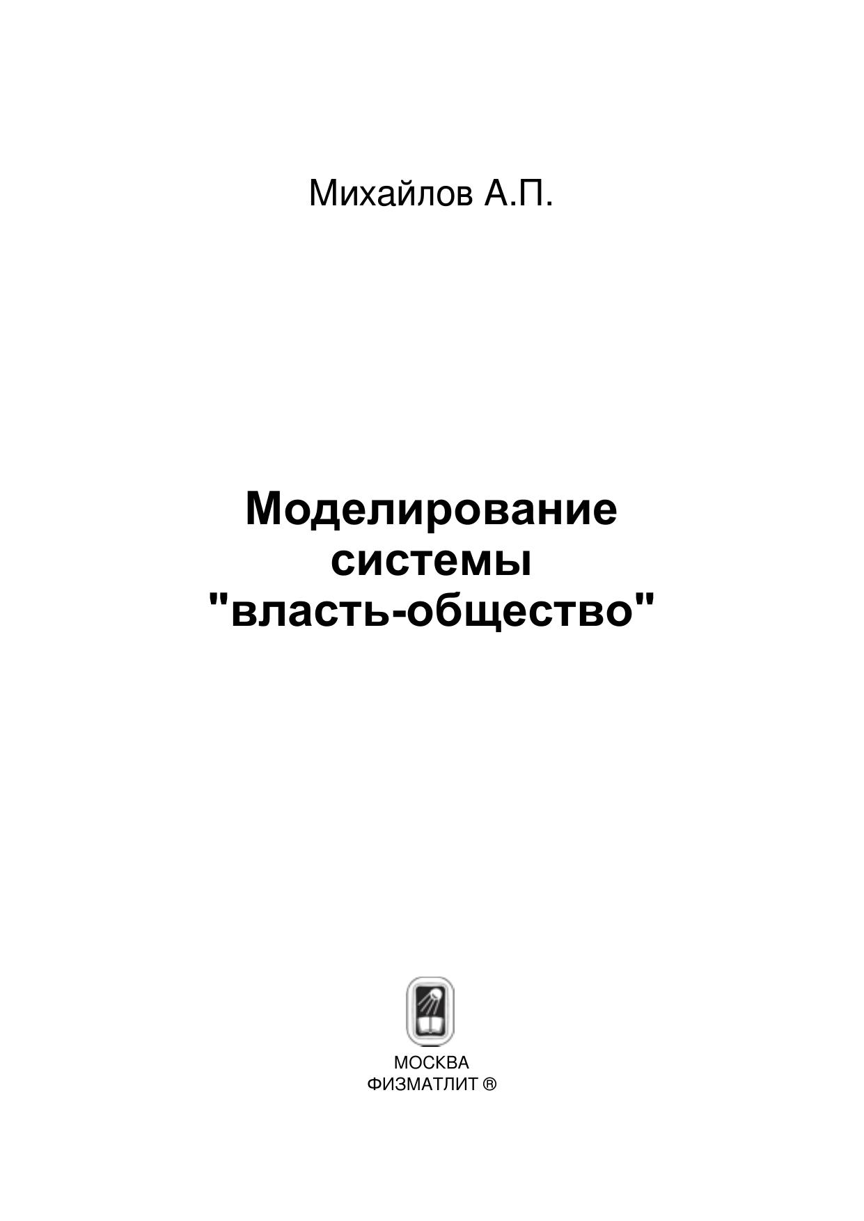 Книга посвящена построению и исследованию математических моделей системы «государственная власть–гражданское общество». Введены и математически формализованы соответствующие понятия. Получены замкнутые математические модели, выражающие своего рода «закон сохранения власти» и описывающие «пространственно-временную» динамику ее распределения в иерархии. Продемонстрировано, что вычислительные (имитационные) эксперименты с моделями и их исследование аналитическими методами дают возможность для изучения ряда ключевых проблем, связанных с функционированием системы «власть–общество». Приводятся примеры применения моделей для анализа и прогноза ряда актуальных политических процессов. Книга предназначена студентам, аспирантам и научным работникам, специализирующимся в области математического моделирования, а также политологам, социологам и другим представителям общественных наук, интересующимся приложениями точных методов к трудноформализуемым объектам.