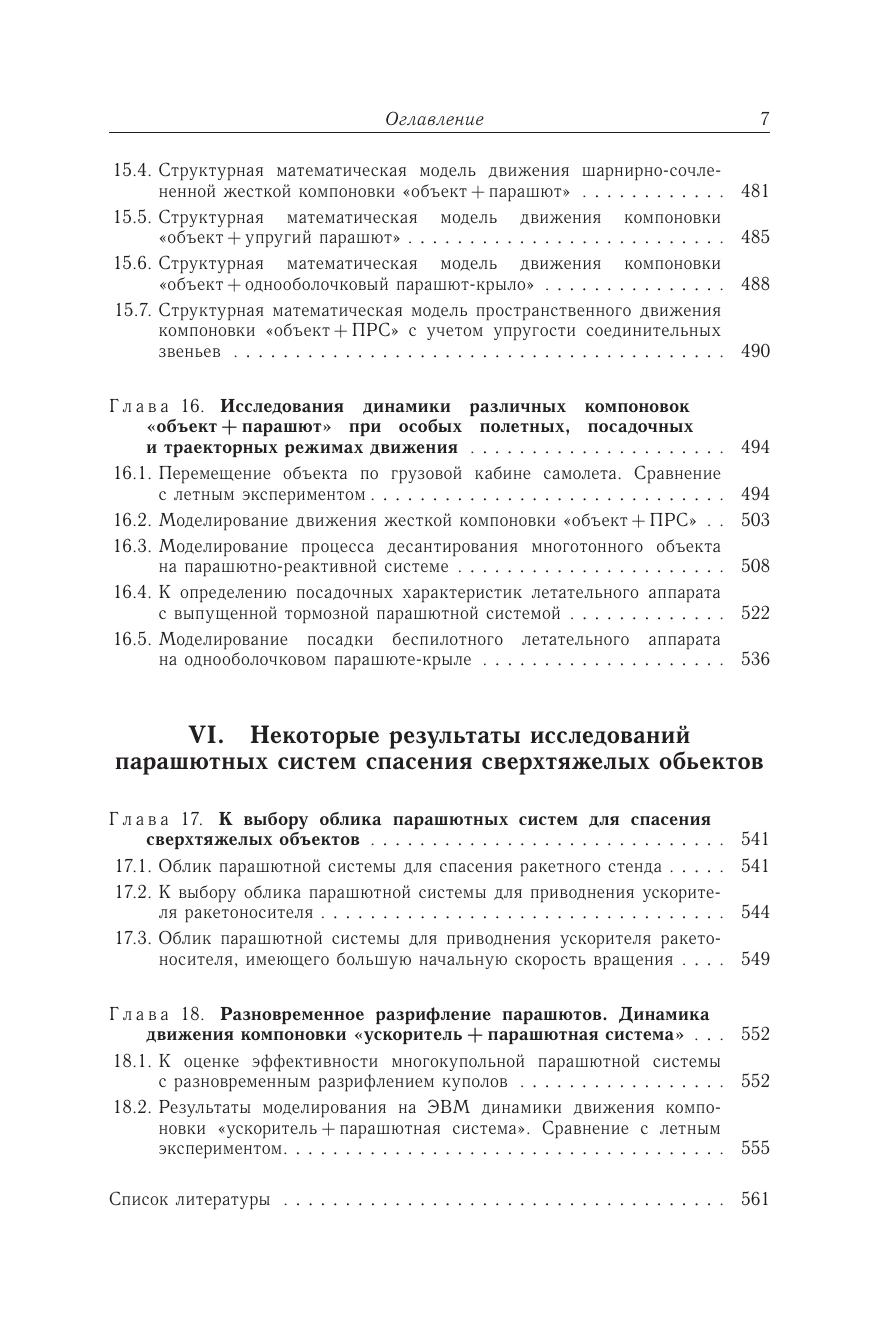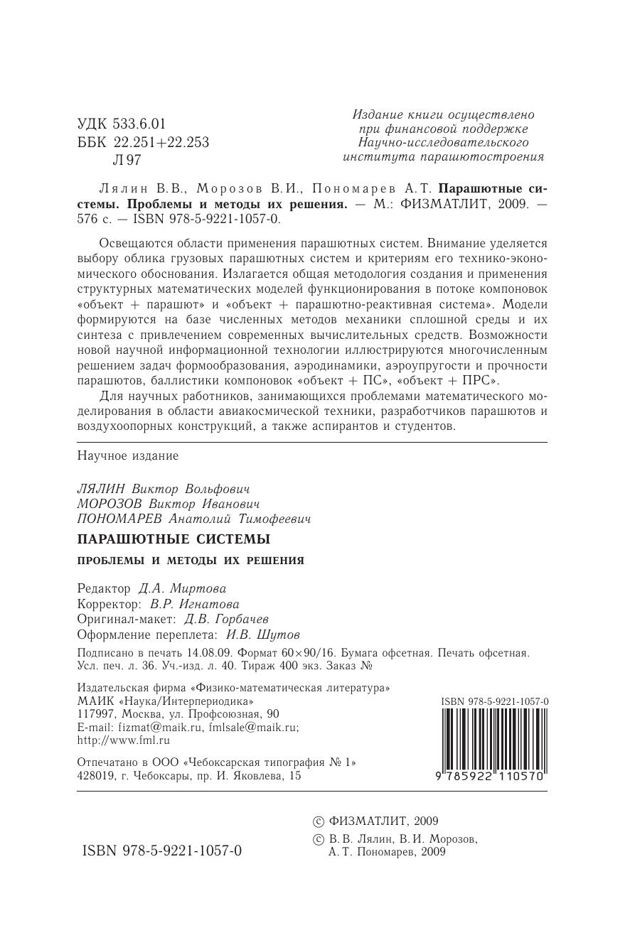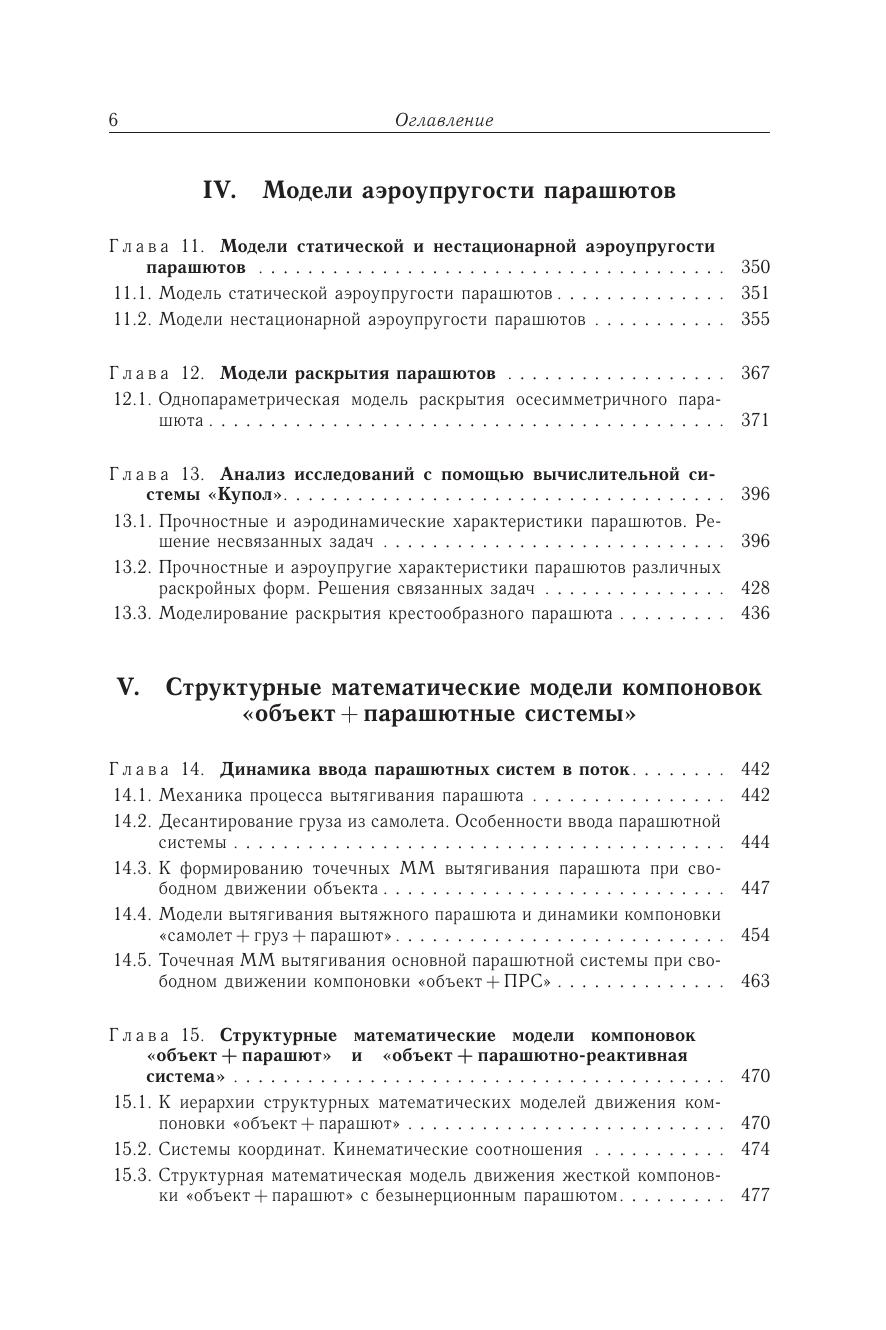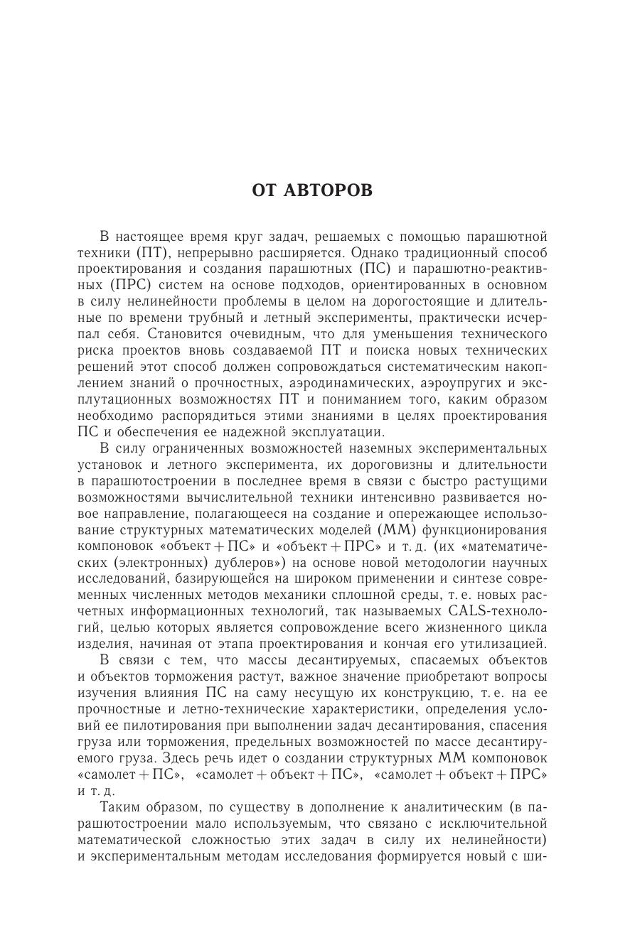 Освещаются области применения парашютных систем. Внимание уделяется выбору облика грузовых парашютных систем и критериям его технико-экономического обоснования. Излагается общая методология создания и применения структурных математических моделей функционирования в потоке компоновок «объект + парашют» и «объект + парашютно-реактивная система». Модели формируются на базе численных методов механики сплошной среды и их синтеза с привлечением современных вычислительных средств. Возможности новой научной информационной технологии иллюстрируются многочисленным решением задач формообразования, аэродинамики, аэроупругости и прочности парашютов, баллистики компоновок «объект + ПС», «объект + ПРС». Для научных работников, занимающихся проблемами математического моделирования в области авиакосмической техники, разработчиков парашютов и воздухоопорных конструкций, а также аспирантов и студентов.