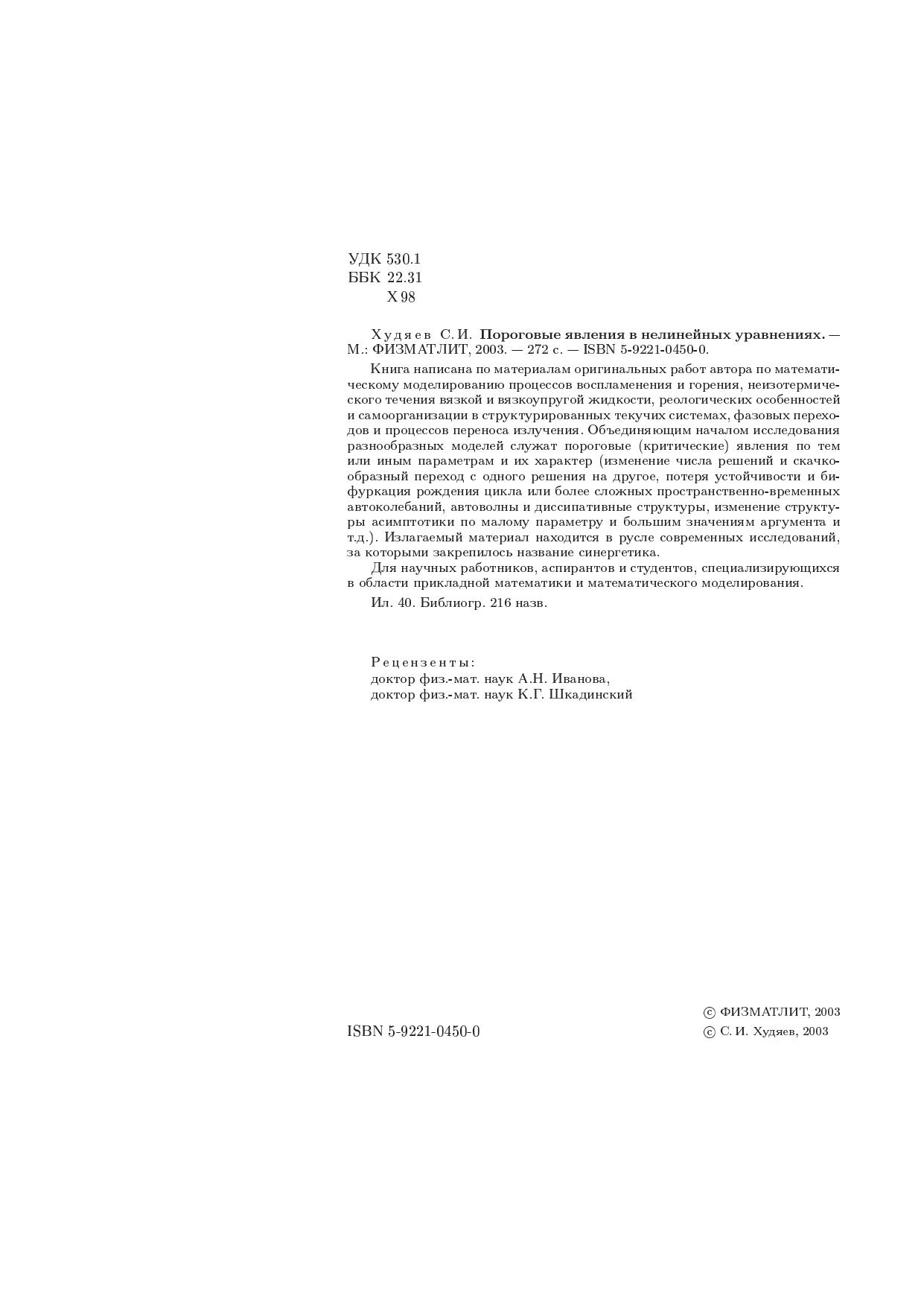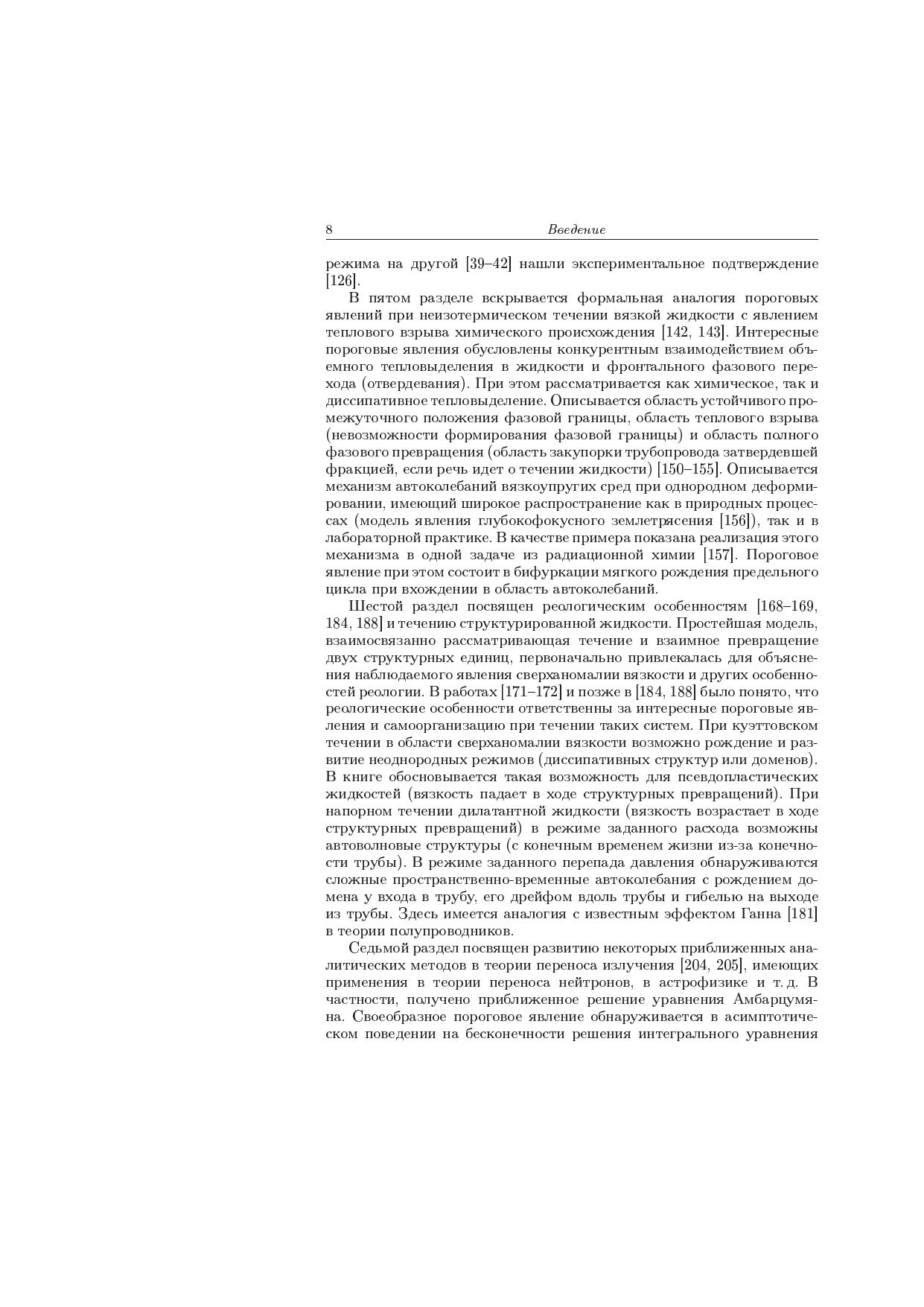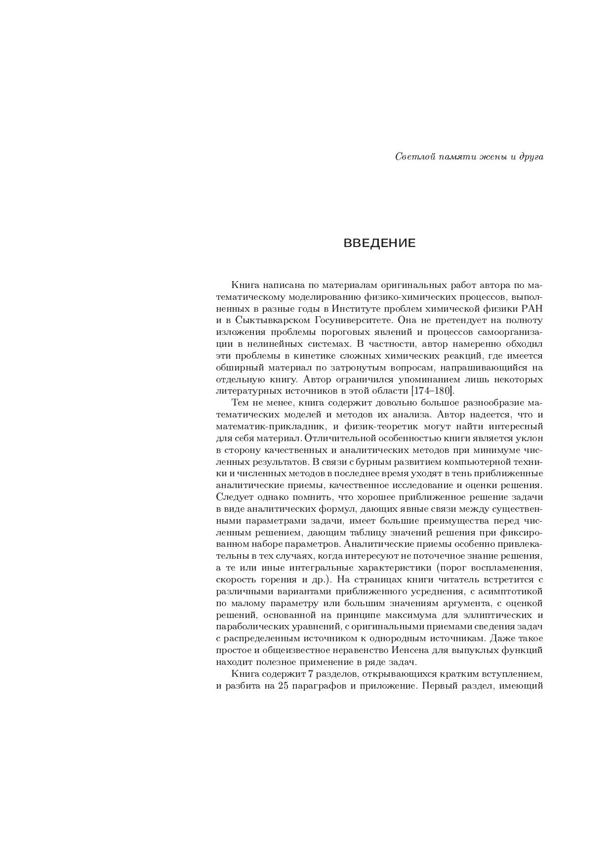 Книга написана по материалам оригинальных работ автора по математическому моделированию процессов воспламенения и горения, неизотермического течения вязкой и вязкоупругой жидкости, реологических особенностей и самоорганизации в структурированных текучих системах, фазовых переходов и процессов переноса излучения. Объединяющим началом исследования разнообразных моделей служат пороговые (критические) явления по тем или иным параметрам и их характер (изменение числа решений и скачкообразный переход с одного решения на другое, потеря устойчивости и бифуркация рождения цикла или более сложных пространственно-временных автоколебаний, автоволны и диссипативные структуры, изменение структуры асимптотики по малому параметру и большим значениям аргумента и т.д.). Излагаемый материал находится в русле современных исследований, за которыми закрепилось название синергетика. Для научных работников, аспирантов и студентов, специализирующихся в области прикладной математики и математического моделирования