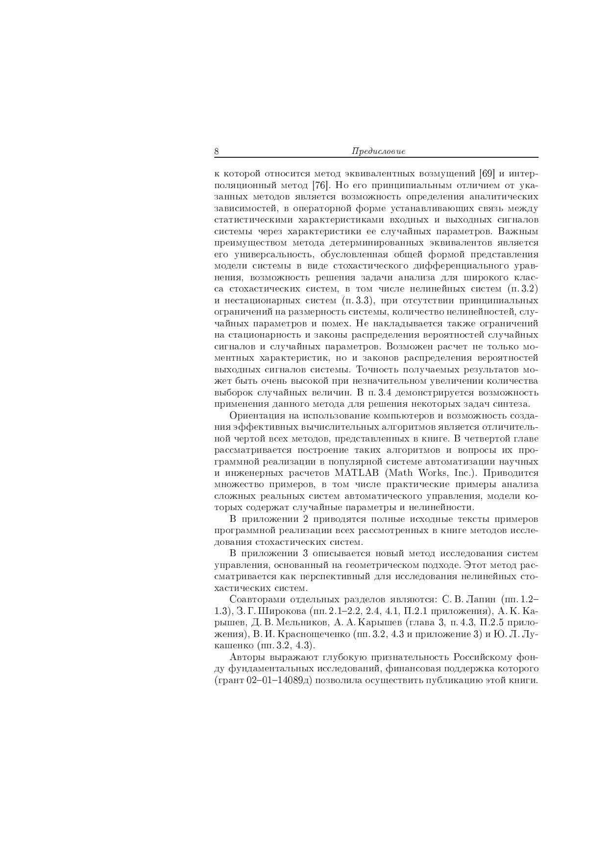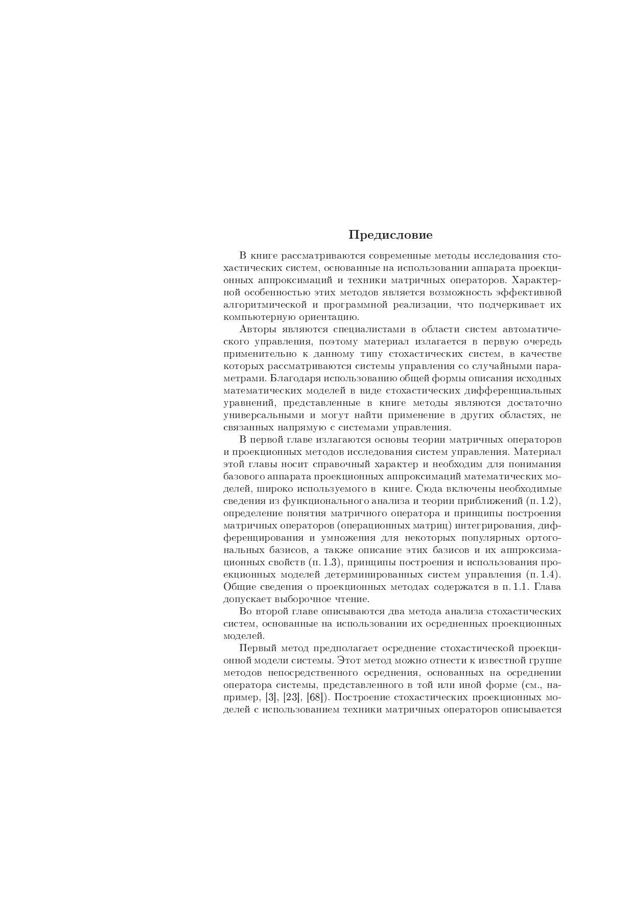 Изложены современные прикладные методы исследования стохастических систем, ориентированные на компьютерную реализацию они основаны на проекционной аппроксимации математических моделей стохастических систем с применением техники матричных операторов. В качестве стохастических систем рассматриваются системы автоматического управления в классе систем со случайными параметрами. Проекционная аппроксимация позволяет строить эффективные вычислительные алгоритмы решения задач анализа. Приводятся примеры алгоритмической и программной реализации излагаемых методов. В качестве языка программирования используется язык системы MATLAB. Для научных работников, специалистов в области математического моделирования и теории автоматического управления, а также для студентов и аспирантов соответствующих специальностей вузов.