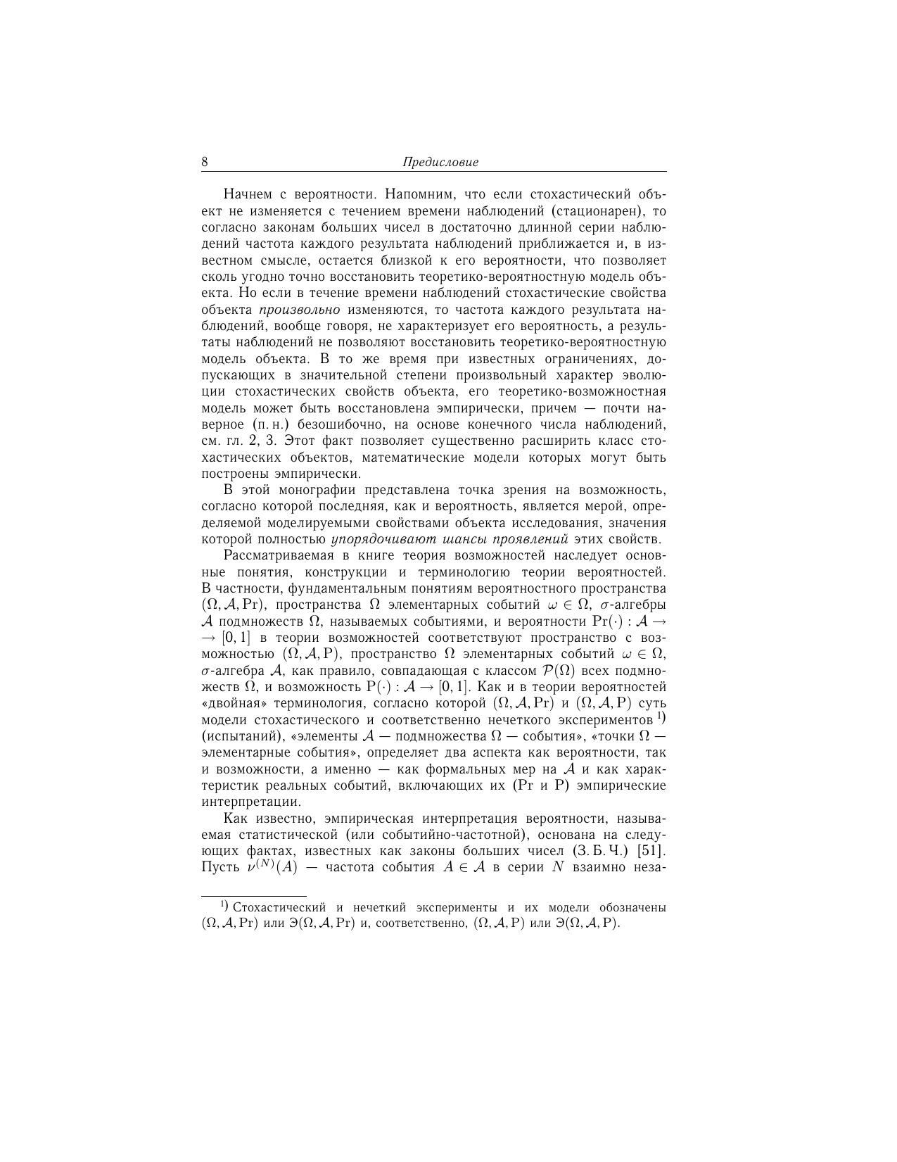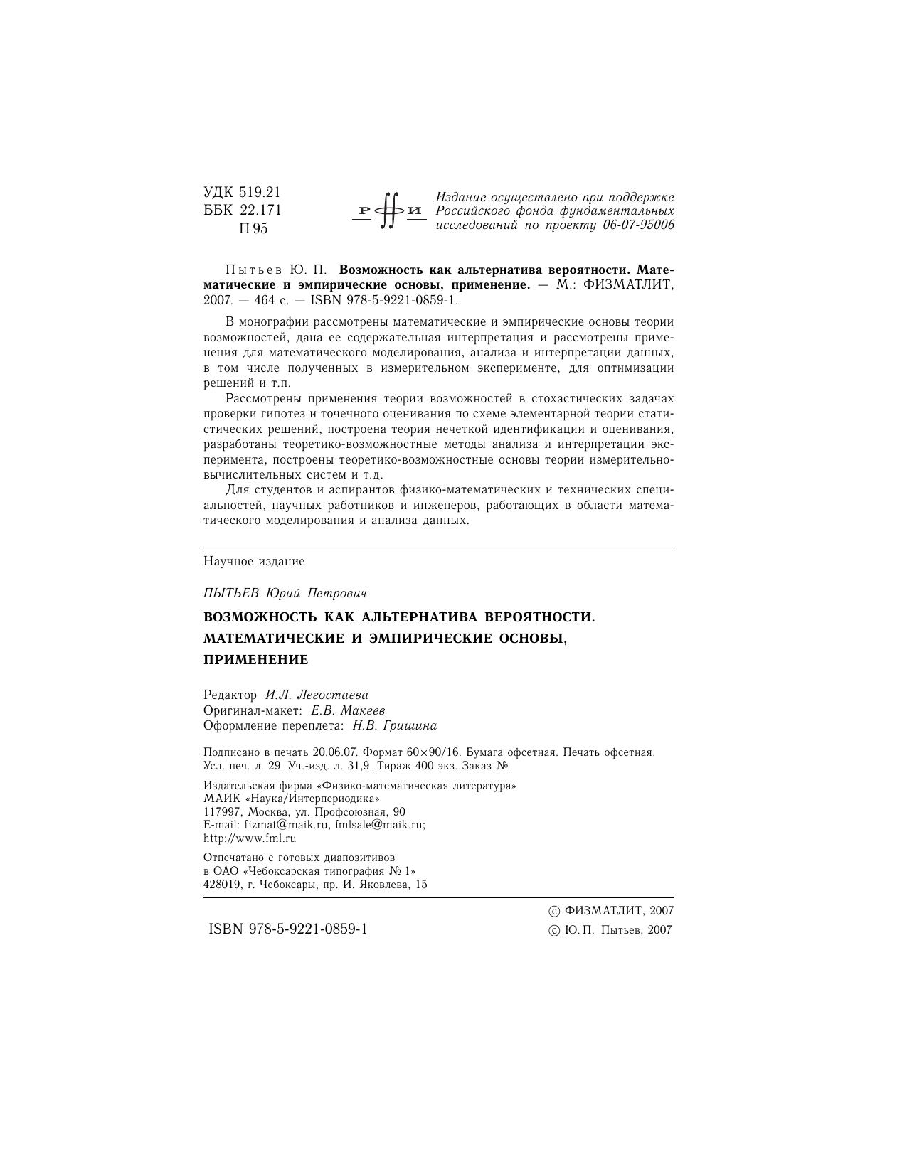 В монографии рассмотрены математические и эмпирические основы теории возможностей, дана ее содержательная интерпретация и рассмотрены применения для математического моделирования, анализа и интерпретации данных, в том числе полученных в измерительном эксперименте, для оптимизации решений и т.п. Рассмотрены применения теории возможностей в стохастических задачах проверки гипотез и точечного оценивания по схеме элементарной теории статистических решений, построена теория нечеткой идентификации и оценивания, разработаны теоретико-возможностные методы анализа и интерпретации эксперимента, построены теоретико-возможностные основы теории измерительно-вычислительных систем и т.д. Для студентов и аспирантов физико-математических и технических специальностей, научных работников и инженеров, работающих в области математического моделирования и анализа данных.