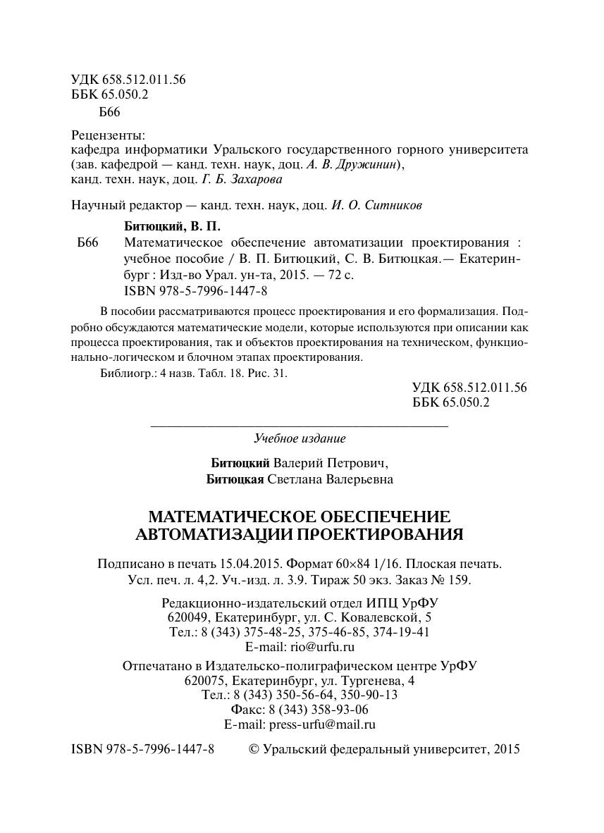 В пособии рассматриваются процесс проектирования и его формализация. Подробно обсуждаются математические модели, которые используются при описании как процесса проектирования, так и объектов проектирования на техническом, функционально-логическом и блочном этапах проектирования.