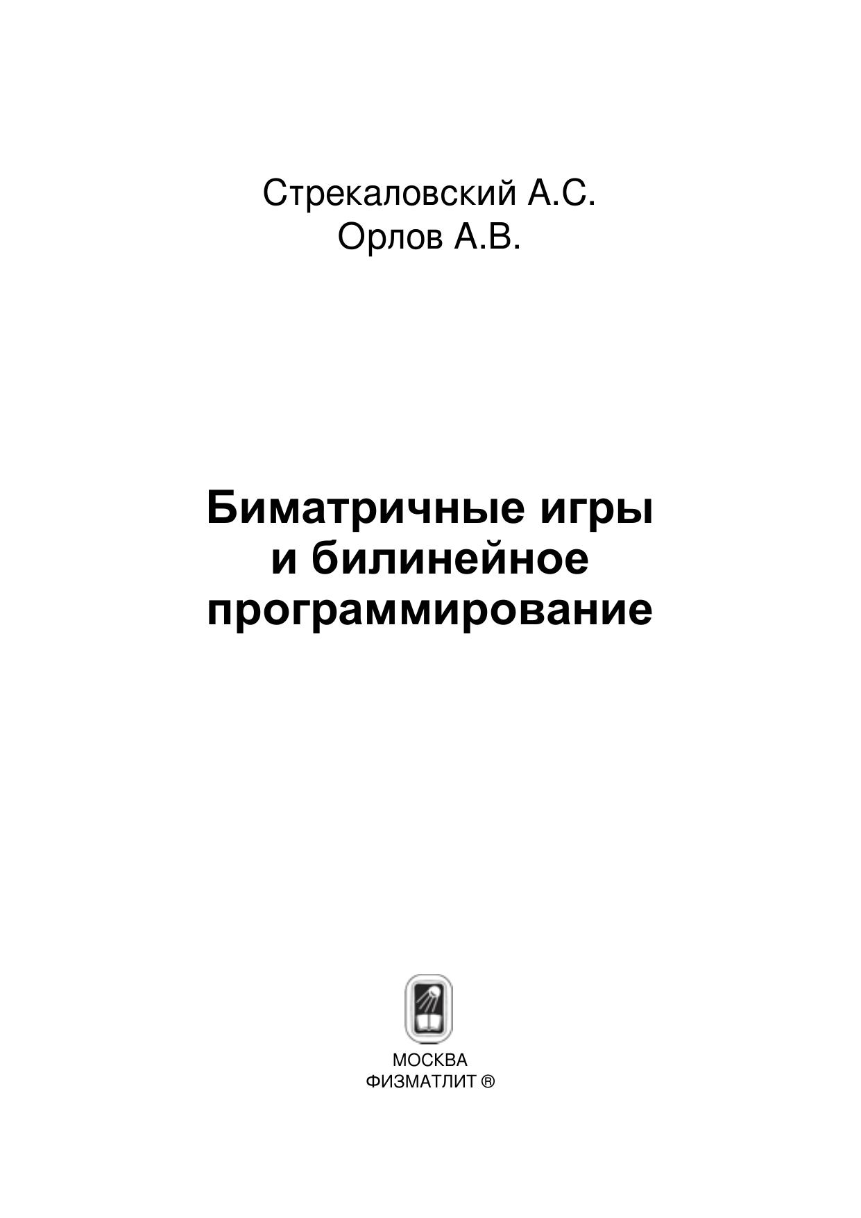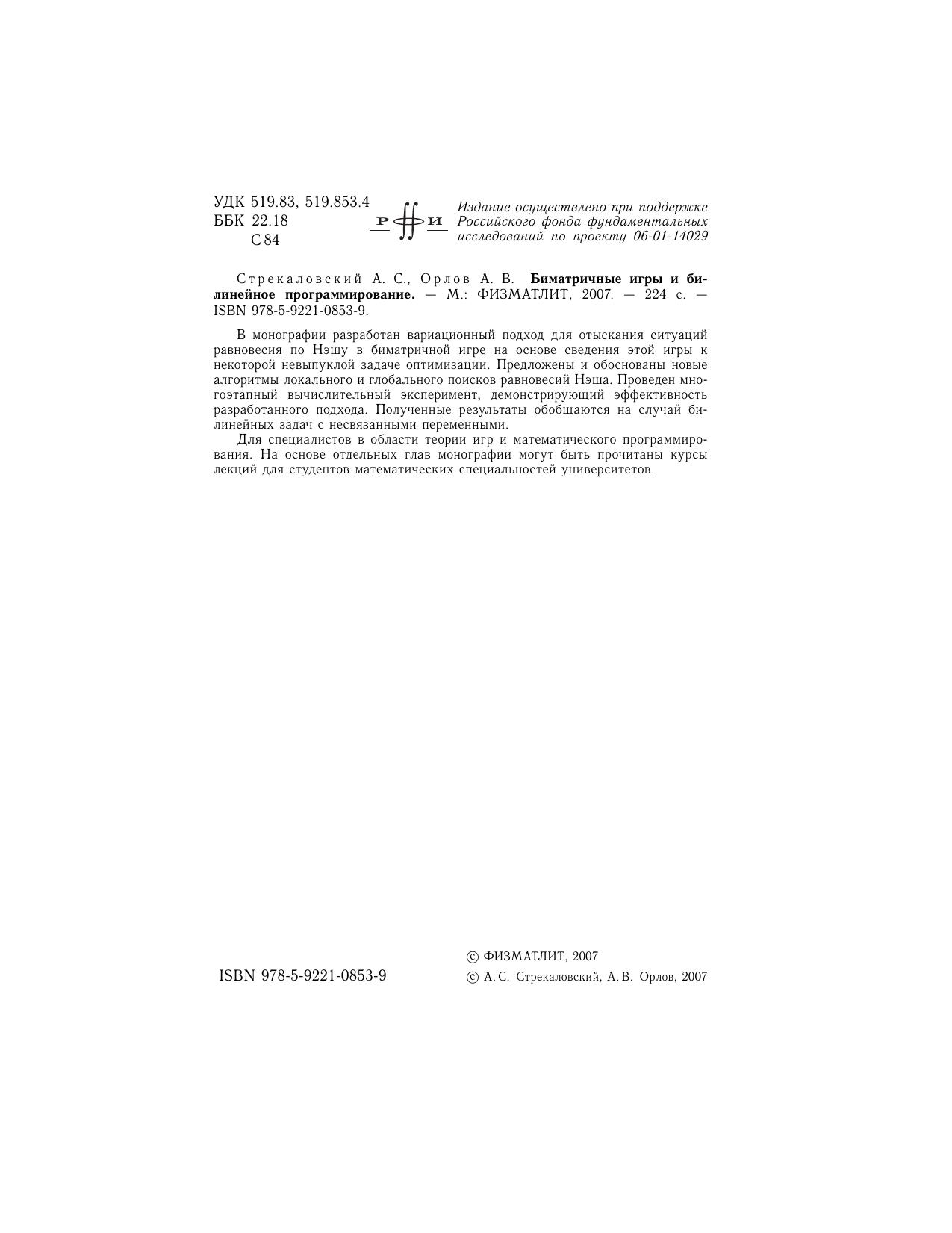 В монографии разработан вариационный подход для отыскания ситуаций равновесия по Нэшу в биматричной игре на основе сведения этой игры к некоторой невыпуклой задаче оптимизации. Предложены и обоснованы новые алгоритмы локального и глобального поисков равновесий Нэша. Проведен многоэтапный вычислительный эксперимент, демонстрирующий эффективность разработанного подхода. Полученные результаты обобщаются на случай билинейных задач с несвязанными переменными. Для специалистов в области теории игр и математического программирования. На основе отдельных глав монографии могут быть прочитаны курсы лекций для студентов математических специальностей университетов.