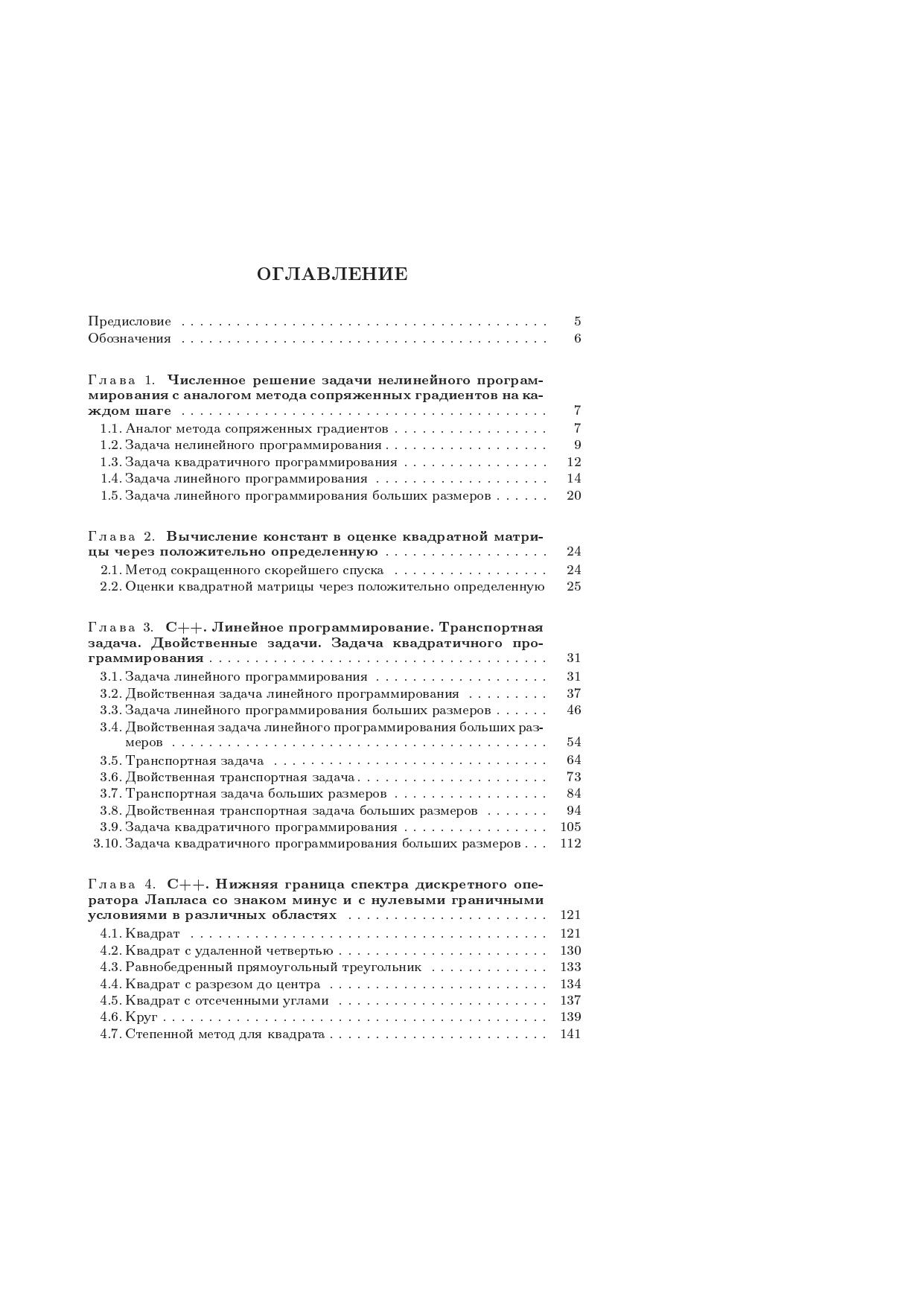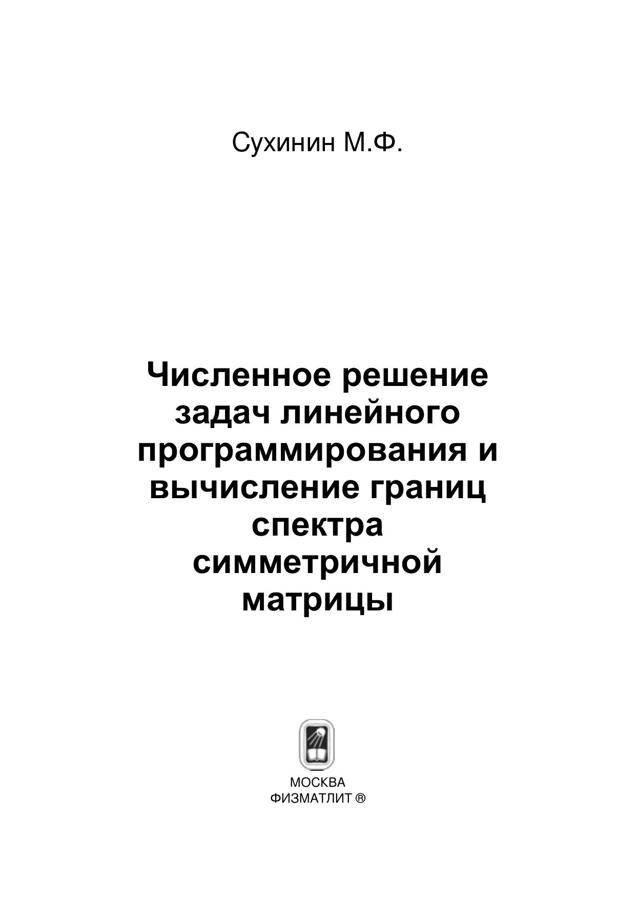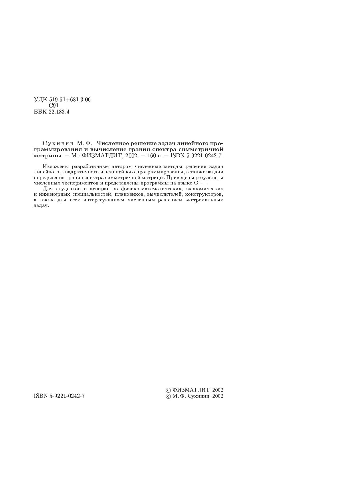 Изложены разработанные автором численные методы решения задач линейного, квадратичного и нелинейного программирования, а также задачи определения границ спектра симметричной матрицы. Приведены результаты численных экспериментов и представлены программы на языке C++. Для студентов и аспирантов физико-математических, экономических и инженерных специальностей, плановиков, вычислителей, конструкторов, а также для всех интересующихся численным решением экстремальных задач.