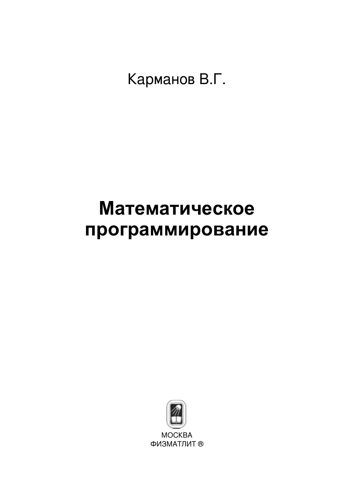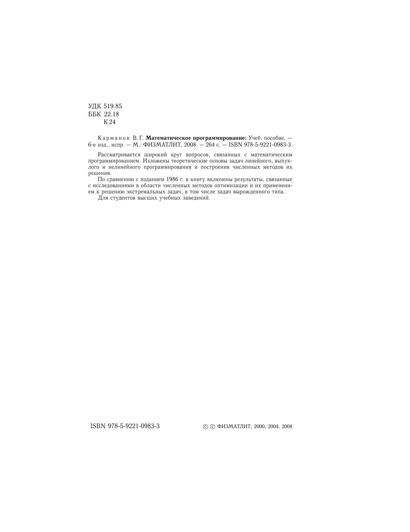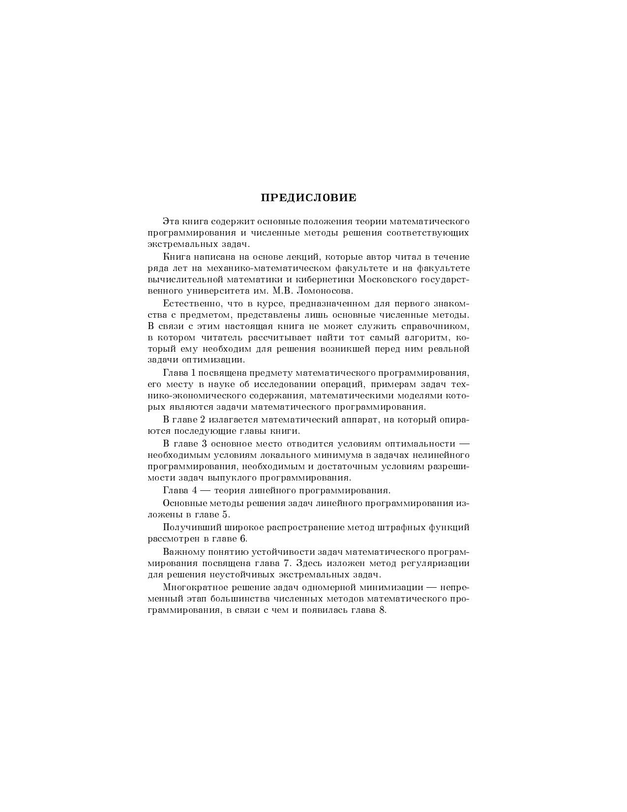 Рассматривается широкий круг вопросов, связанных с математическим программированием. Изложены теоретические основы задач линейного, выпуклого и нелинейного программирования и построения численных методов для их решения. По сравнению с изданием 1986 г. в книгу включены результаты, связанные с исследованиями в области численных методов оптимизации и их применением к решению экстремальных задач, в том числе задач вырожденного типа. Для студентов высших учебных заведений.