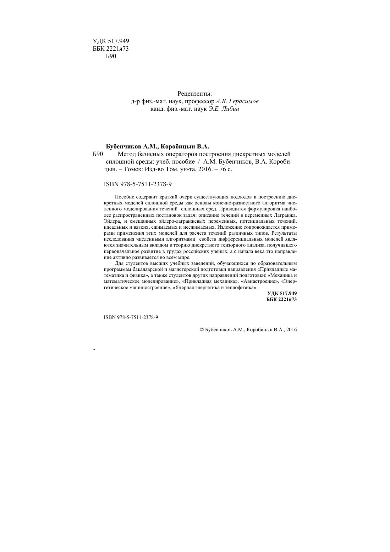 Пособие содержит краткий очерк существующих подходов к построению дискретных моделей сплошной среды как основы конечно-разностного алгоритма численного моделирования течений сплошных сред. Приводится формулировка наиболее распространенных постановок задач: описание течений в переменных Лагранжа, Эйлера, и смешанных эйлеро-лагранжевых переменных, потенциальных течений, идеальных и вязких, сжимаемых и несжимаемых. Изложение сопровождается примерами применения этих моделей для расчета течений различных типов. Результаты исследования численными алгоритмами свойств дифференциальных моделей являются значительным вкладом в теорию дискретного тензорного анализа, получившего первоначальное развитие в трудах российских ученых, а с начала века это направление активно развивается во всем мире. Для студентов высших учебных заведений, обучающихся по образовательным программам бакалаврской и магистерской подготовки направления «Прикладные математика и физика», а также студентов других направлений подготовки: «Механика и математическое моделирование», «Прикладная механика», «Авиастроение», «Энергетическое машиностроение», «Ядерная энергетика и теплофизика».