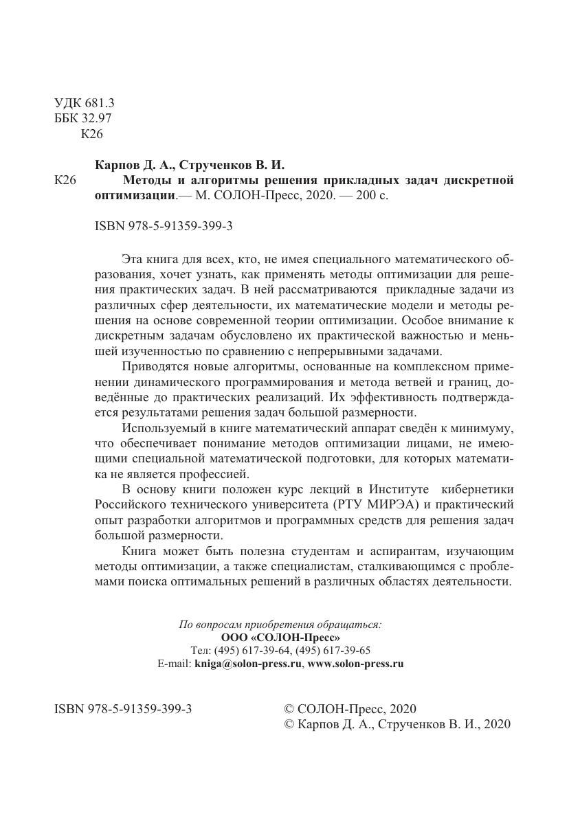 Учебное пособие. Эта книга для всех, кто, не имея специального математического образования, хочет узнать, как применять методы оптимизации для решения практических задач. В ней рассматриваются прикладные задачи из различных сфер деятельности, их математические модели и методы решения на основе современной теории оптимизации. Особое внимание к дискретным задачам обусловлено их практической важностью и меньшей изученностью по сравнению с непрерывными задачами.