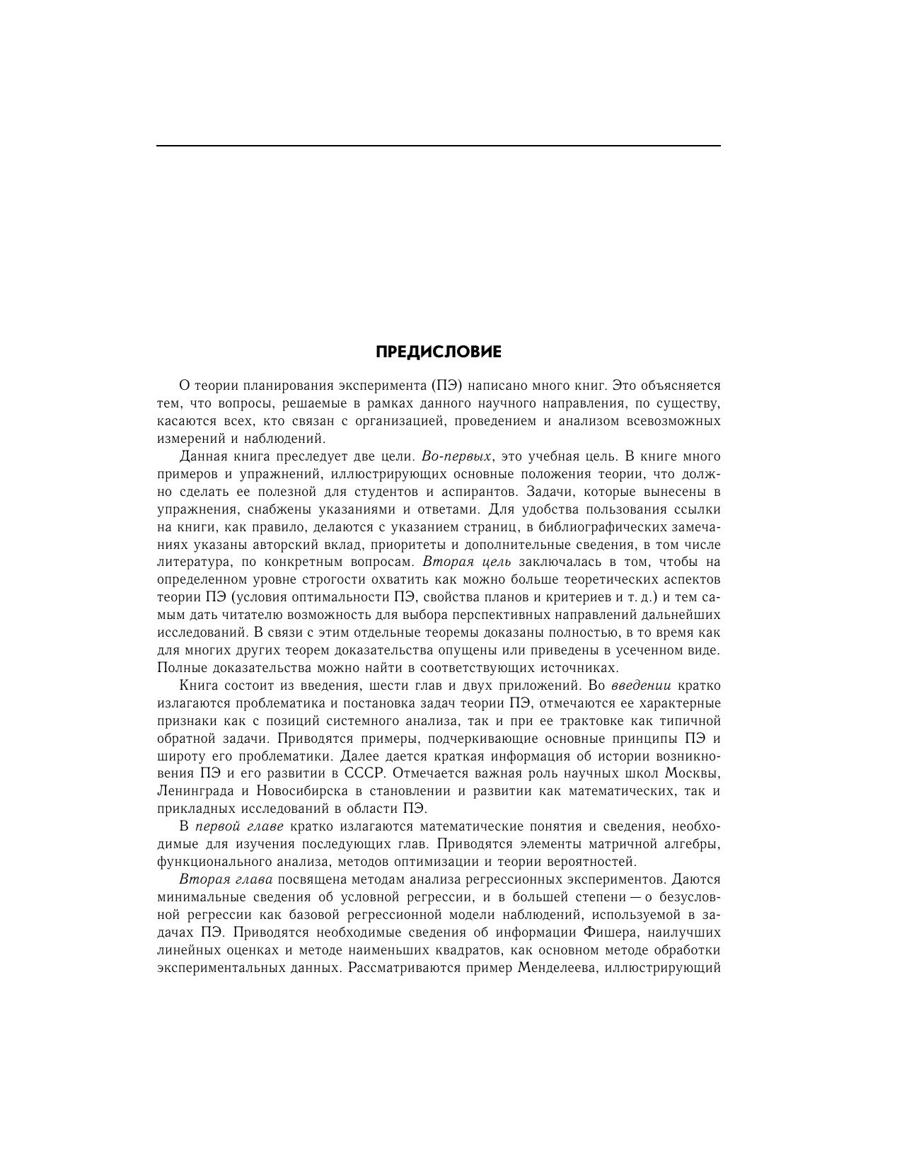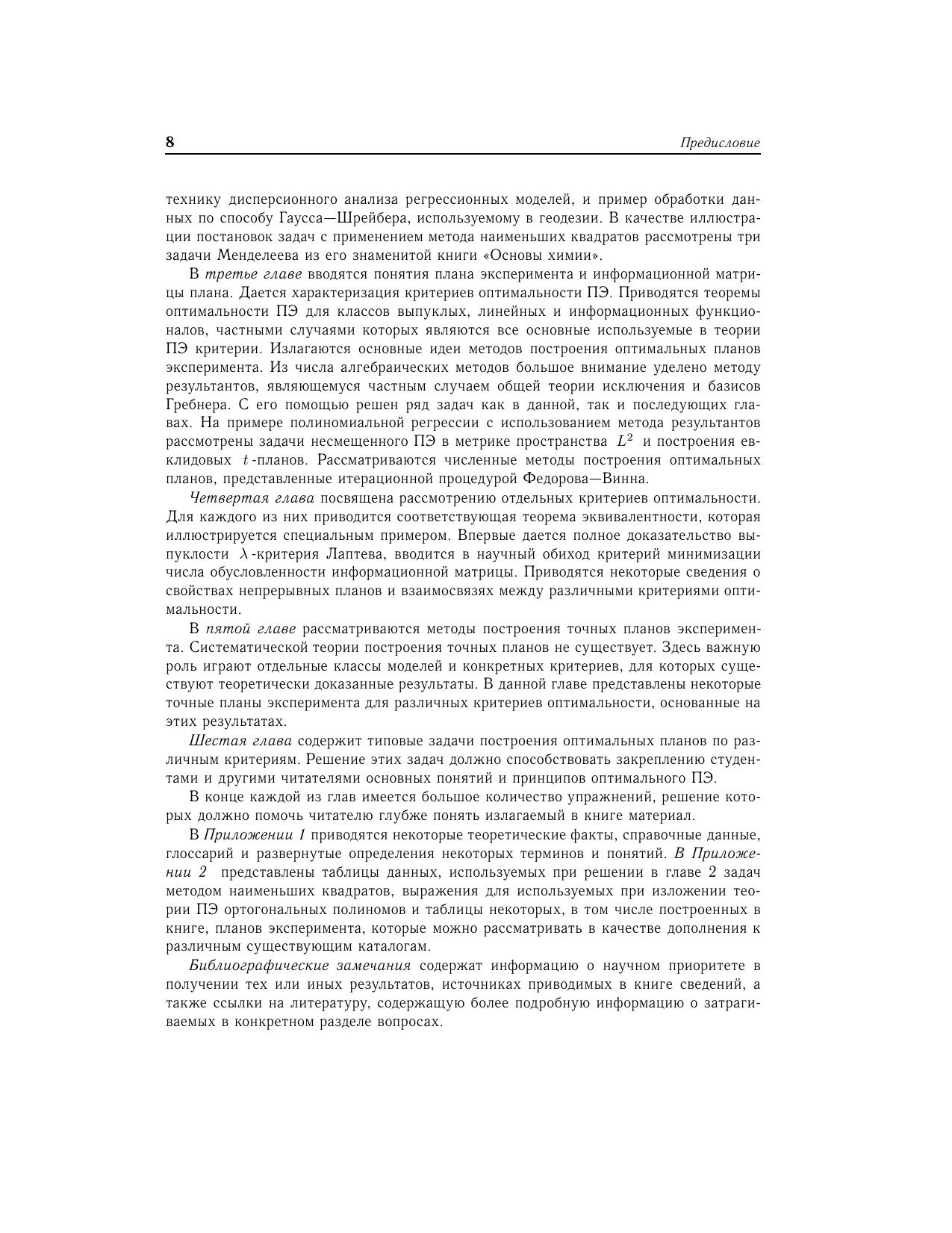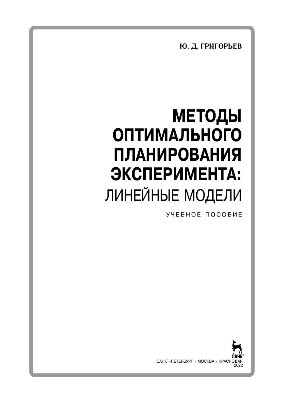 В пособии дается изложение основных идей и методов оптимального планирования эксперимента для линейных моделей регрессии. Отмечается связь задач планирования с некоторыми способами измерений по методу наименьших квадратов, применяемыми в навигации, геодезии, метрологии, сейсмологии, химии и других областях. Рассматриваются конкретные прикладные задачи оценивания, решаемые с помощью метода наименьших квадратов. На примере полиномиальных моделей подробно рассмотрена методика проверки планов эксперимента на оптимальность с помощью соответствующих теорем эквивалентности. С целью более глубокого усвоения представленного материала книга снабжена большим количеством примеров и упражнений. Отдельная глава посвящена типовым задачам планирования эксперимента, которые можно использовать в качестве курсовых заданий и других форм самостоятельной работы студентов. Для студентов, обучающихся по специальности или направлению «Прикладная математика и информатика».