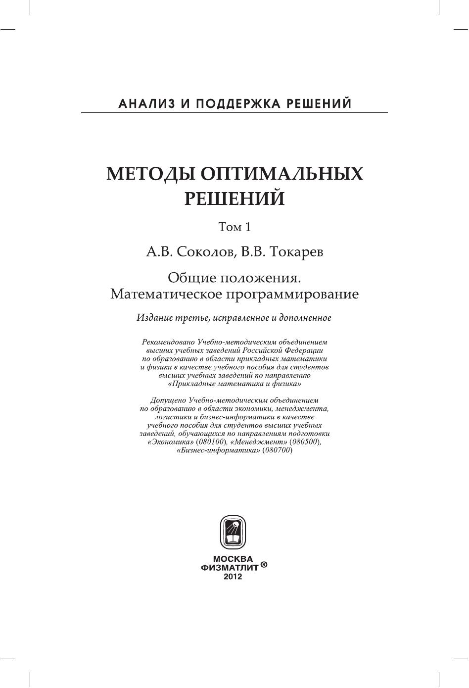Учебное пособие посвящено математической теории и методам оптимизации с ориентацией на проблемы принятия управленческих решений в экономических системах. Наряду с классическими разделами теории оптимизации в статике и динамике излагаются многокритериальный выбор, игровой и вероятностный подходы к управлению в условиях неопределенности. У читателей предполагается знание основ математического анализа и линейной алгебры, а также начал теории вероятностей, хотя необходимые сведения из этих курсов в конспективной форме приводятся в приложениях. Для студентов, аспирантов и преподавателей вузов по направлениям: экономика, менеджмент, бизнес-информатика, прикладные математика и физика.