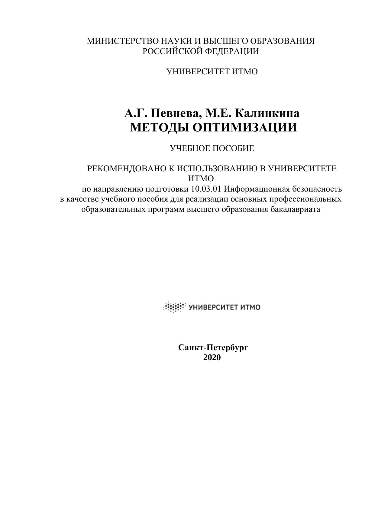 В пособии рассматривается широкий круг задач математического программирования. Изложены аналитические и численные методы решения задач оптимизации. Применение каждого метода иллюстрируется решениями типовых примеров. Приведены задачи для самостоятельного решения. Целью данного пособия является первоначальное знакомство с алгоритмами оптимизации, а также формирование понимания идейных основ этих алгоритмов. Учебное пособие предназначено для обучения бакалавров по направлению подготовки 10.03.01 "Информационная безопасность", специальности 10.03.01 - "Организация и технология защиты информации" факультета безопасности информационных технологий по дисциплине "Методы оптимизации".