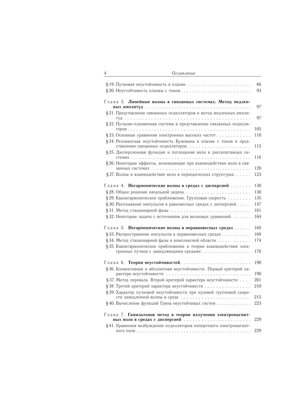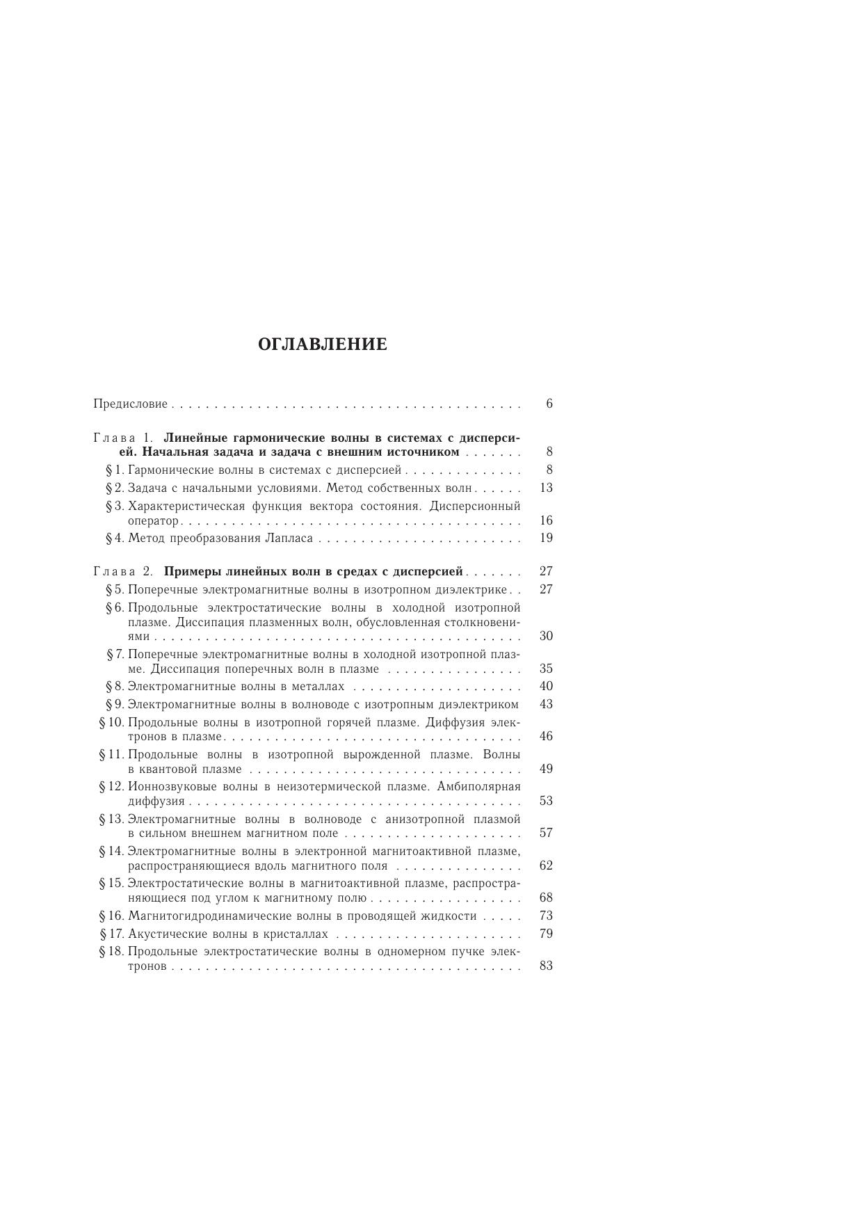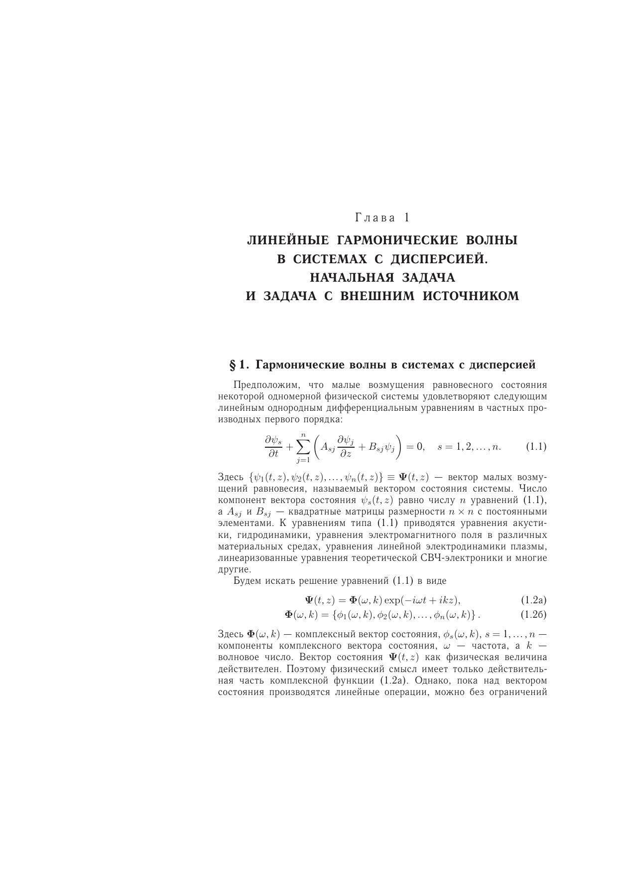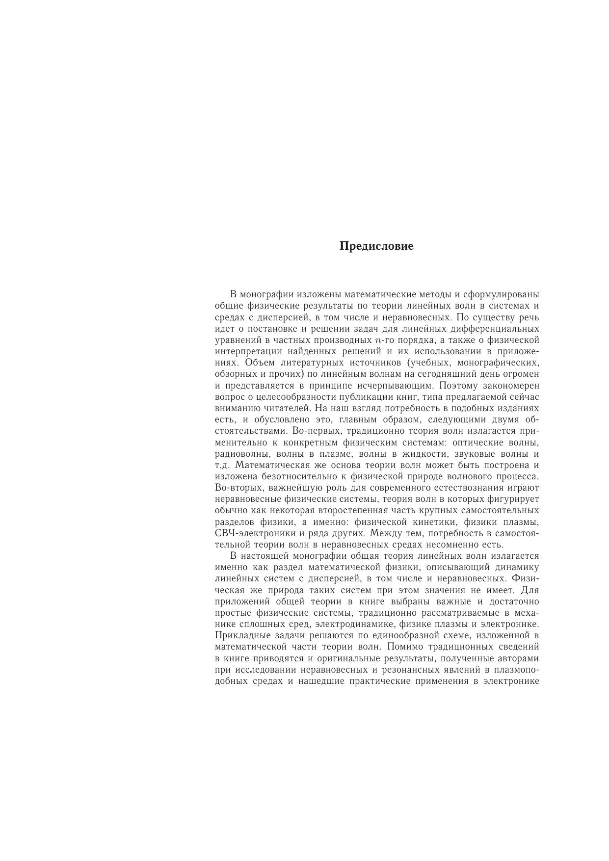 Изложены основные математические методы описания и общие вопросы теории линейных волн в системах и средах с дисперсией, в том числе и неравновесных. В качестве приложений общей теории в книге с единой точки зрения рассмотрены важные физические системы, традицион-но изучаемые в механике сплошных сред, электродинамике, физике плазмы, электронике и физической кинетике. Исследованы также взаимодействие волн в связанных системах, рас-пространение и эволюция локализованных волновых возмущений, излучение волн в диспер-гирующих средах внешними источниками, совершающими заданное движение. Изложена общая теория неустойчивостей линейных систем, в которой сформулированы и сопоставле-ны критерии абсолютности и конвективности неустойчивостей и вычислены функции Грина некоторых неравновесных сред. Особое внимание уделено вопросам теории электромагнит-ных линейных волн в плазме и плазмоподобных средах. В книгу также включен ряд оригинальных результатов современной теории волн, освещенных до настоящего времени только в научных журналах. Для научных работников и специалистов, работающих в области электродинамики и механики сплошных сред, физической электроники, радиофизики, а также аспирантов и сту-дентов вузов, специализирующихся в этих областях.