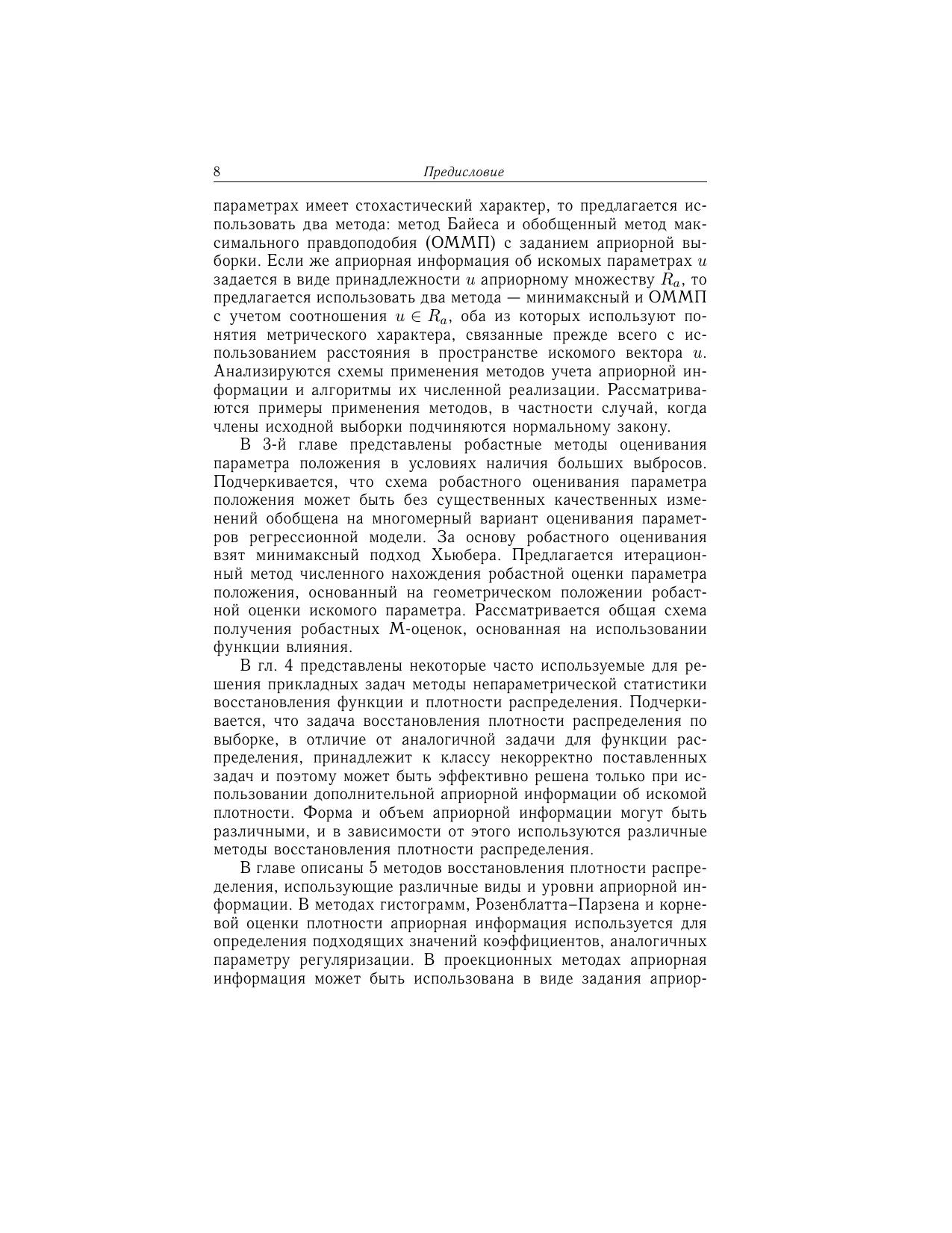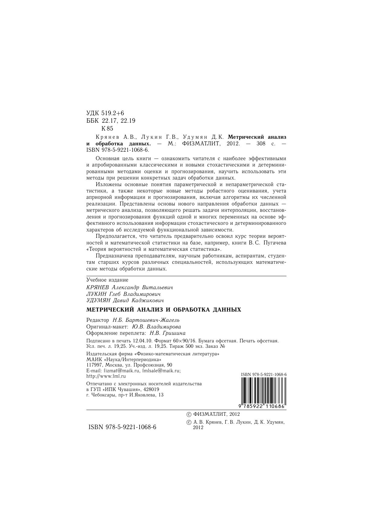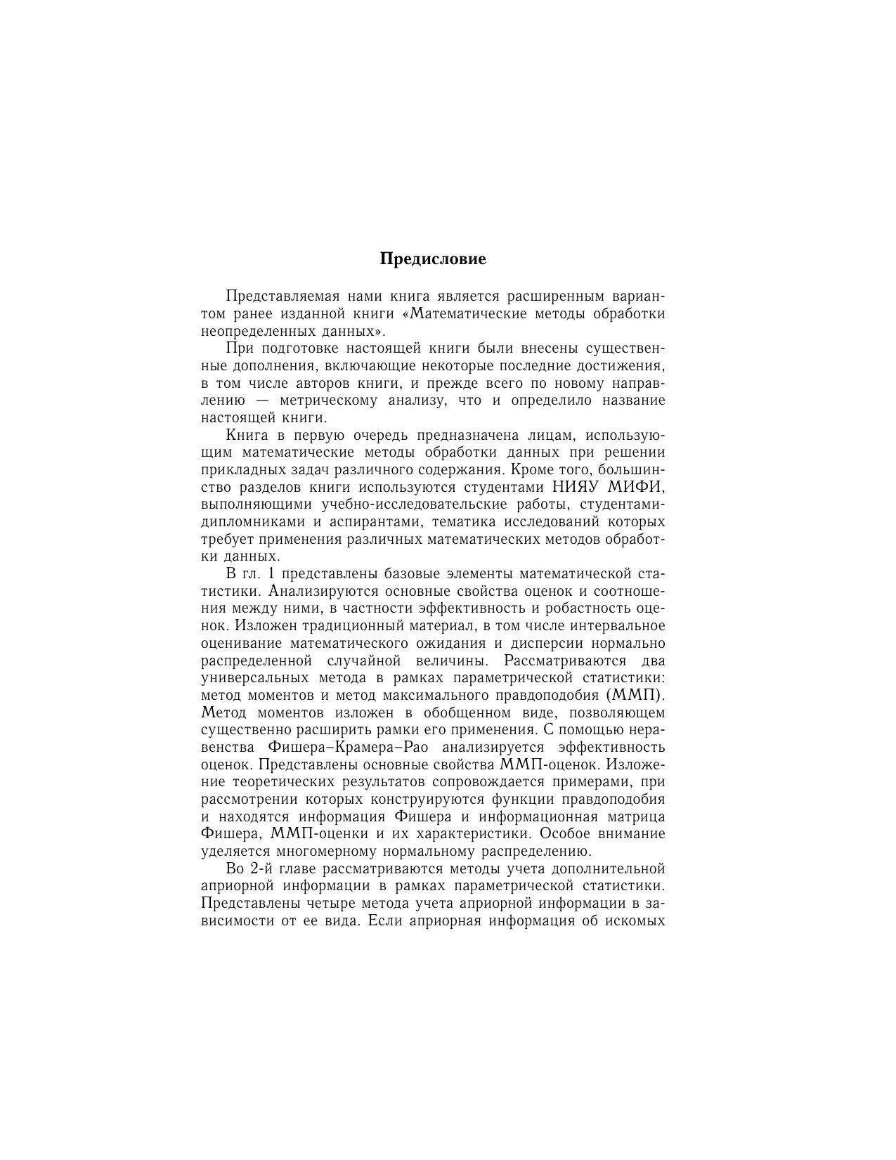 Основная цель книги – ознакомить читателя с наиболее эффективными и апробированными классическими и новыми стохастическими и детерминированными методами оценки и прогнозирования, научить использовать эти методы при решении конкретных задач обработки данных. В книге изложены основные понятия параметрической и непараметрической статистики, а также некоторые новые методы робастного оценивания, учета априорной информации и прогнозирования, включая алгоритмы их численной реализации. Представлены основы нового направления обработки данных - метрического анализа, позволяющего решать задачи интерполяции, восстановления и прогнозирования функций одной и многих переменных на основе эффективного использования информации стохастического и детерминированного характеров об исследуемой функциональной зависимости. Предполагается, что читатель предварительно освоил курс теории вероятностей и математической статистики на базе, например, книги В.С. Пугачева «Теория вероятностей и математическая статистика». Предназначено преподавателям, научным работникам, аспирантам, студентам старших курсов различных специальностей, использующих математические методы обработки данных.