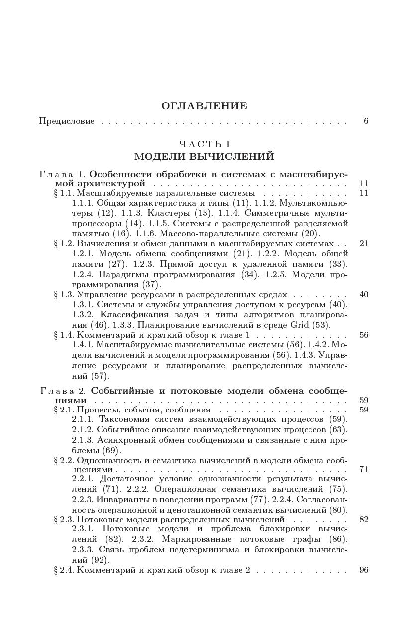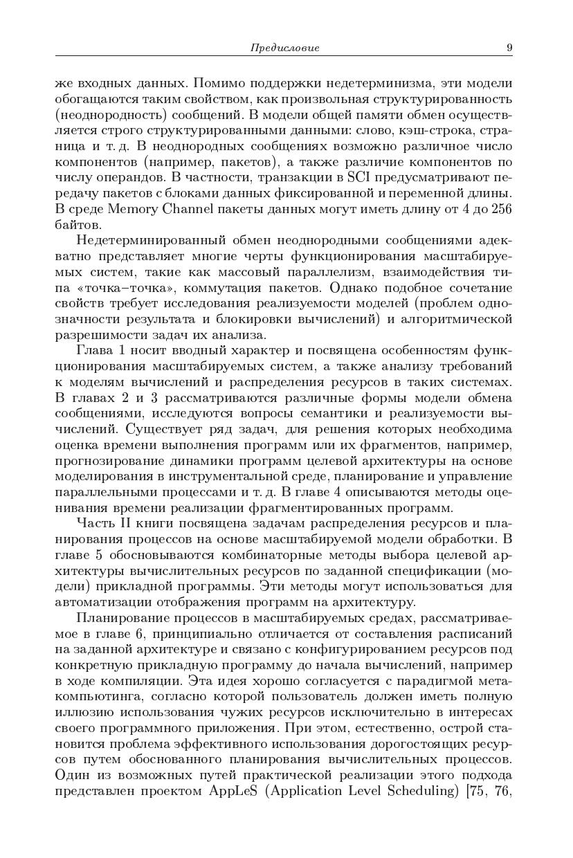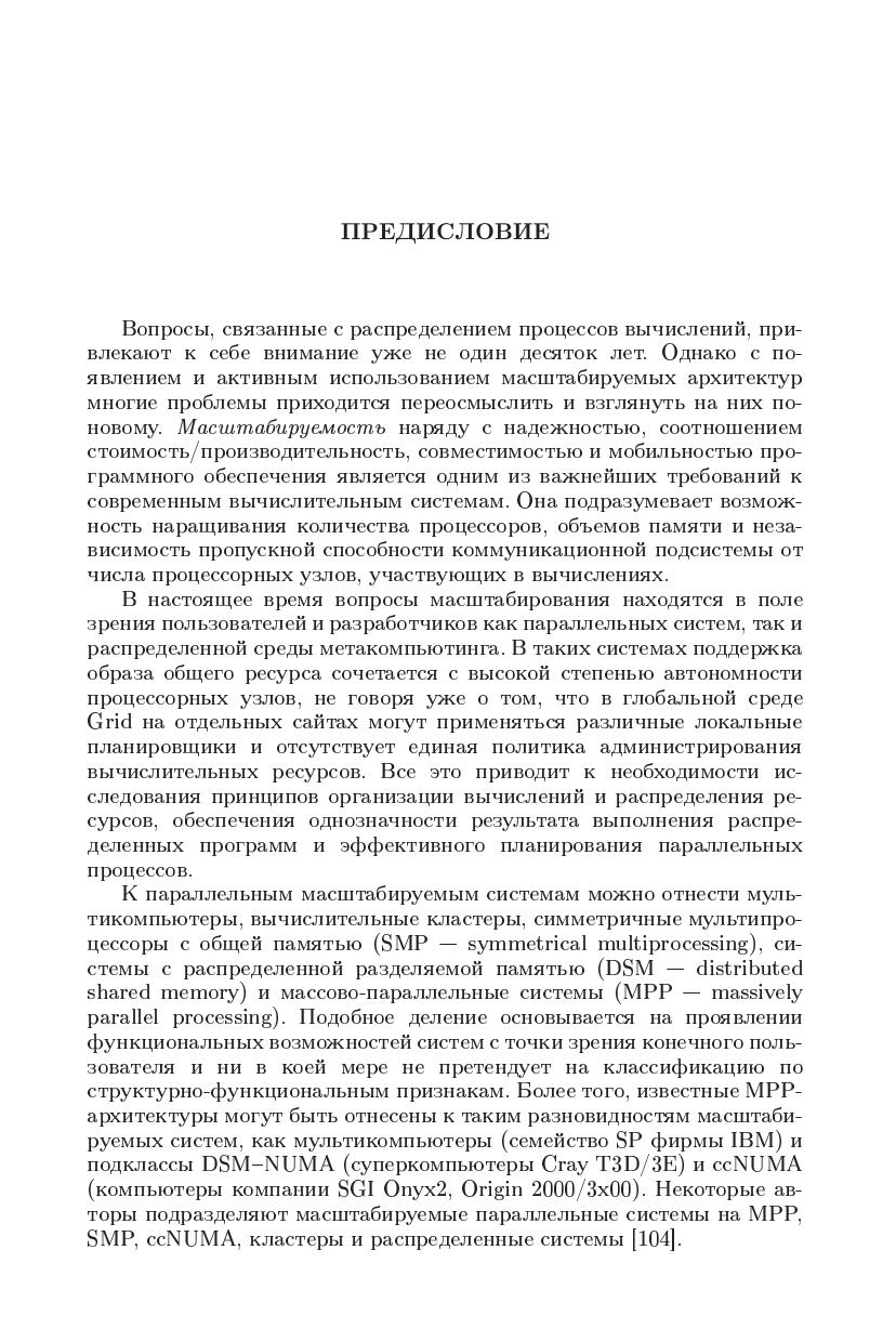Монография обобщает результаты исследований в области распределенных вычислений в масштабируемых средах, к которым можно отнести мультикомпьютеры, кластеры, симметричные мультипроцессоры, системы с распределенной памятью и ресурсы метакомпьютинга. Основное внимание уделяется различными формам модели обмена сообщениями иее реализуемости, в том числе архитектумами с общей паматью. Рассматриваются вопросы семантики, однозначности результата и блокировки вычислений. Изучаются методы анализасвойств распределенных программ на маркированных графах и исследуется проблема алгоритмической разрешимости задачианализа. Обосновываются принципы прогнозирования времени выполнения программ и их отображения на целевую архитектуру. Предлагаются методы планирования параллельных процессов в распределенных средах на основе масштабируемых моделей обработки.
