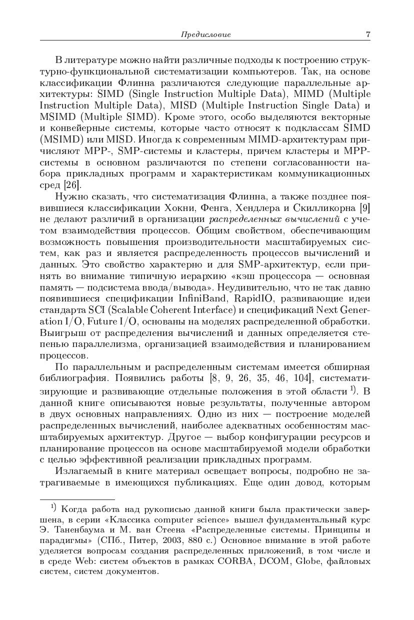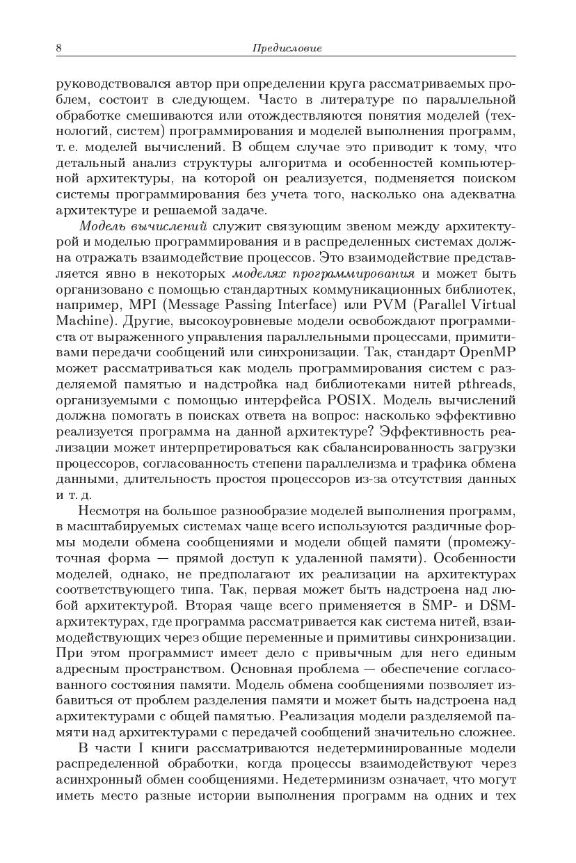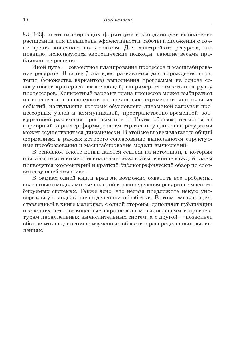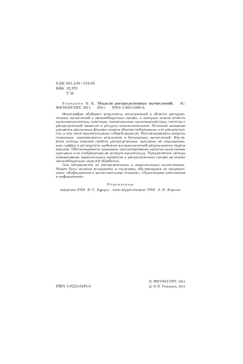Монография обобщает результаты исследований в области распределенных вычислений в масштабируемых средах, к которым можно отнести мультикомпьютеры, кластеры, симметричные мультипроцессоры, системы с распределенной памятью и ресурсы метакомпьютинга. Основное внимание уделяется различными формам модели обмена сообщениями иее реализуемости, в том числе архитектумами с общей паматью. Рассматриваются вопросы семантики, однозначности результата и блокировки вычислений. Изучаются методы анализасвойств распределенных программ на маркированных графах и исследуется проблема алгоритмической разрешимости задачианализа. Обосновываются принципы прогнозирования времени выполнения программ и их отображения на целевую архитектуру. Предлагаются методы планирования параллельных процессов в распределенных средах на основе масштабируемых моделей обработки.