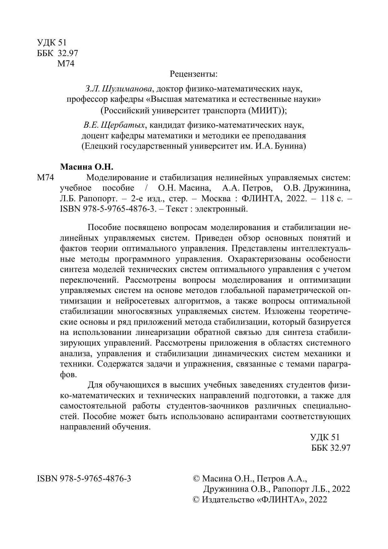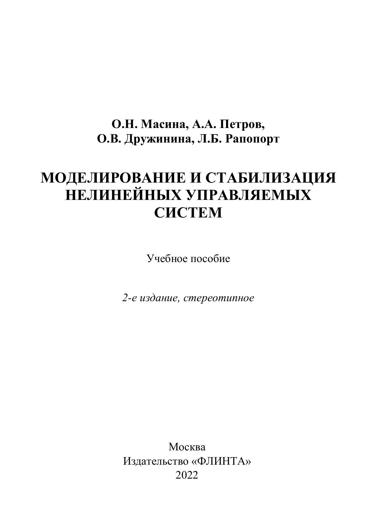 Пособие посвящено вопросам моделирования и стабилизации нелинейных управляемых систем. Приведен обзор основных понятий и фактов теории оптимального управления. Представлены интеллектуальные методы программного управления. Охарактеризованы особености синтеза моделей технических систем оптимального управления с учетом переключений. Рассмотрены вопросы моделирования и оптимизации управляемых систем на основе методов глобальной параметрической оптимизации и нейросетевых алгоритмов, а также вопросы оптимальной стабилизации многосвязных управляемых систем. Изложены теоретические основы и ряд приложений метода стабилизации, который базируется на использовании линеаризации обратной свяязью для синтеза стабилизирующих управлений. Рассмотрены приложения в областях системного анализа, управления и стабилизации динамических систем механики и техники. Содержатся задачи и упражнения, связанные с темами параграфов.