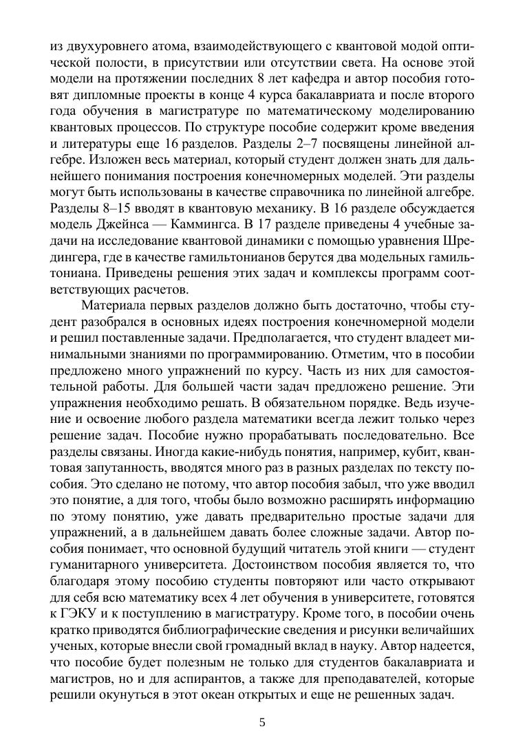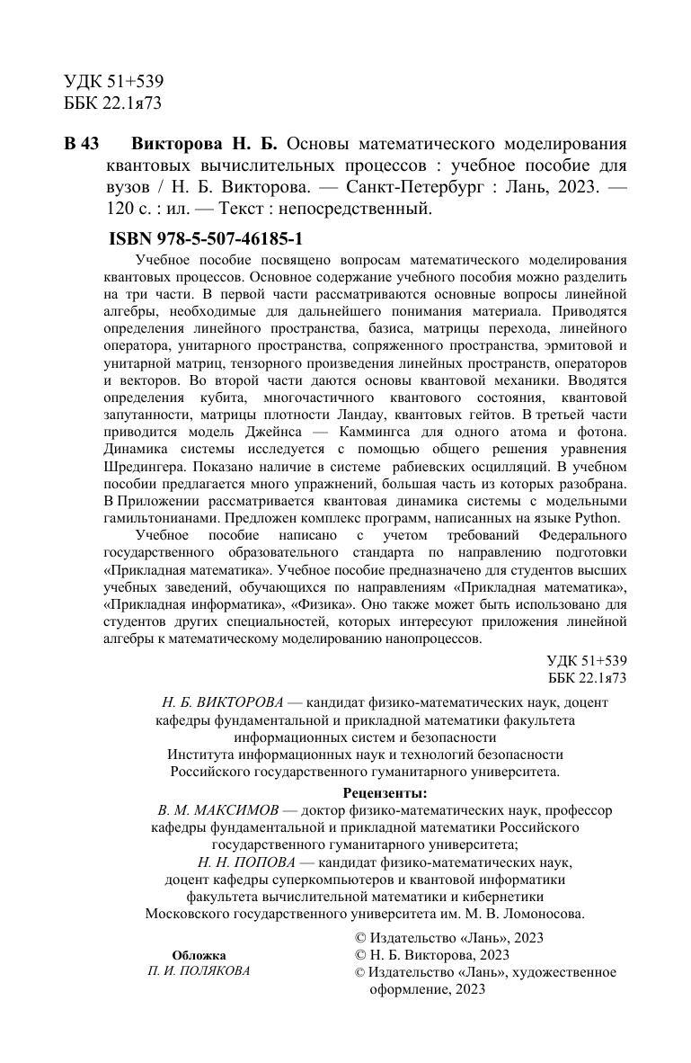 Учебное пособие посвящено вопросам математического моделирования квантовых процессов. Основное содержание учебного пособия можно разделить на три части. В первой части рассматриваются основные вопросы линейной алгебры, необходимые для дальнейшего понимания материала. Приводятся определения линейного пространства, базиса, матрицы перехода, линейного оператора, унитарного пространства, сопряженного пространства, эрмитовой и унитарной матриц, тензорного произведения линейных пространств, операторов и векторов. Во второй части даются основы квантовой механики. Вводятся определения кубита, многочастичного квантового состояния, квантовой запутанности, матрицы плотности Ландау, квантовых гейтов. В третьей части приводится модель Джейнса — Каммингса для одного атома и фотона. Динамика системы исследуется с помощью общего решения уравнения Шредингера. Показано наличие в системе рабиевских осцилляций. В учебном пособии предлагается много упражнений, большая часть из которых разобрана. В Приложении рассматривается квантовая динамика системы с модельными гамильтонианами. Предложен комплекс программ, написанных на языке Python. Учебное пособие написано с учетом требований Федерального государственного образовательного стандарта по направлению подготовки «Прикладная математика». Учебное пособие предназначено для студентов высших учебных заведений, обучающихся по направлениям «Прикладная математика», «Прикладная информатика», «Физика». Оно также может быть использовано для студентов других специальностей, которых интересуют приложения линейной алгебры к математическому моделированию нанопроцессов.
