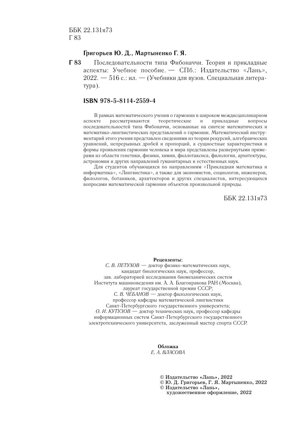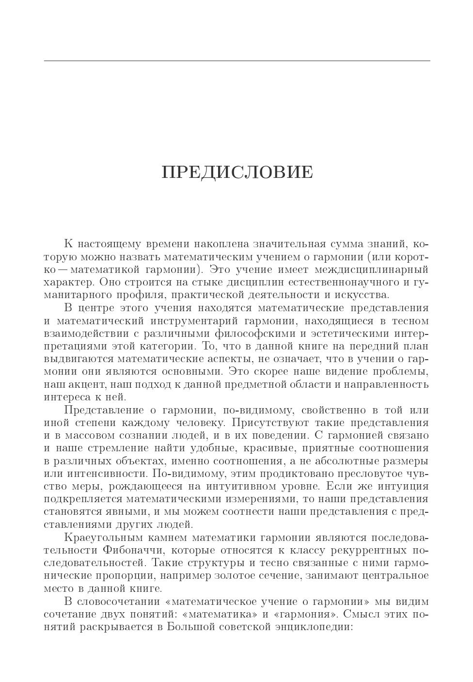 В рамках математического учения о гармонии в широком междисциплинарном аспекте рассматриваются теоретические и прикладные вопросы последовательностей Фибоначчи, основанные на синтезе математических и математико-лингвистических представлений о гармонии. Математический инструментарий этого учения представлен сведениями из теории рекурсий, алгебраических уравнений, непрерывных дробей и пропорций, а сущностные характеристики и формы проявления гармонии человека и мира представлены развернутыми примерами из области генетики, физики, химии, филлотаксиса, филологии, архитектуры, астрономии и других направлений гуманитарных и естественных наук. Для студентов обучающихся по направлениям «Прикладная математика и информатика», «Лингвистика», а также для экономистов, социологов, инженеров, филологов, ботаников, архитекторов и других специалистов, интересующихся вопросами математической гармонии объектов произвольной природы.