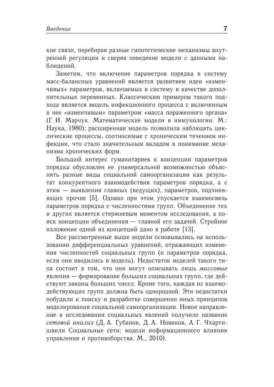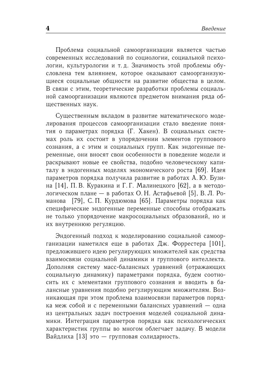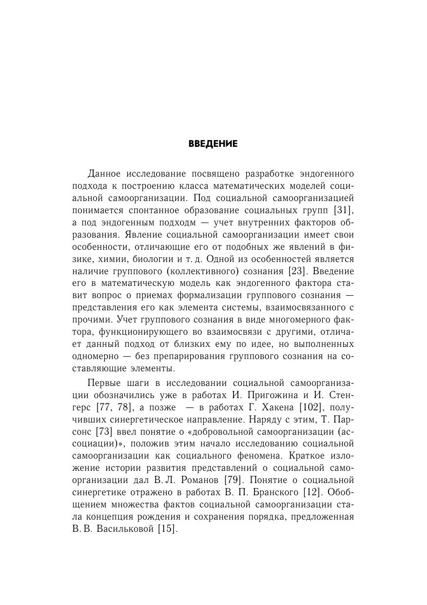 Излагаются принципы математического моделирования самоорганизующихся социальных систем (социальных групп, общественных движений, массовых процессов). В основу построения непрерывных моделей берется принцип эндогенного расширения, состоящий в дополнении уравнений эволюции динамическими уравнениям для группового сознания. В случае дискретных моделей эндогенное расширение сводится к окаймлению матрицы взаимодополнений строкой и столбцом для новичка. Приводятся модели образования инициативных групп, общественных движений, молодежных субкультур, а также – деловых и досуговых групп, спортивных команд. Рассматриваются модели социальных сетей и их конформное преобразование. Пособие предназначена для студентов и аспирантов факультетов прикладной математики университетов, а также для специалистов по математической социологии.