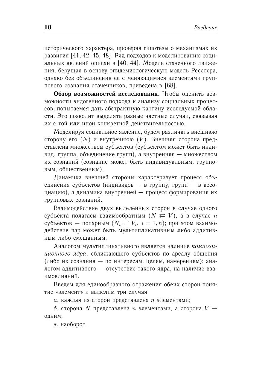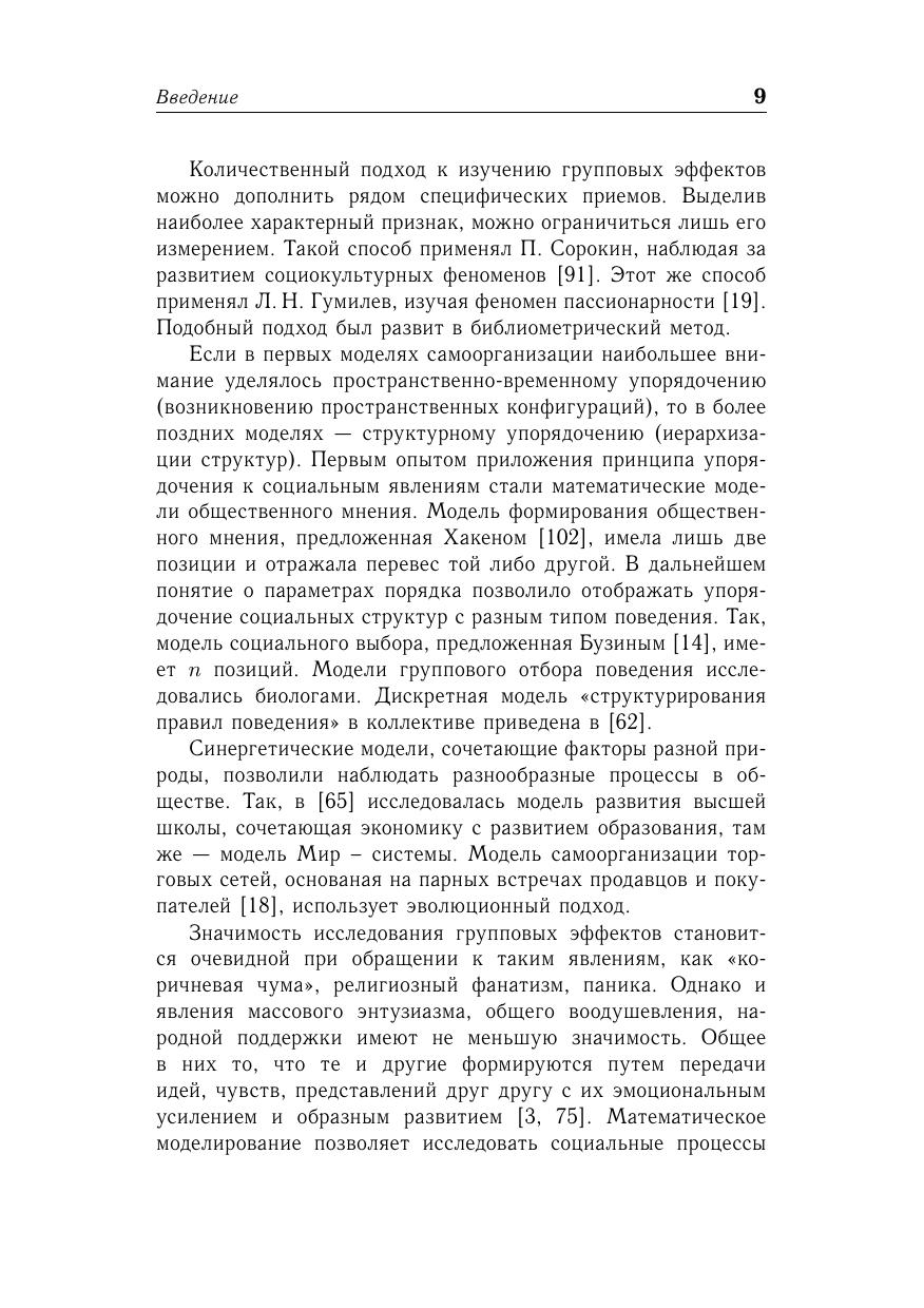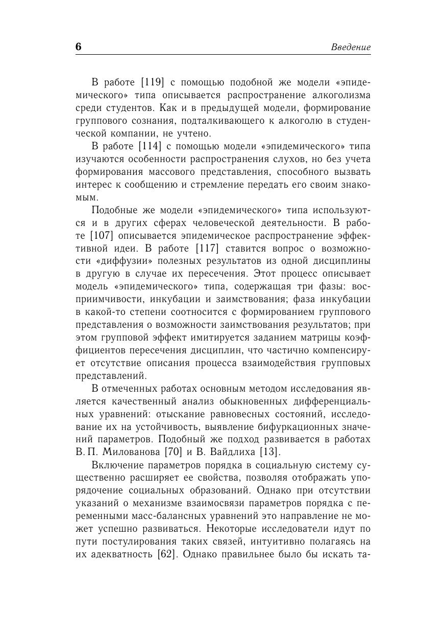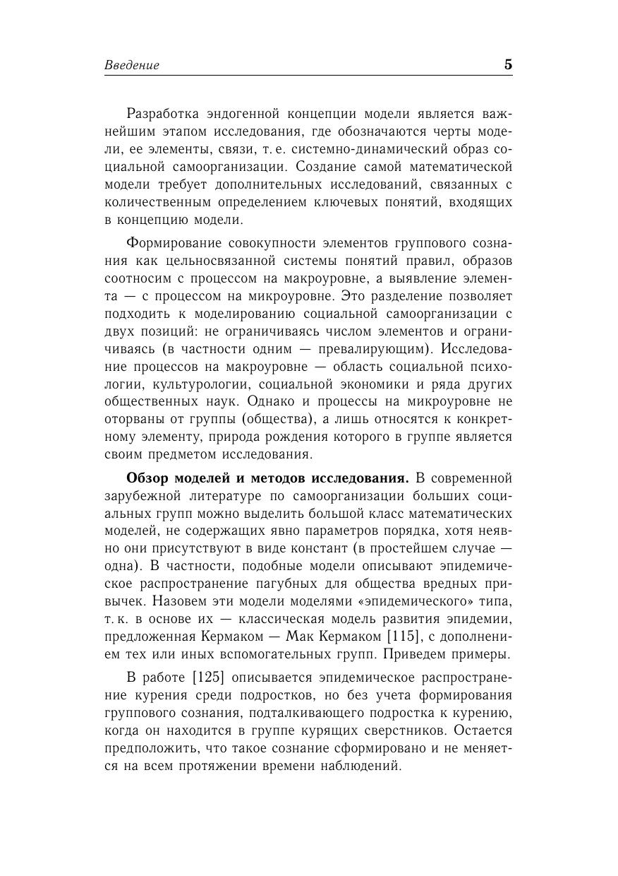 Излагаются принципы математического моделирования самоорганизующихся социальных систем (социальных групп, общественных движений, массовых процессов). В основу построения непрерывных моделей берется принцип эндогенного расширения, состоящий в дополнении уравнений эволюции динамическими уравнениям для группового сознания. В случае дискретных моделей эндогенное расширение сводится к окаймлению матрицы взаимодополнений строкой и столбцом для новичка. Приводятся модели образования инициативных групп, общественных движений, молодежных субкультур, а также – деловых и досуговых групп, спортивных команд. Рассматриваются модели социальных сетей и их конформное преобразование. Пособие предназначена для студентов и аспирантов факультетов прикладной математики университетов, а также для специалистов по математической социологии.