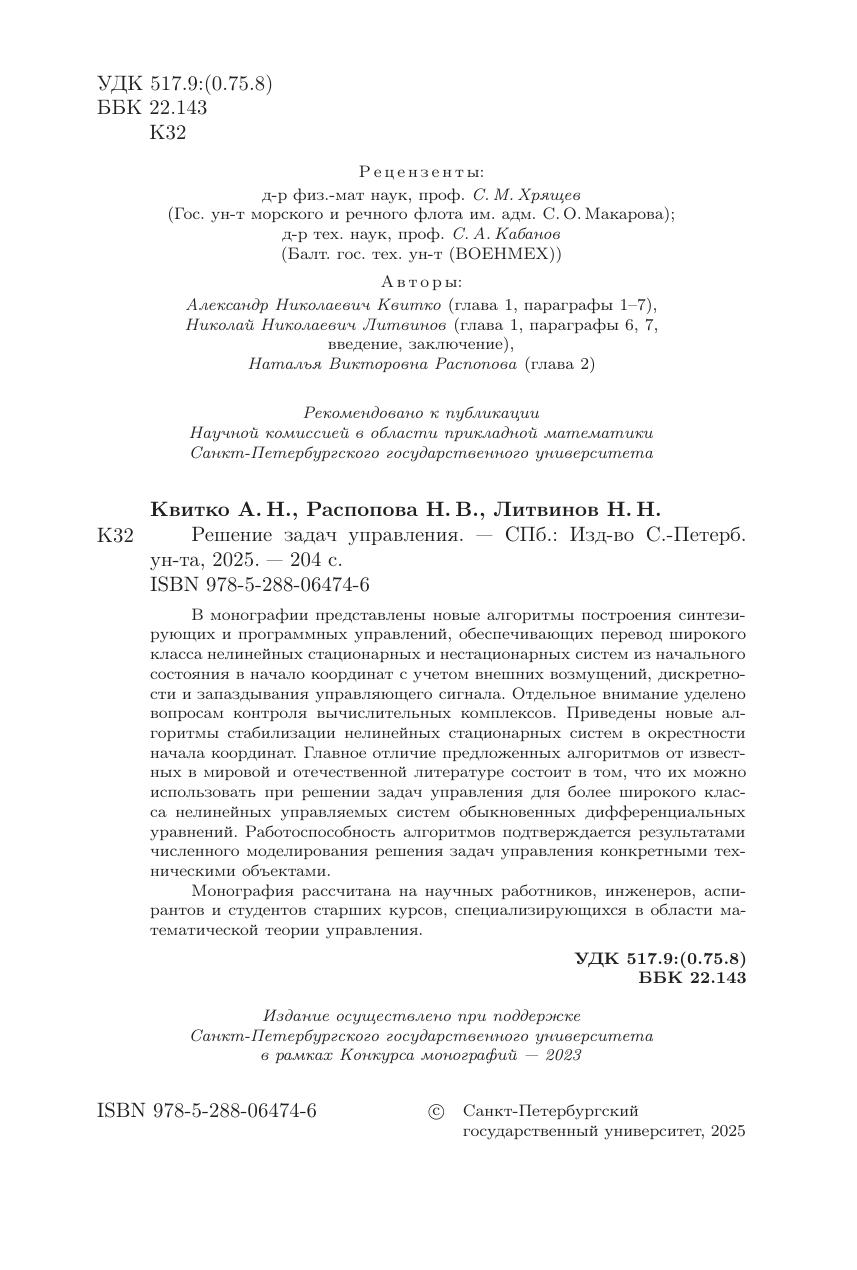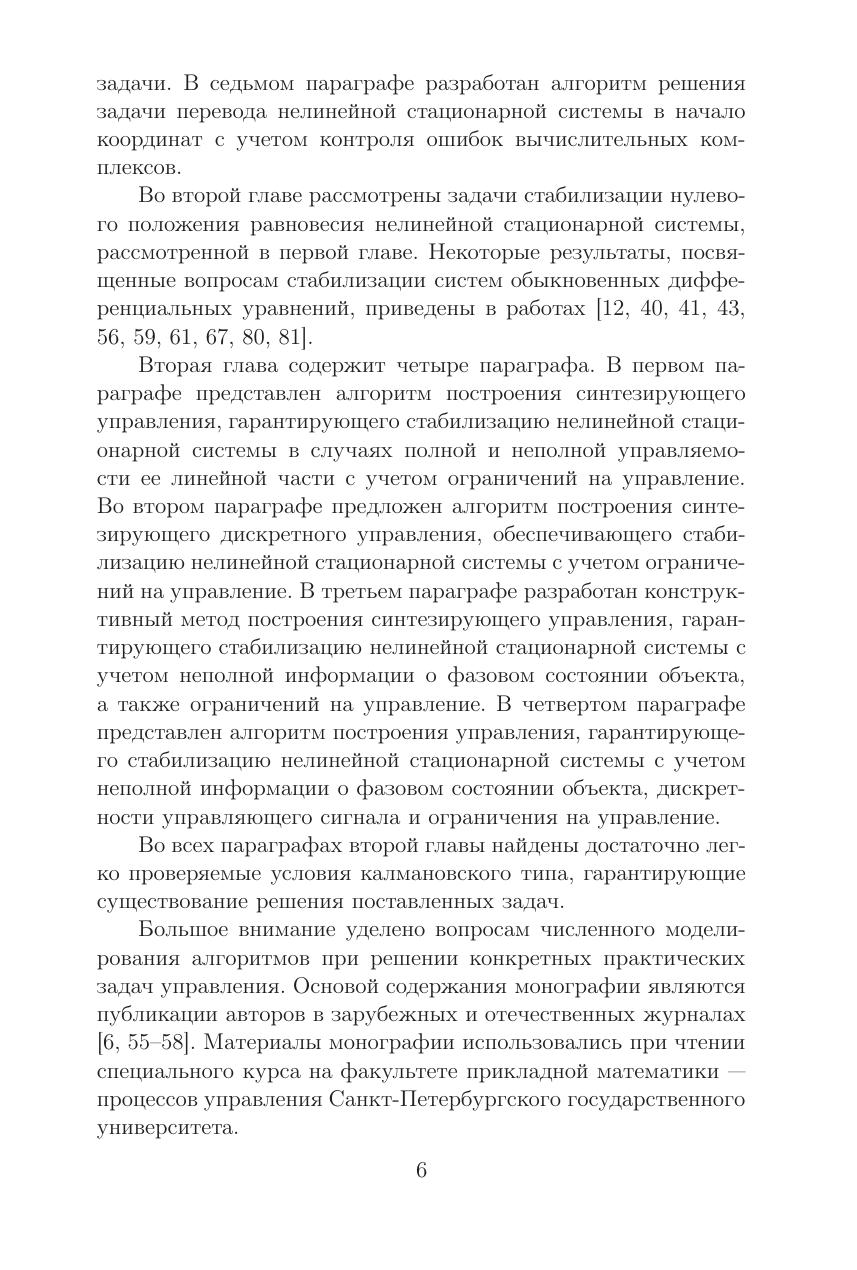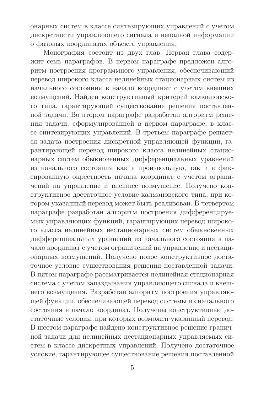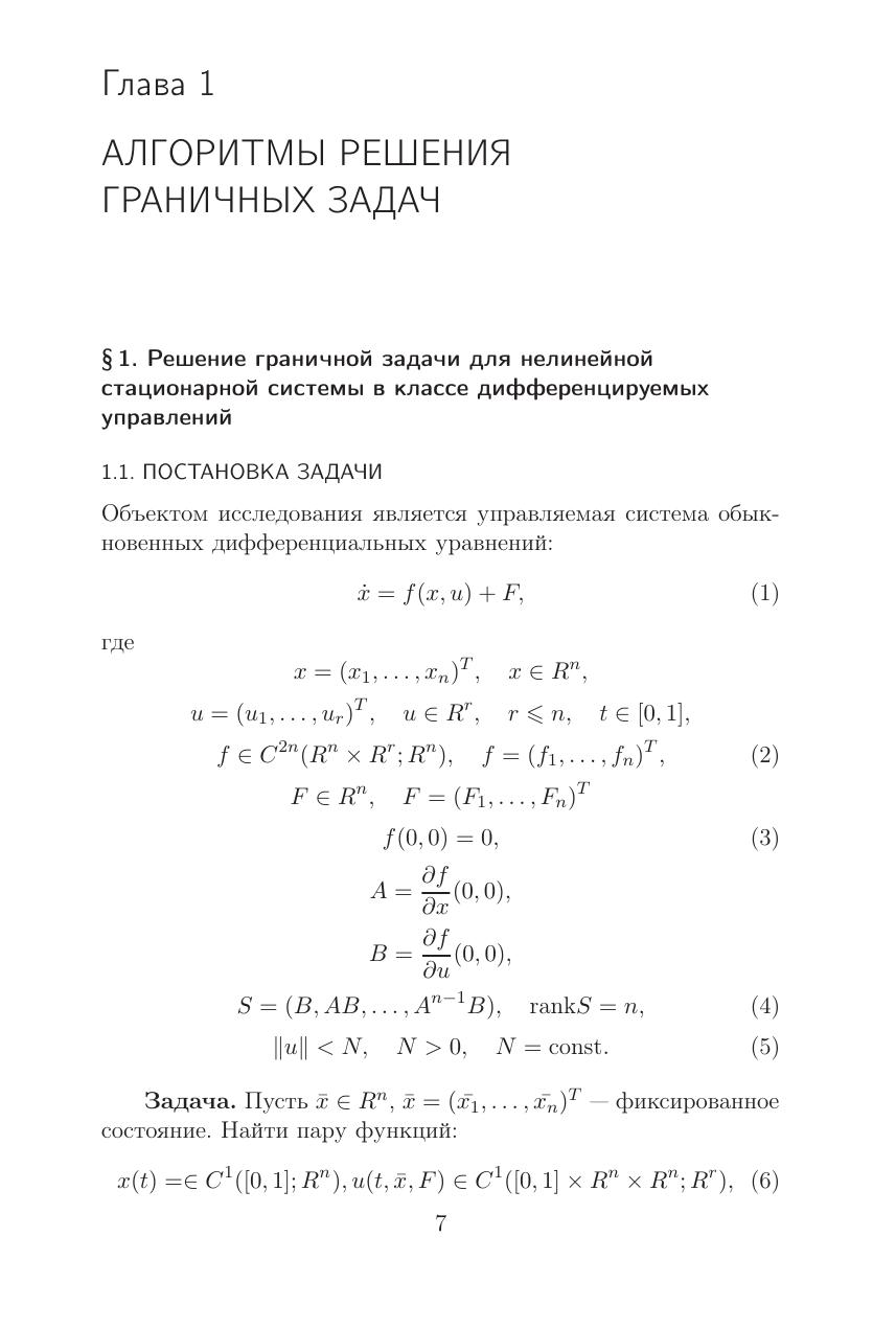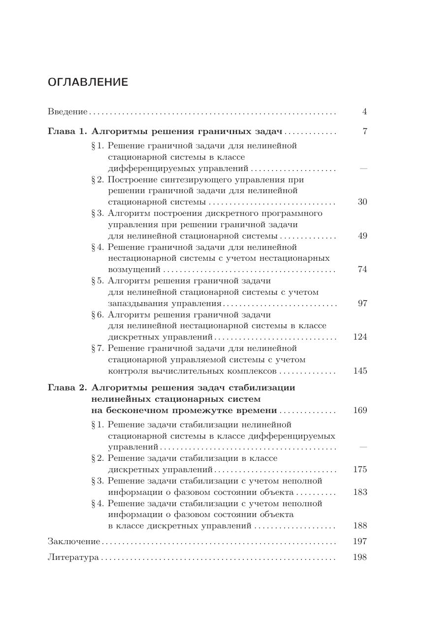 В монографии представлены новые алгоритмы построения синтезирующих и программных управлений, обеспечивающих перевод широкого класса нелинейных стационарных и нестационарных систем из начального состояния в начало координат с учетом внешних возмущений, дискретности и запаздывания управляющего сигнала. Отдельное внимание уделено вопросам контроля вычислительных комплексов. Приведены новые алгоритмы стабилизации нелинейных стационарных систем в окрестности начала координат. Главное отличие предложенных алгоритмов от известных в мировой и отечественной литературе состоит в том, что их можно использовать при решении задач управления для более широкого класса нелинейных управляемых систем обыкновенных дифференциальных уравнений. Работоспособность алгоритмов подтверждается результатами численного моделирования решения задач управления конкретными техническими объектами. Монография рассчитана на научных работников, инженеров, аспирантов и студентов старших курсов, специализирующихся в области математической теории управления.