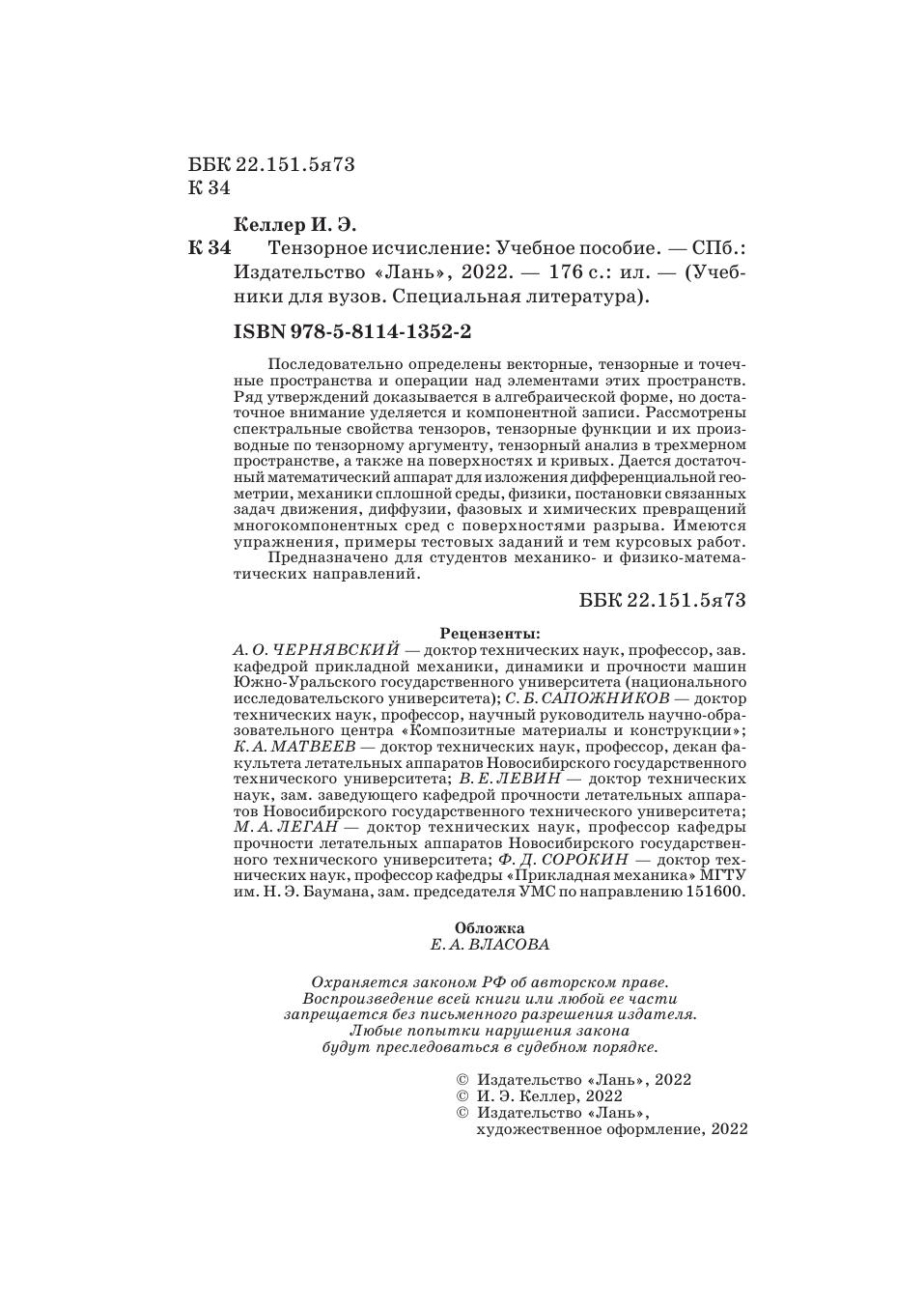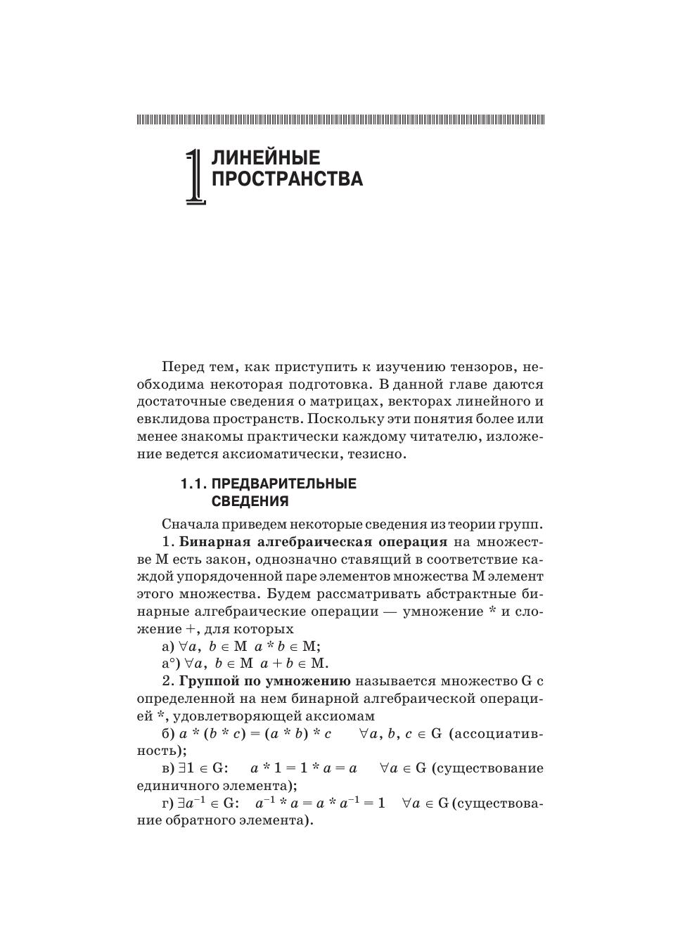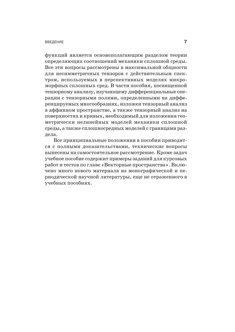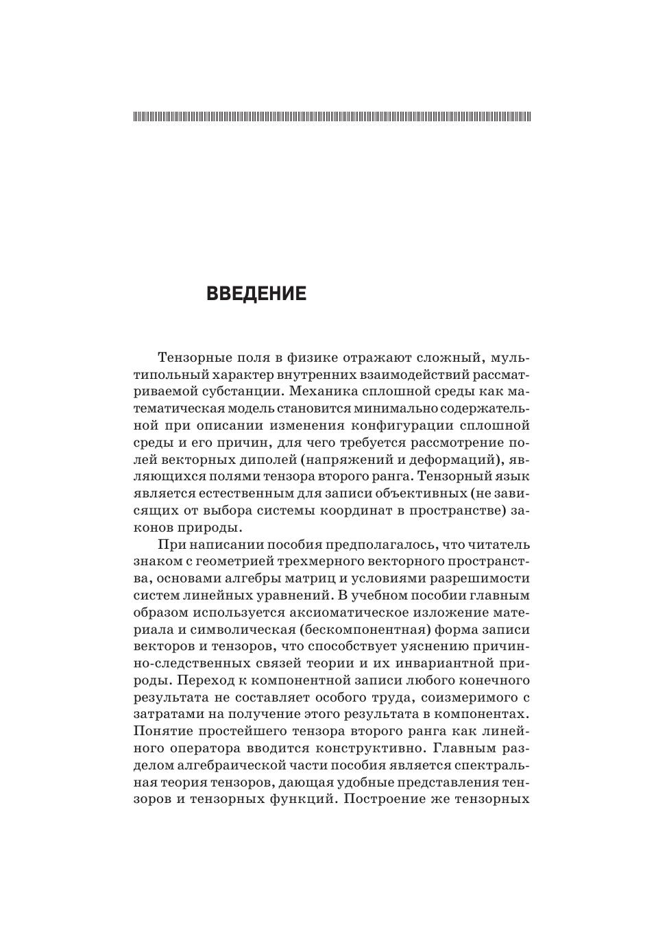 Последовательно определены векторные, тензорные и точечные пространства и операции над элементами этих пространств. Ряд утверждений доказывается в алгебраической форме, но достаточное внимание уделяется и компонентной записи. Рассмотрены спектральные свойства тензоров, тензорные функции и их производные по тензорному аргументу, тензорный анализ в трехмерном пространстве, а также на поверхностях и кривых. Дается достаточный математический аппарат для изложения дифференциальной геометрии, механики сплошной среды, физики, постановки связанных задач движения, диффузии, фазовых и химических превращений многокомпонентных сред с поверхностями разрыва. Имеются упражнения, примеры тестовых заданий и тем курсовых работ. Предназначено для студентов механико- и физико-математических направлений.