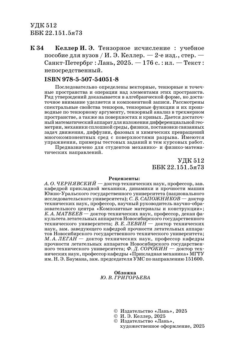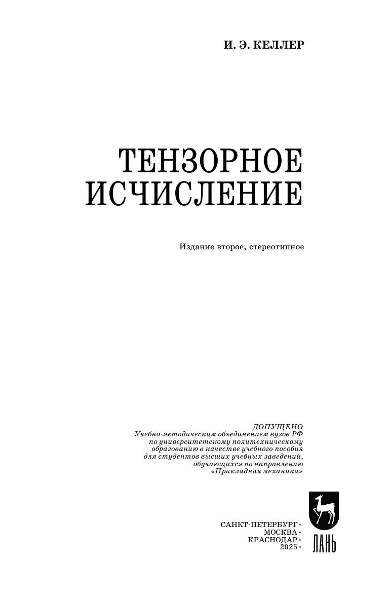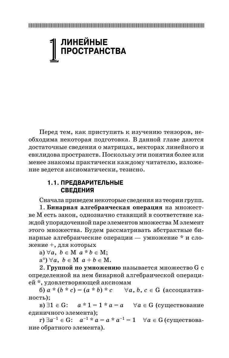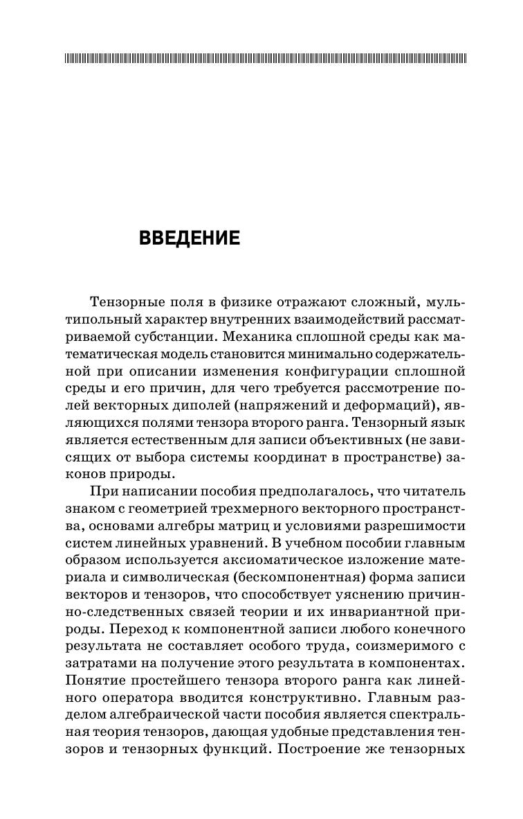 Последовательно определены векторные, тензорные и точечные пространства и операции над элементами этих пространств. Ряд утверждений доказывается в алгебраической форме, но достаточное внимание уделяется и компонентной записи. Рассмотрены спектральные свойства тензоров, тензорные функции и их производные по тензорному аргументу, тензорный анализ в трехмерном пространстве, а также на поверхностях и кривых. Дается достаточный математический аппарат для изложения дифференциальной геометрии, механики сплошной среды, физики, постановки связанных задач движения, диффузии, фазовых и химических превращений многокомпонентных сред с поверхностями разрыва. Имеются упражнения, примеры тестовых заданий и тем курсовых работ. Предназначено для студентов механико- и физико-математических направлений.