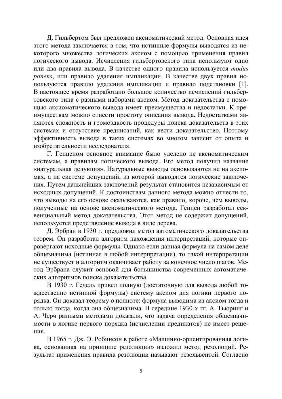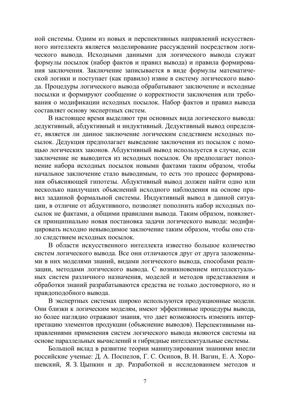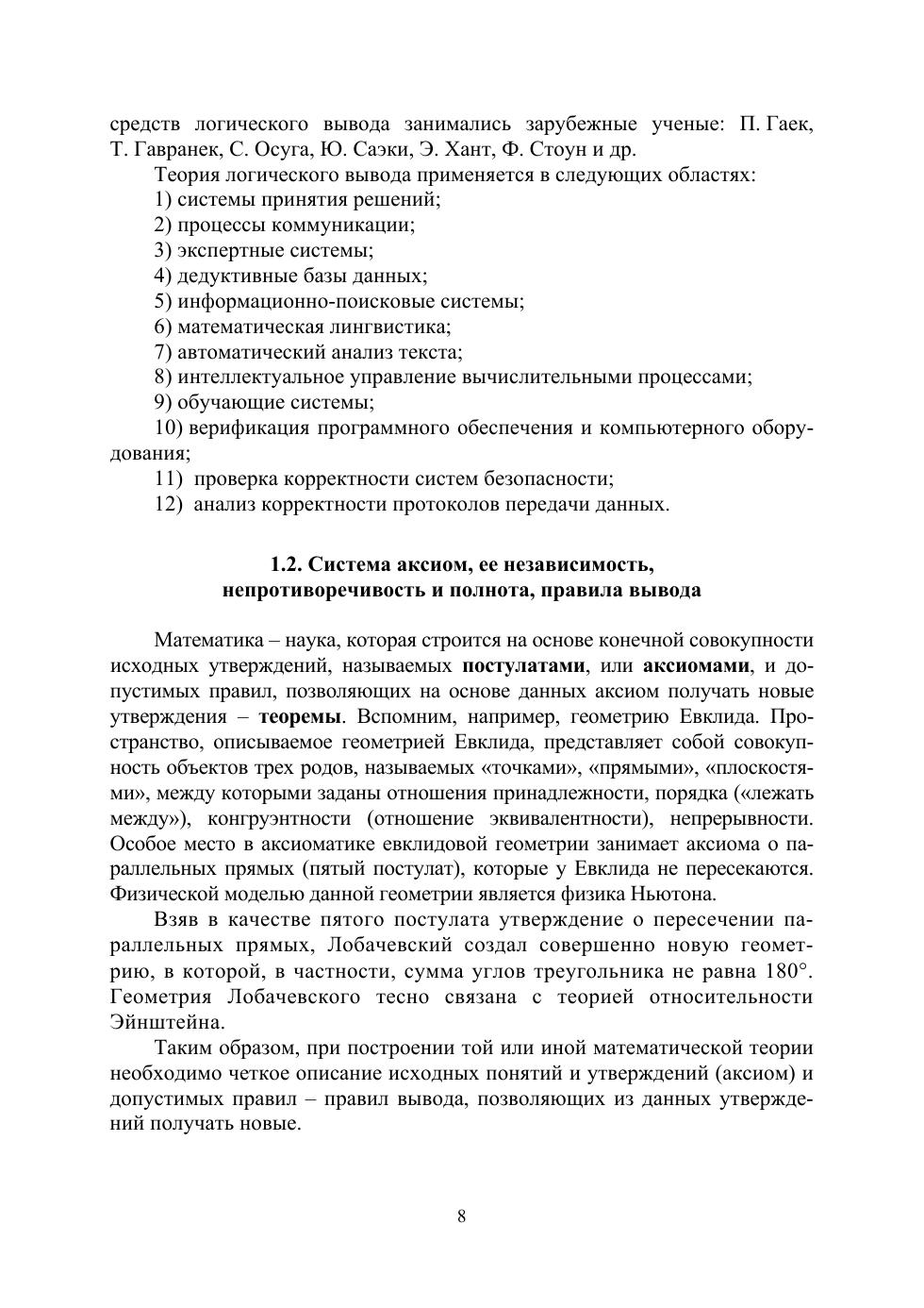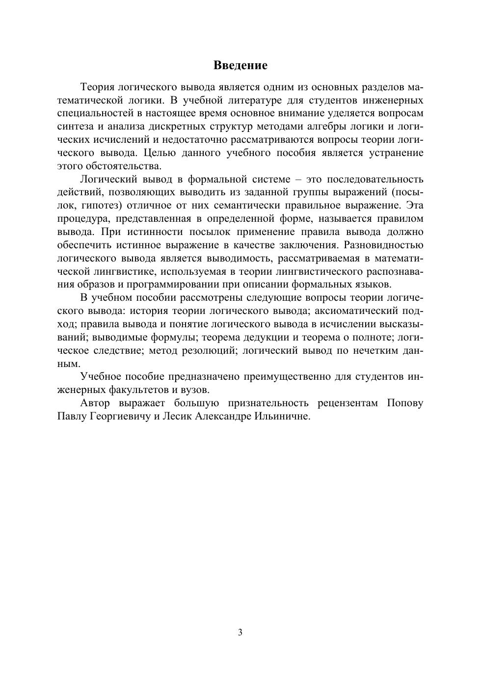 Рассмотрены вопросы теории логического вывода: история теории логического вывода, аксиоматический метод Д. Гильберта, выводимость в исчислении высказываний, метод резолюций, логический вывод по нечетким данным.