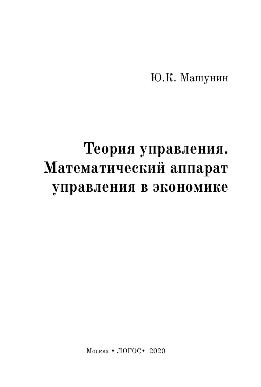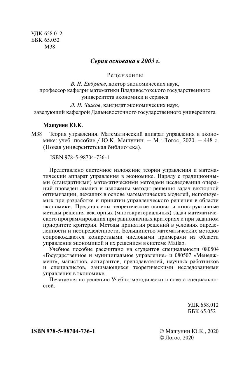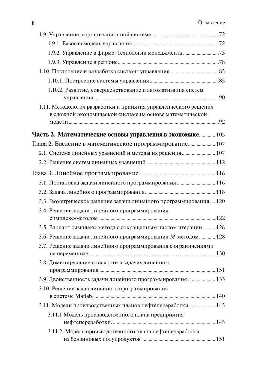 Представлено системное изложение теории управления и математический аппарат управления в экономике. Наряду с традиционными (стандартными) математическими методами исследования операций проведен анализ и изложены методы решения задач векторной оптимизации, лежащих в основе математических моделей, используемых при разработке и принятии управленческого решения в области экономики. Представлены теоретические основы и конструктивные методы решения векторных (многокритериальных) задач математического программирования при равнозначных критериях и при заданном приоритете критерия. Методы принятия решений в условиях определенности и неопределенности. Большинство математических методов сопровождаются конкретными числовыми примерами из области управления экономикой и их решением в системе Matlab. Учебное пособие рассчитано на студентов специальности 080504 «Государственное и муниципальное управление» и 080507 «Менеджмент», магистров, аспирантов, преподавателей, научных работников и специалистов, занимающихся теоретическими исследованиями управления в экономике. Печатается по решению Учебно-методического совета специальностей.