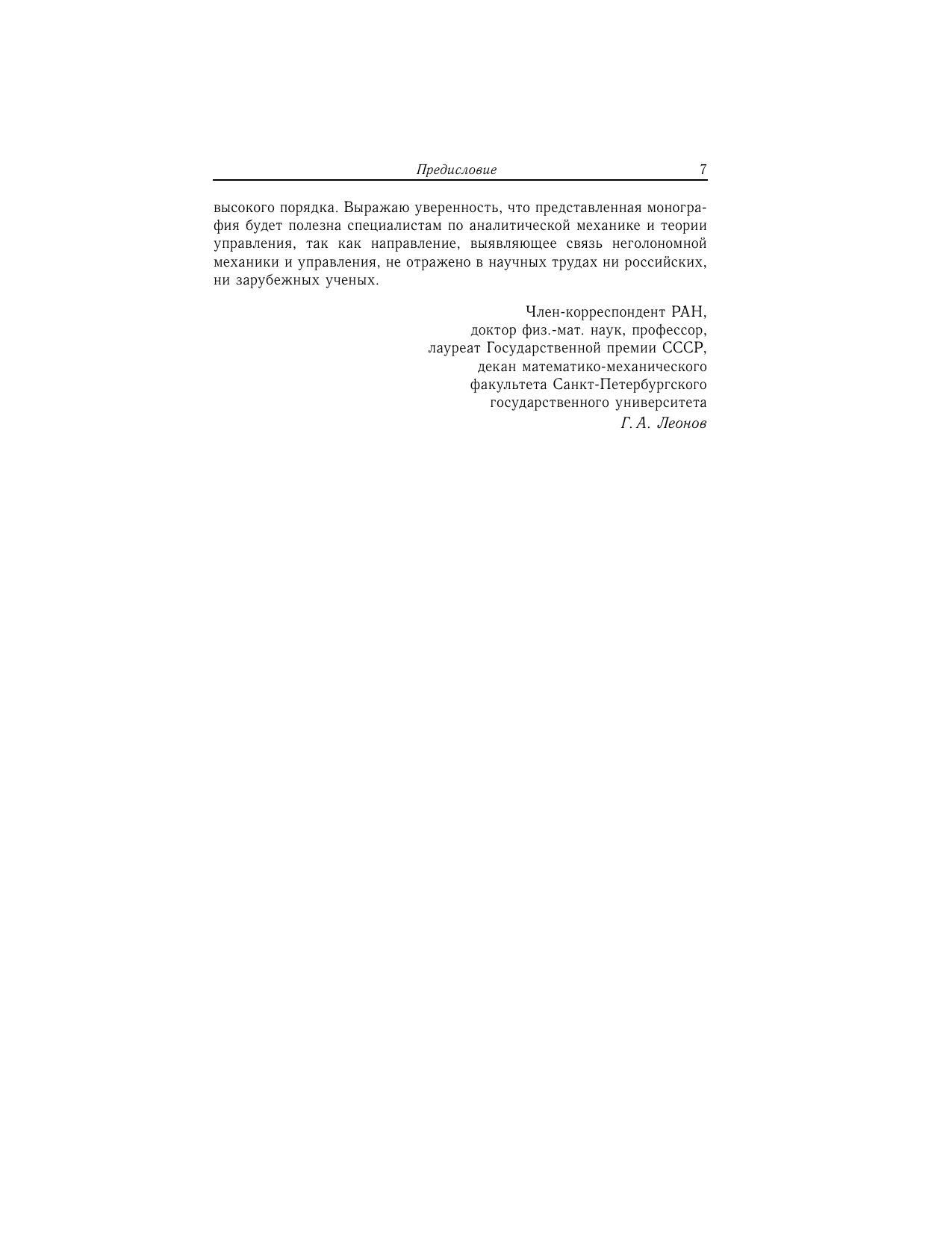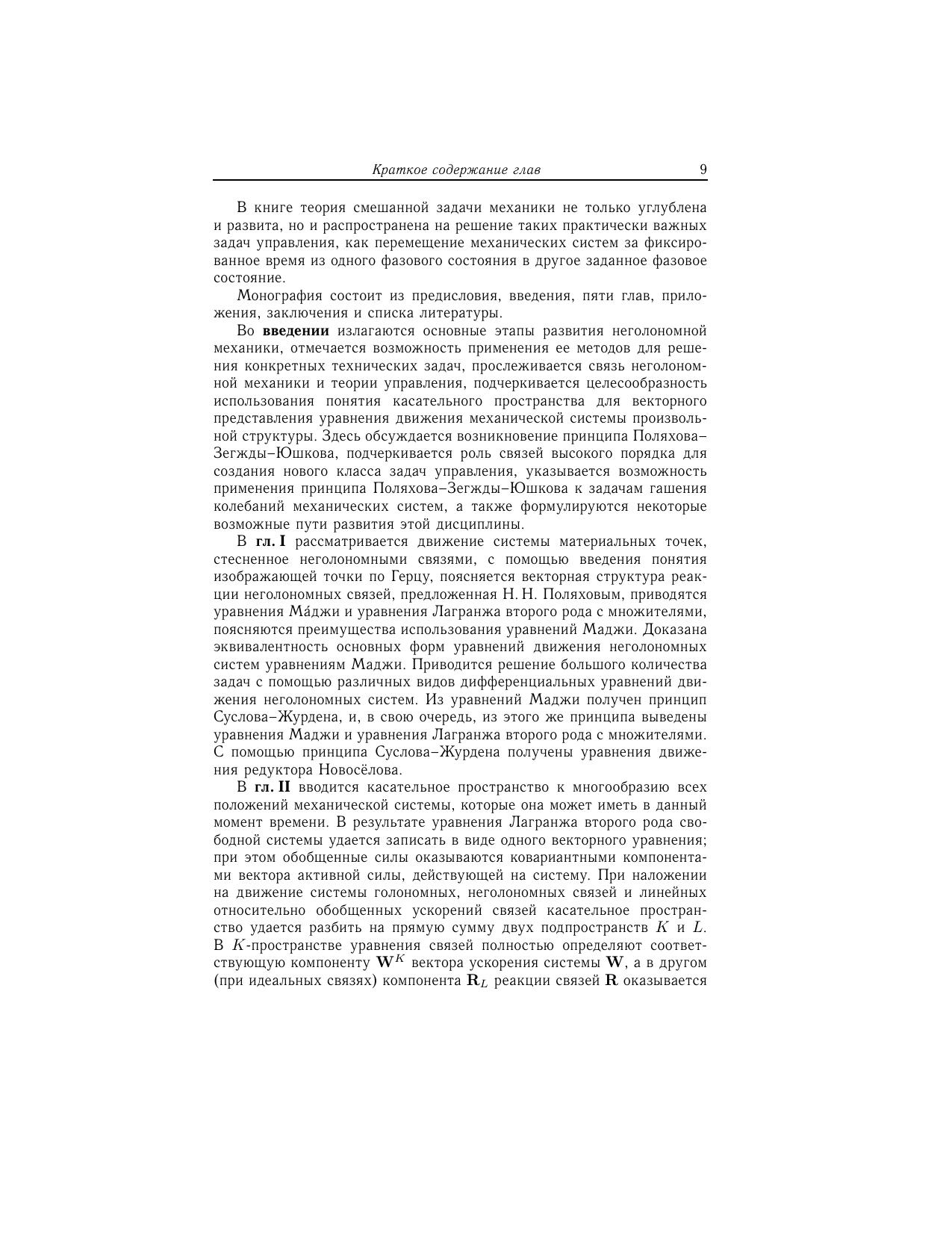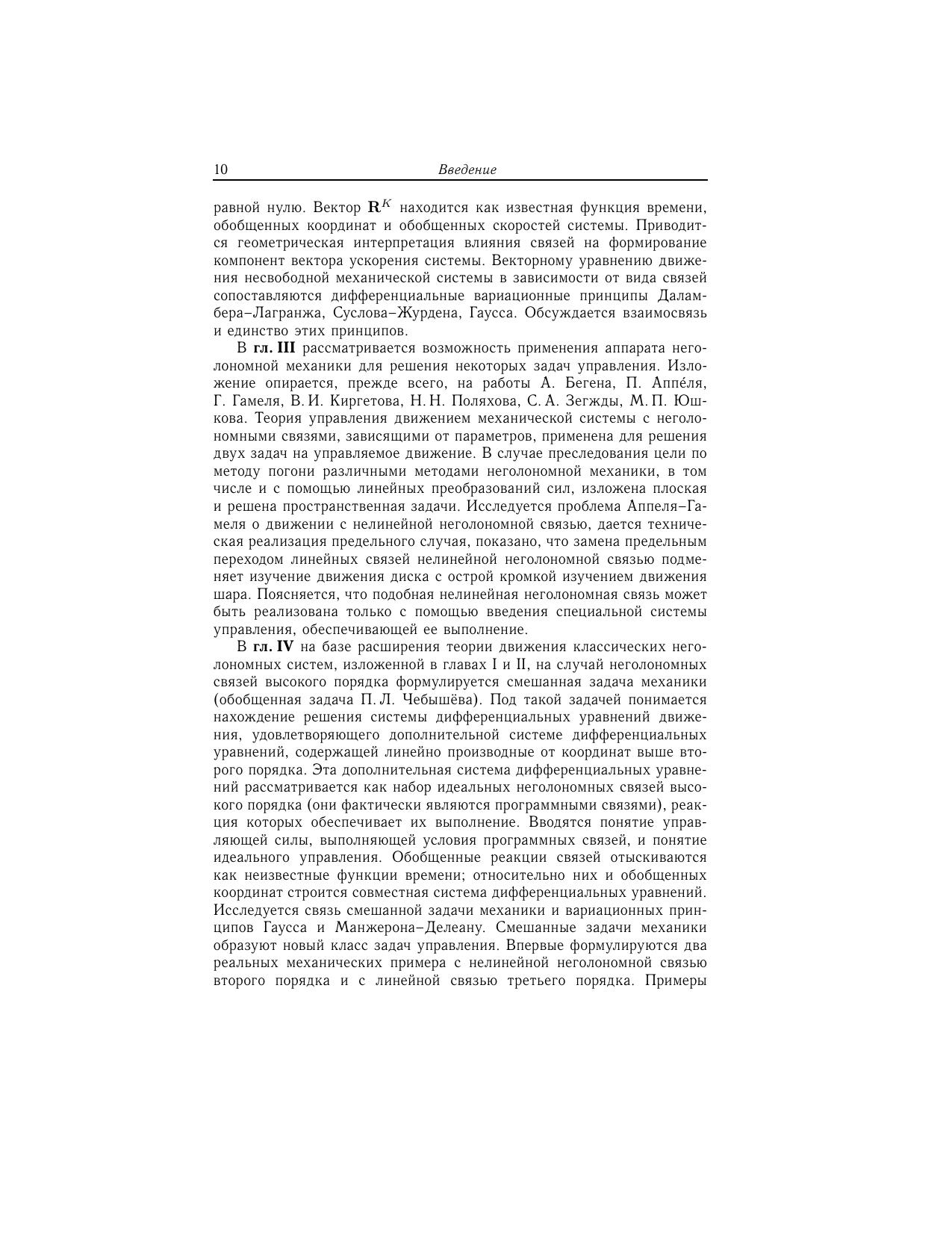Книга посвящена исследованию неголономных систем со связями высокого порядка. Использован математический аппарат, в котором базовыми являются понятия изображающей точки по Герцу и касательного пространства к многообразию всех возможных положений механической системы в данный момент времени, что позволяет с единых позиций рассматривать общие вопросы неголономной механики систем материальных точек и произвольной механической системы. Показано, что математический аппарат, развитый при разработке классической теории движения неголономных систем со связями любого порядка, может быть использован и при исследовании ряда задач теории управления. Для специалистов по аналитической механике.