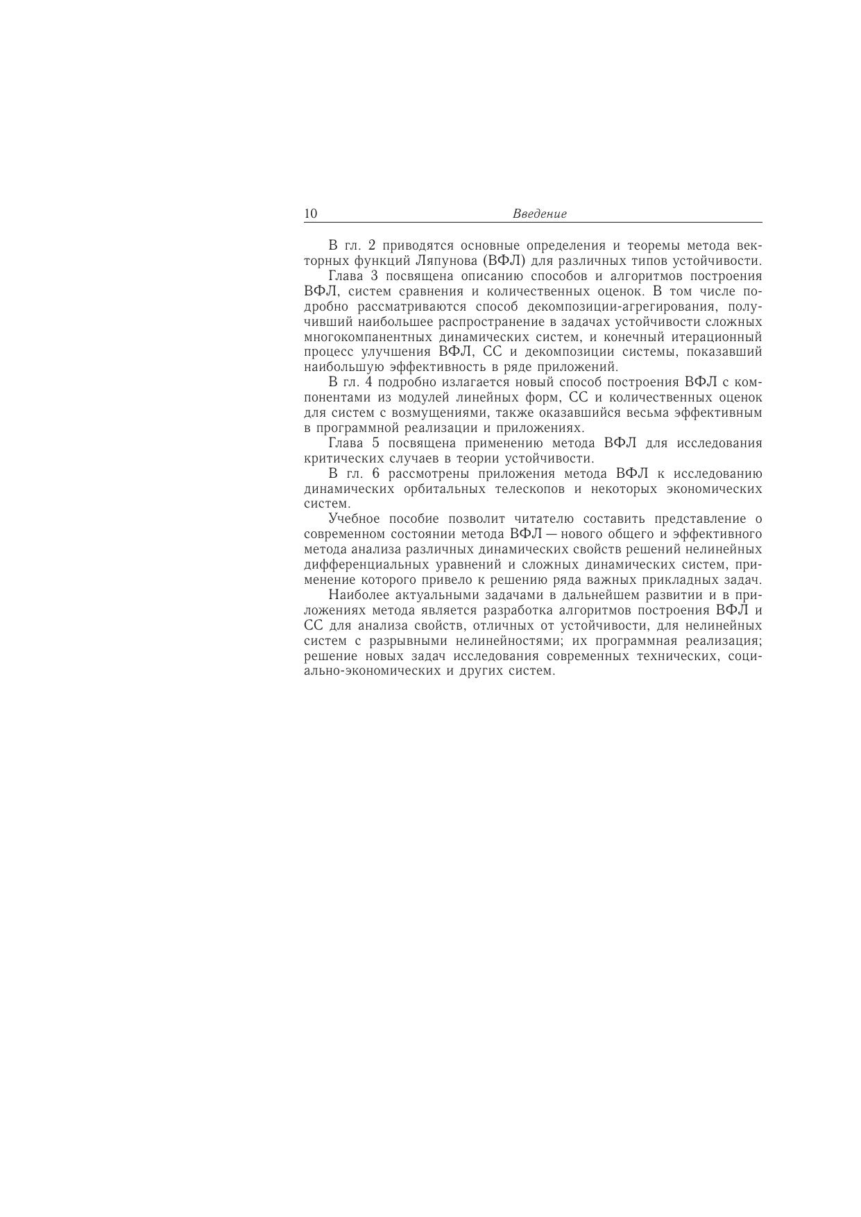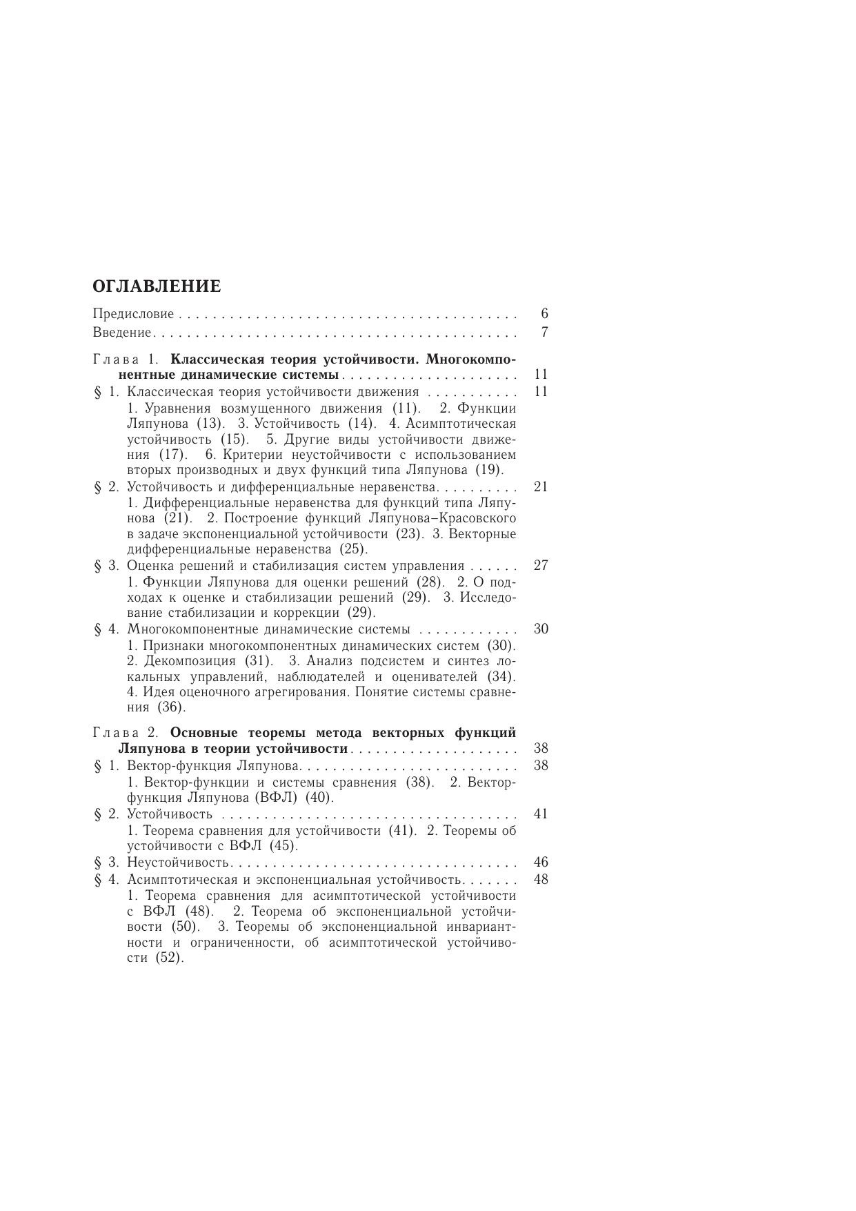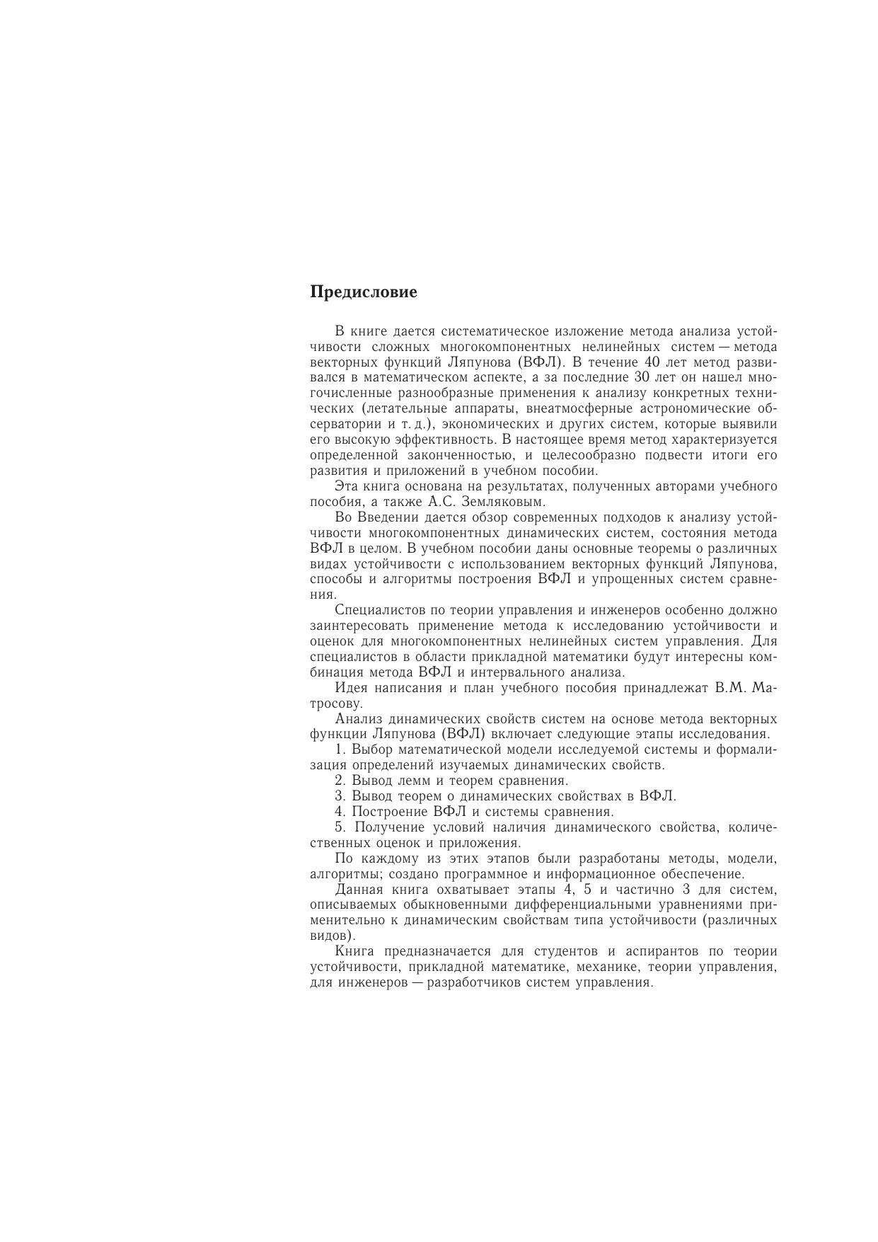 Дается сиcтематическое изложение нового метода анализа устойчивости нелинейных сложных систем - метода векторных функций Ляпунова (ВФЛ), созданного в течение последних сорока лет и нашедшего эффективные приложения в различных областях. Наибольшее внимание уделяется способам и алгоритмам построения ВФЛ, упрощенных систем сравнения, количественных оценок отклонений и возмущений, а также параметрическому анализу и приложениям, разработанным авторами и их сотрудниками. Для студентов технических университетов, специализирующихся по прикладной математике, теории управления, динамике и управлению летательными аппаратами.