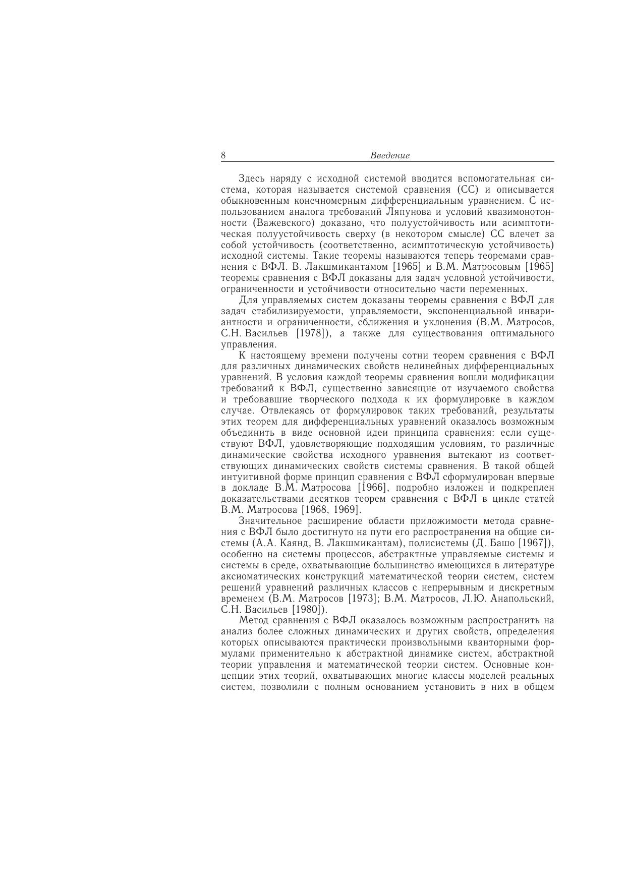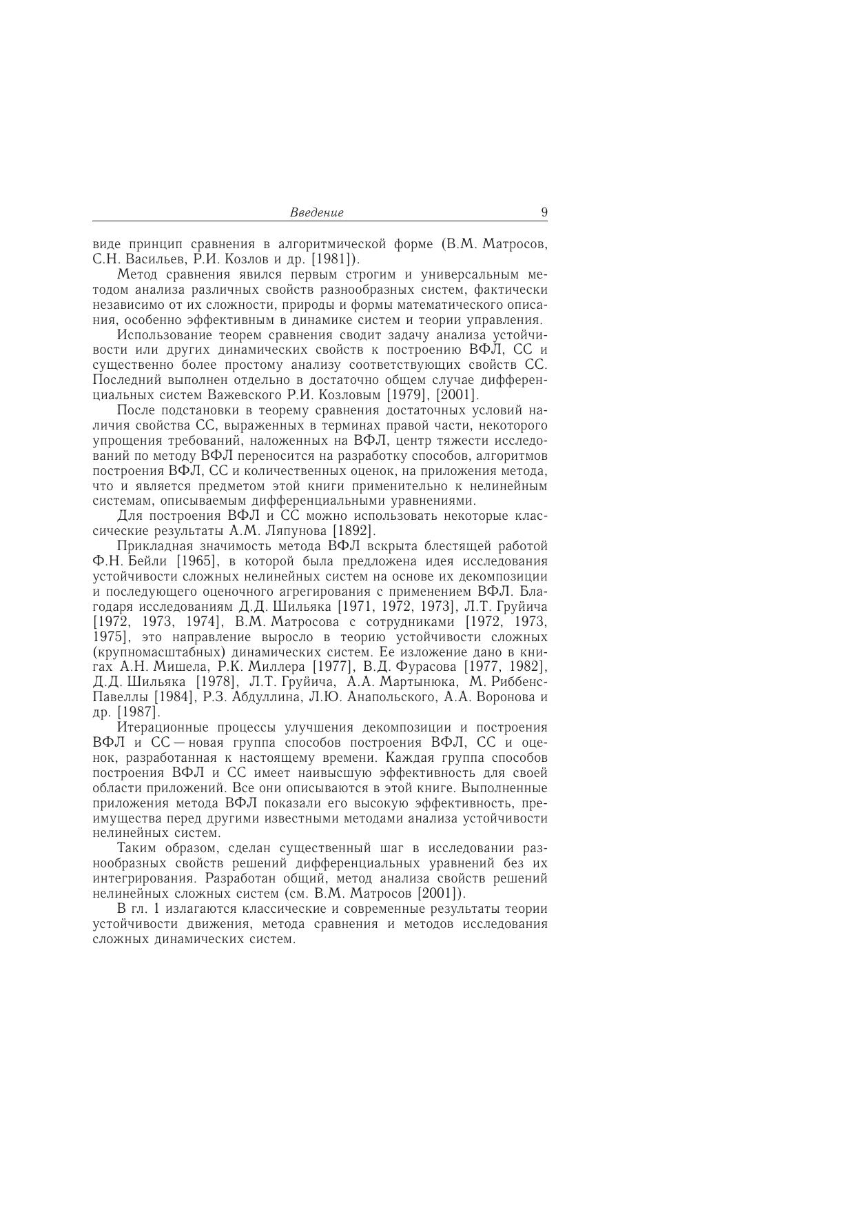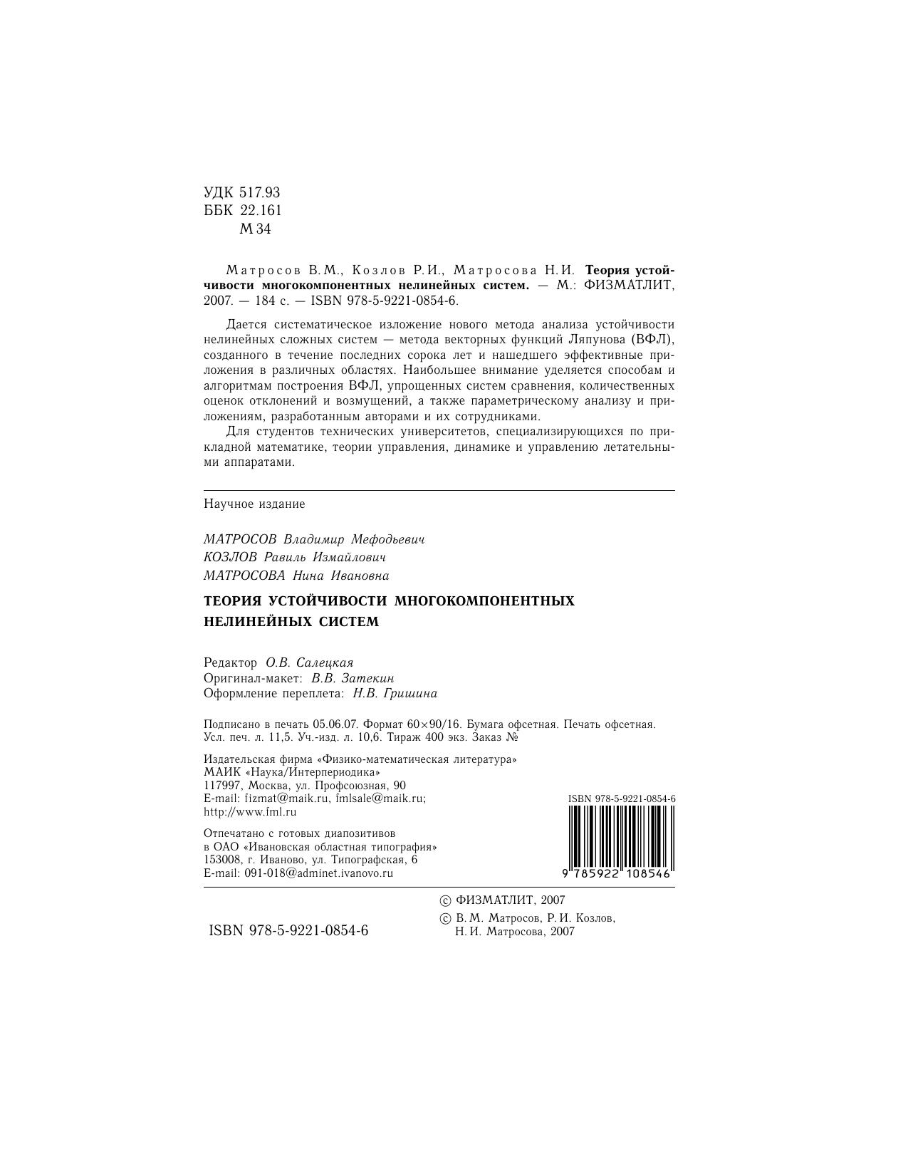 Дается сиcтематическое изложение нового метода анализа устойчивости нелинейных сложных систем - метода векторных функций Ляпунова (ВФЛ), созданного в течение последних сорока лет и нашедшего эффективные приложения в различных областях. Наибольшее внимание уделяется способам и алгоритмам построения ВФЛ, упрощенных систем сравнения, количественных оценок отклонений и возмущений, а также параметрическому анализу и приложениям, разработанным авторами и их сотрудниками. Для студентов технических университетов, специализирующихся по прикладной математике, теории управления, динамике и управлению летательными аппаратами.