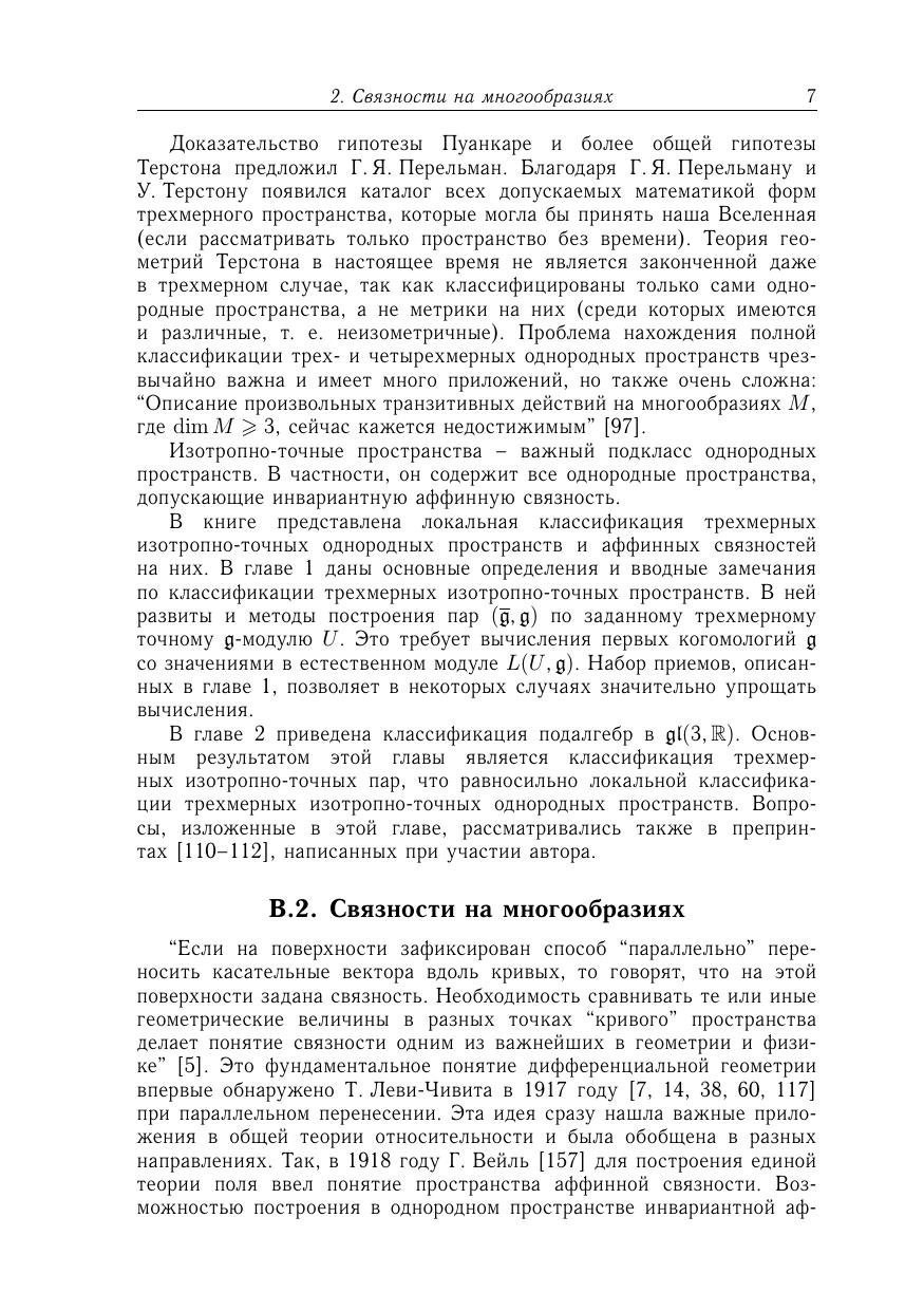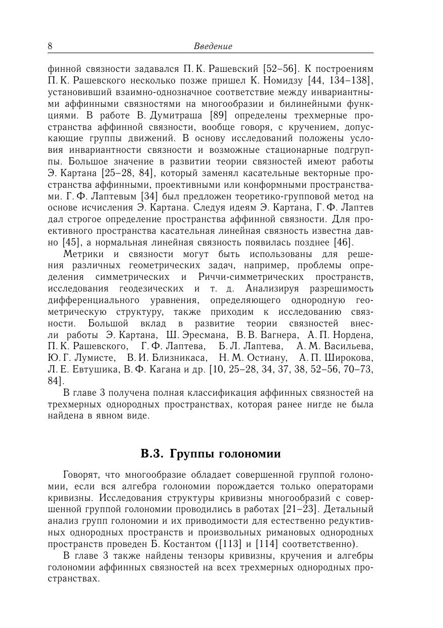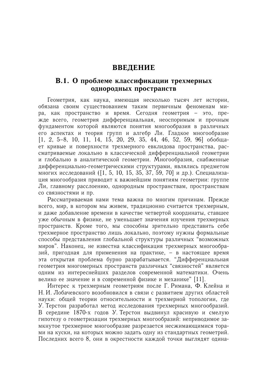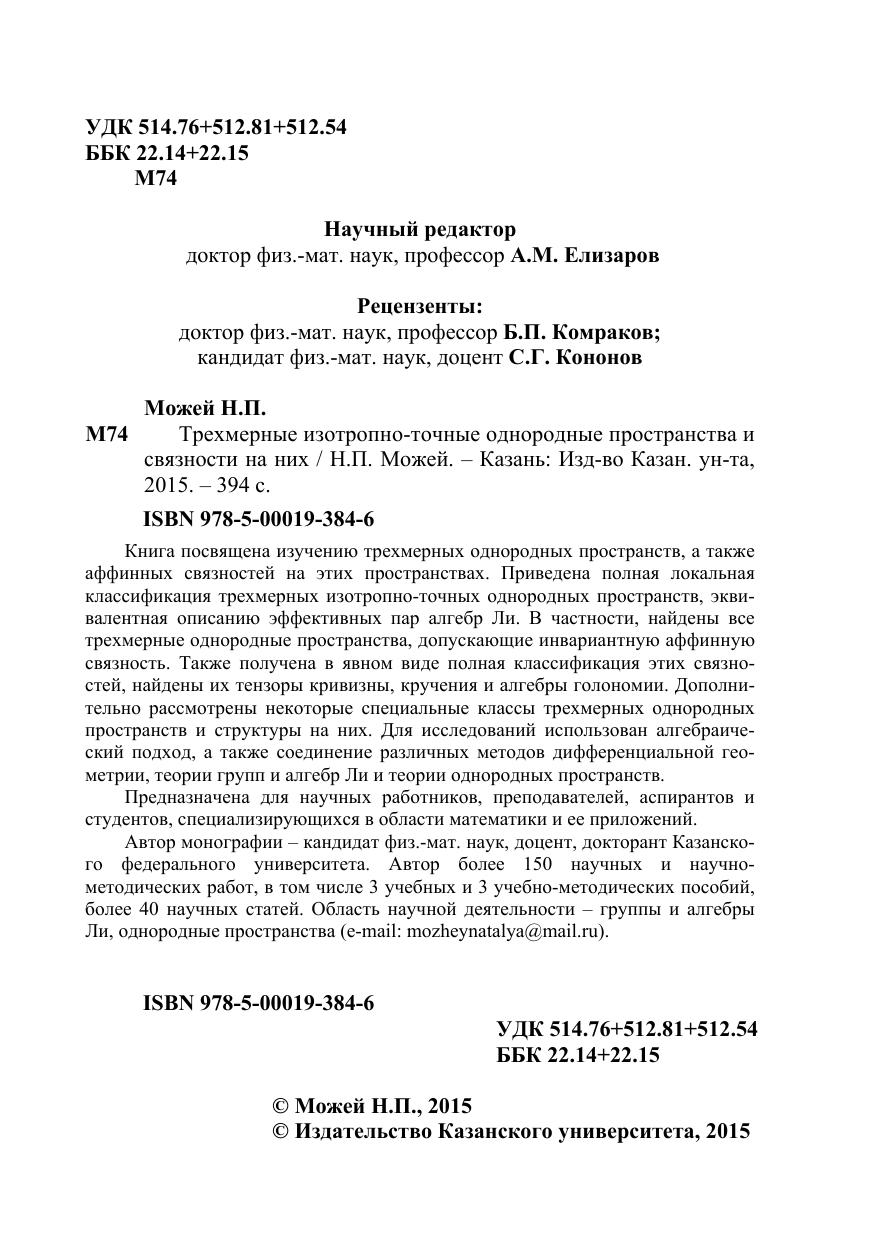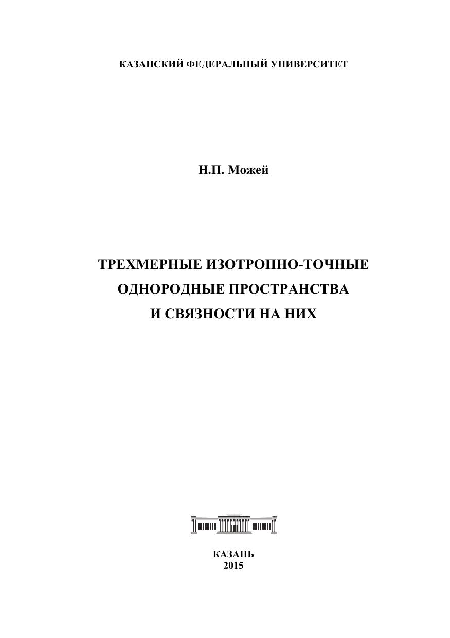 Книга посвящена изучению трехмерных однородных пространств, а также аффинных связностей на этих пространствах. Приведена полная локальная классификация трехмерных изотропно-точных однородных пространств, эквивалентная описанию эффективных пар алгебр Ли. В частности, найдены все трехмерные однородные пространства, допускающие инвариантную аффинную связность. Также получена в явном виде полная классификация этих связностей, найдены их тензоры кривизны, кручения и алгебры голономии. Дополнительно рассмотрены некоторые специальные классы трехмерных однородных пространств и структуры на них. Для исследований использован алгебраический подход, а также соединение различных методов дифференциальной геометрии, теории групп и алгебр Ли и теории однородных пространств. Предназначена для научных работников, преподавателей, аспирантов и студентов, специализирующихся в области математики и ее приложений.