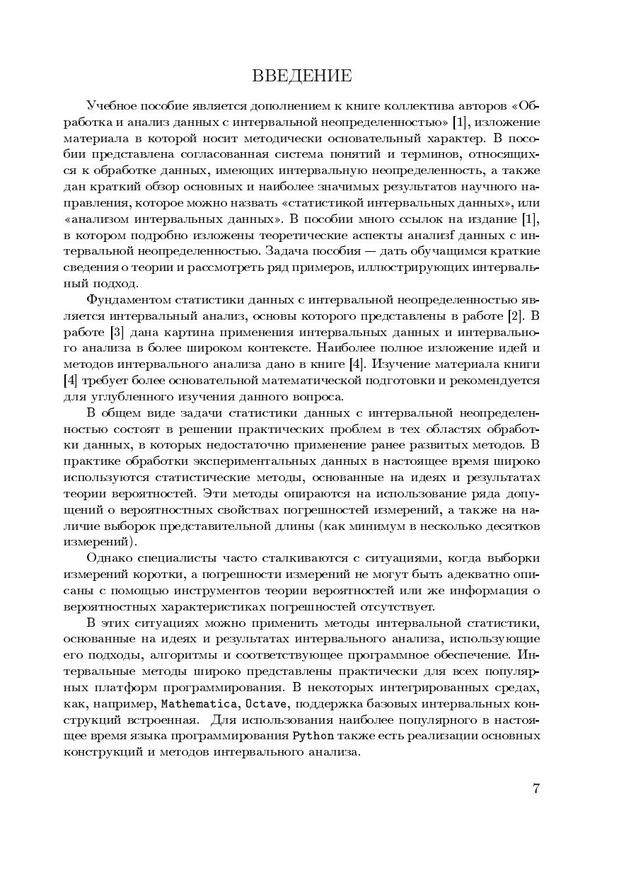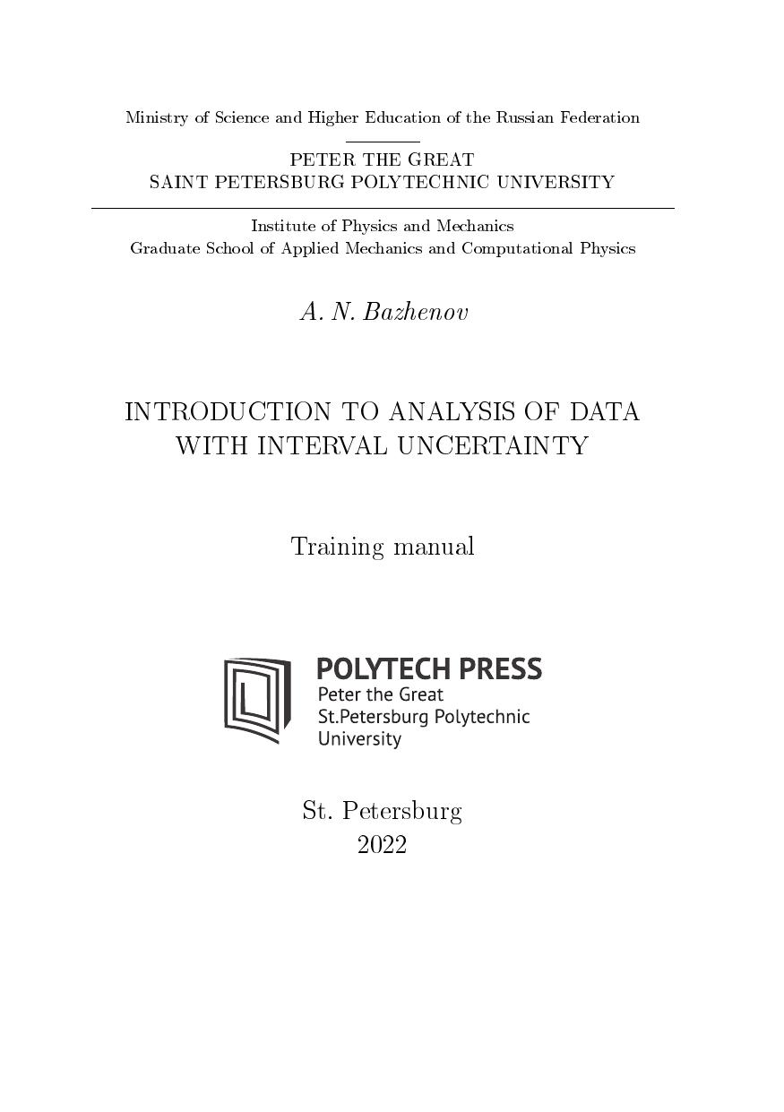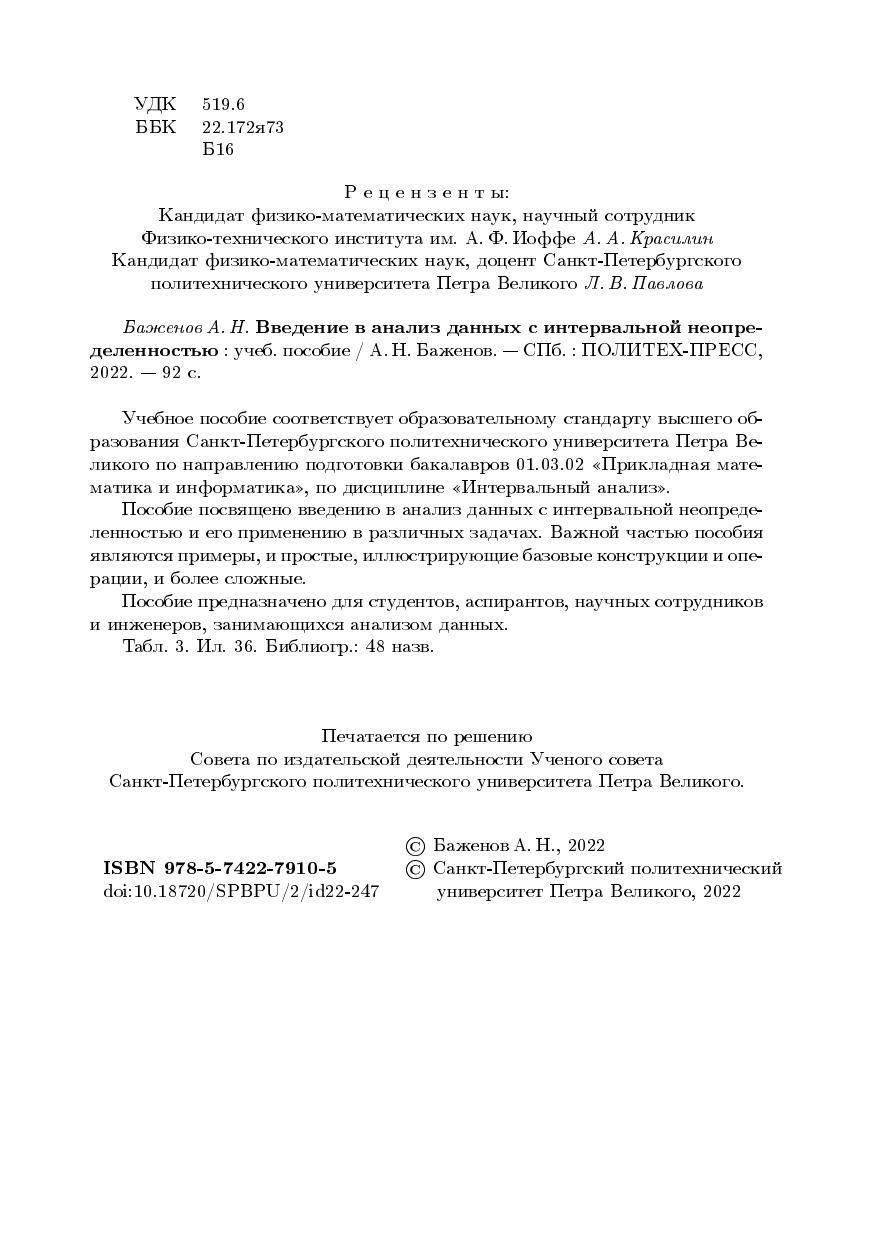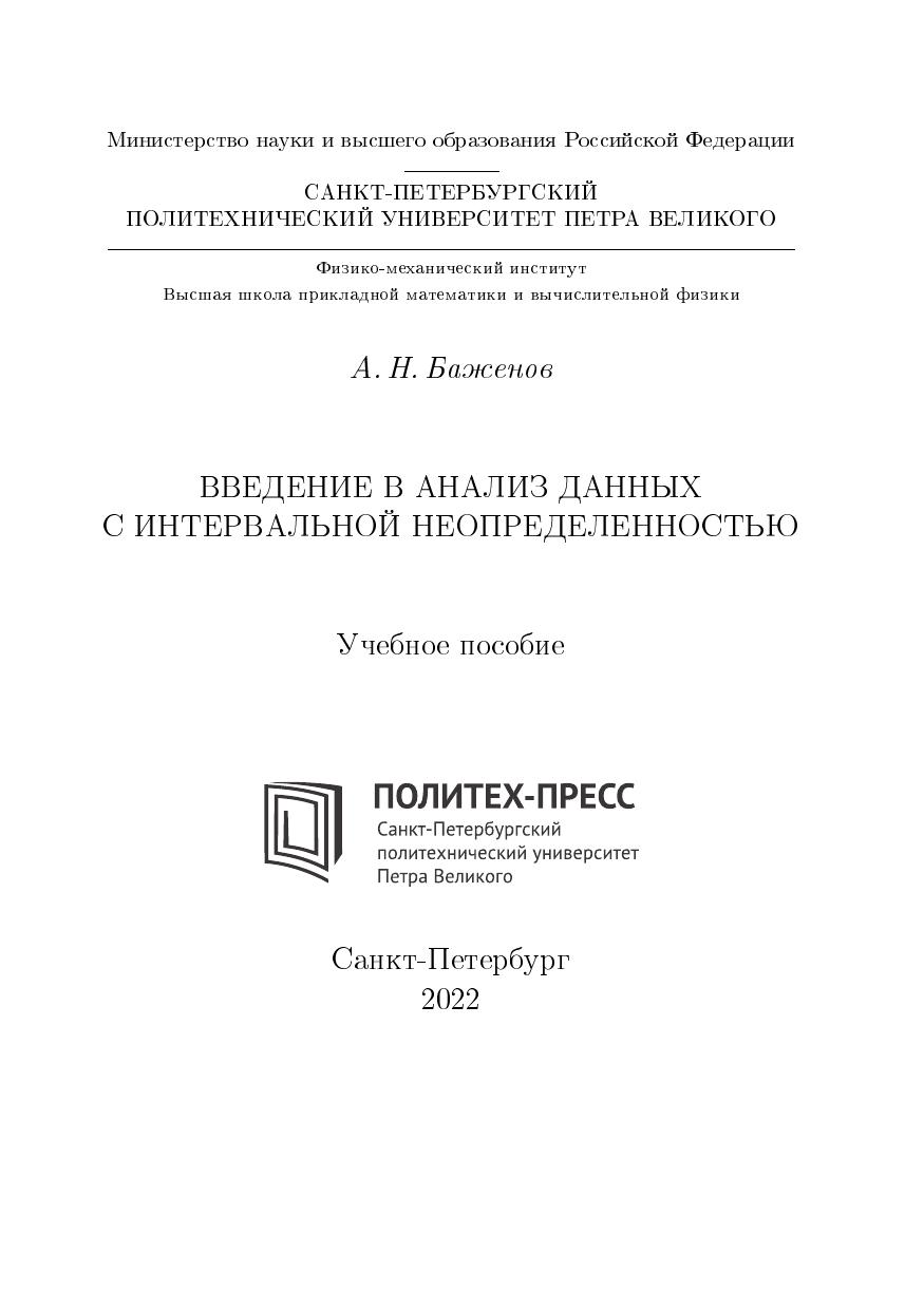 Учебное пособие соответствует образовательному стандарту высшего образования Санкт-Петербургского политехнического университета Петра Великого по направлению подготовки бакалавров 01.03.02 «Прикладная математика и информатика», по дисциплине «Интервальный анализ». Пособие посвящено введению в анализ данных с интервальной неопределенностью и его применению в различных задачах. Важной частью пособия являются примеры, и простые, иллюстрирующие базовые конструкции и операции, и более сложные. Пособие предназначено для студентов, аспирантов, научных сотрудников и инженеров, занимающихся анализом данных.