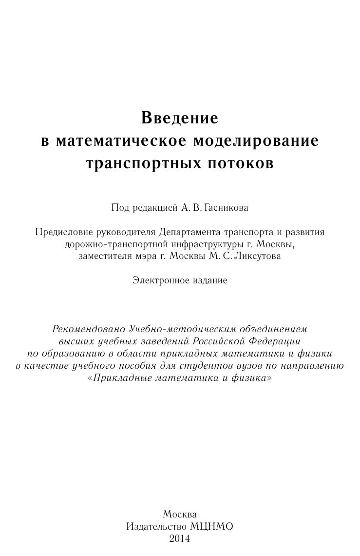 В книге излагается математический аппарат и некоторые физические концепции, которые могут пригодиться при создании (модернизации) интеллектуальной транспортной системы (ИТС). Первое издание вышло в 2010 году в издательстве МФТИ. В настоящее второе издание среди прочего были добавлены материалы практического характера от компаний «А+С Консалт» (PTV Vision r), «Яндекс.Пробки». Предназначено для студентов старших курсов и аспирантов физико-математических специальностей (МФТИ, НМУ, МГУ, МГТУ, ВШЭ). Рекомендуется научным работникам, интересующимся вопросами математического моделирования.