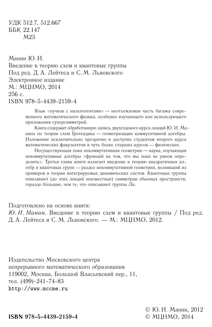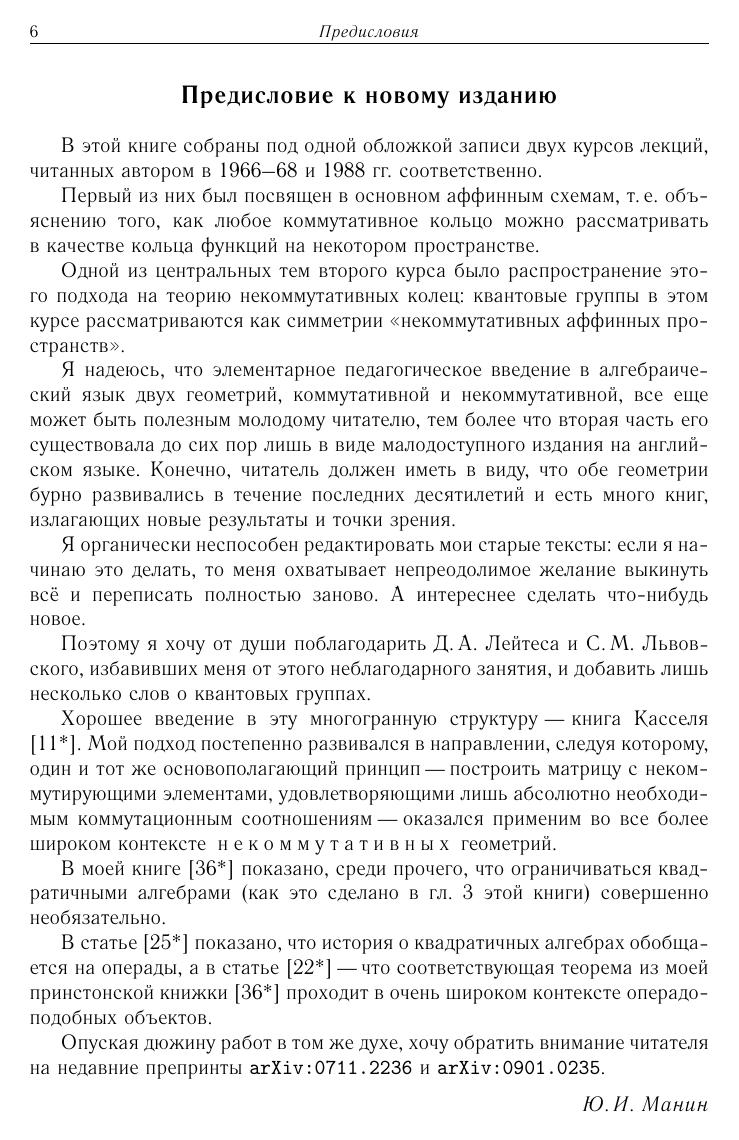 Язык «пучков с нильпотентами» — неотъемлемая часть багажа современного математического физика, особенно изучающего или использующего приложения суперсимметрий. Книгасодержит обработанную запись двухгодового курса лекций Ю.И. Манина по теории схем Гротендика — геометризации коммутативной алгебры. Изложение исключительно прозрачно и доступно студентам второго курса математических факультетов и чуть более старших курсов — физических. Несуществующая пока некоммутативная геометрия— наука, изучающая некоммутативные алгебры «функций на том, что мы пока не умеем определить». Третья глава книги излагает введение в теорию квадратичных алгебр и квантовых групп — раздел некоммутативной геометрии, возникший из примеров и теории интегрируемых динамических систем. Квантовые группы описывают (до этих лекций неизвестные) симметрии обычных пространств, гораздо большие, чем те, что описывают группы Ли.
