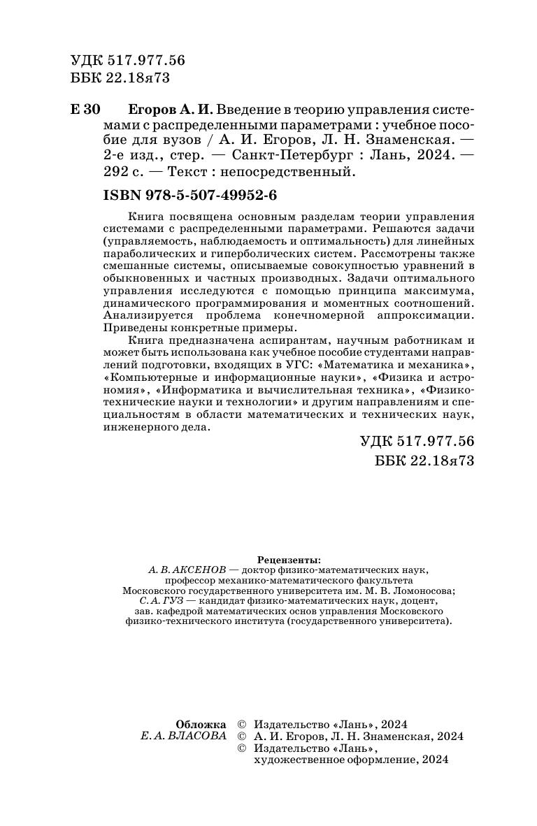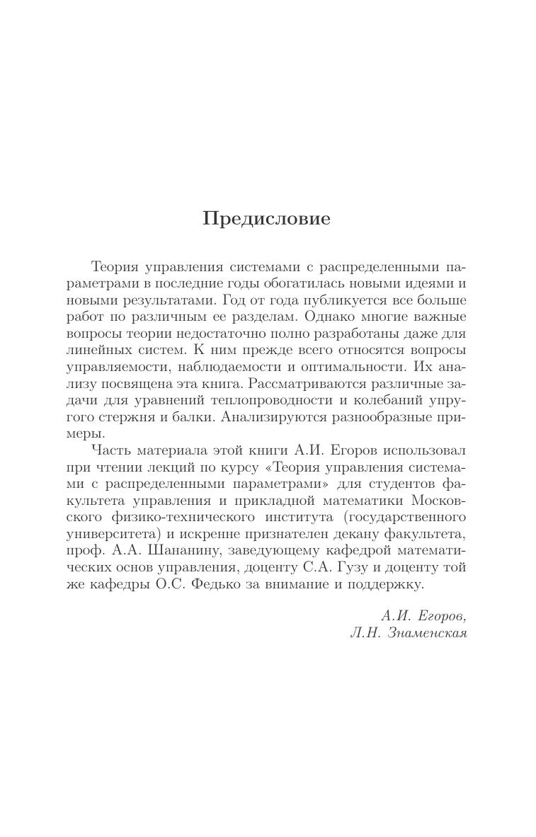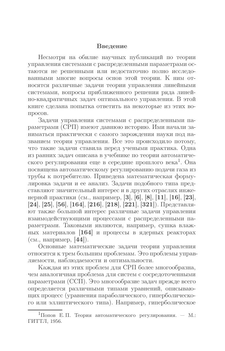 Книга посвящена основным разделам теории управления системами с распределенными параметрами. Решаются задачи (управляемость, наблюдаемость и оптимальность) для линейных параболических и гиперболических систем. Рассмотрены также смешанные системы, описываемые совокупностью уравнений в обыкновенных и частных производных. Задачи оптимального управления исследуются с помощью принципа максимума, динамического программирования и моментных соотношений. Анализируется проблема конечномерной аппроксимации. Приведены конкретные примеры. Книга предназначена аспирантам, научным работникам и может быть использована как учебное пособие студентами направлений подготовки, входящих в УГС: «Математика и механика», «Компьютерные и информационные науки», «Физика и астрономия», «Информатика и вычислительная техника», «Физико-технические науки и технологии», и другим направлениям и специальностям в области математических и технических наук, инженерного дела.